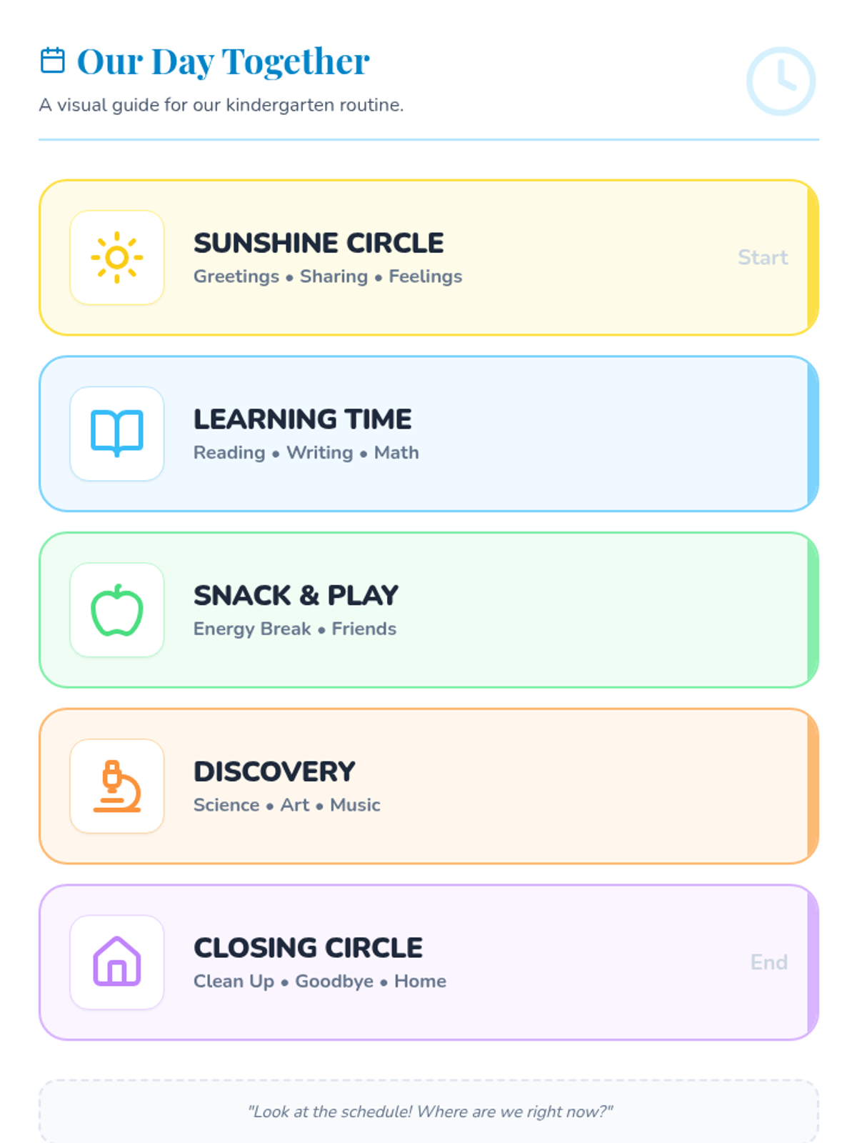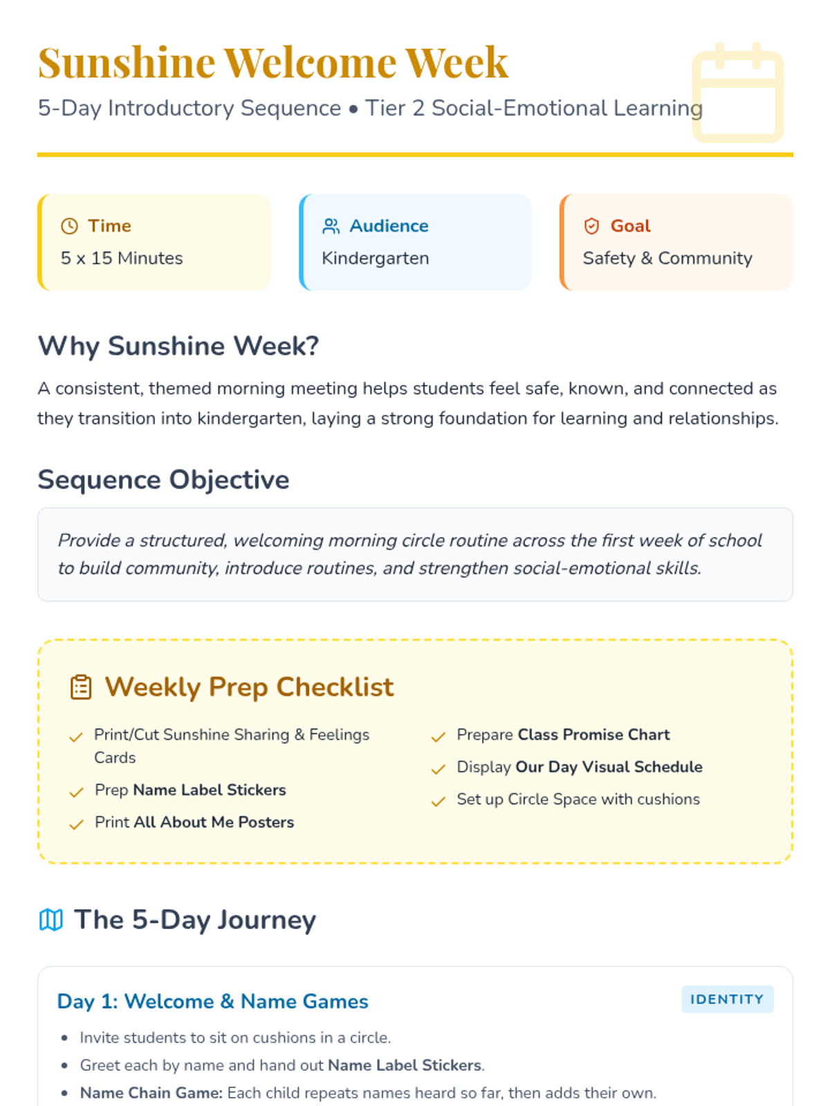 A Tier 2 social-emotional learning sequence for kindergarteners, using a daily morning meeting routine to build belonging, communication, and emotional literacy during the first week of school and beyond.