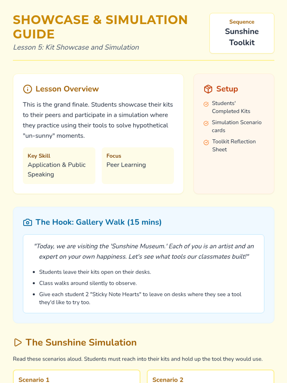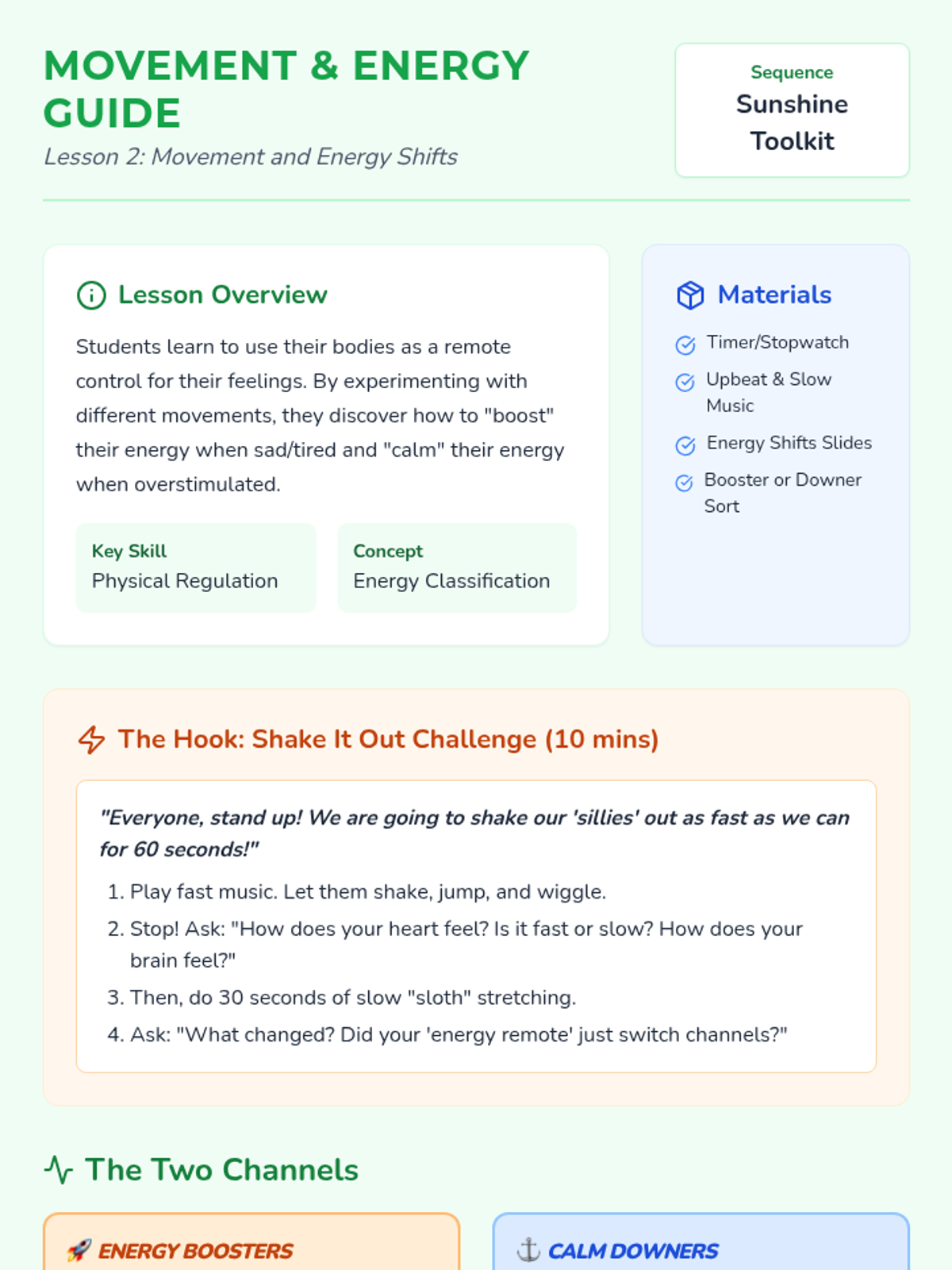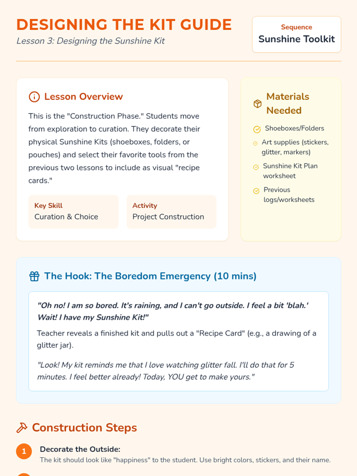 A project-based sequence for 1st graders focused on emotional regulation through the creation of a 'Sunshine Kit'. Students explore sensory, physical, and social activities to build a personalized toolkit of positive experiences for use during challenging moments.