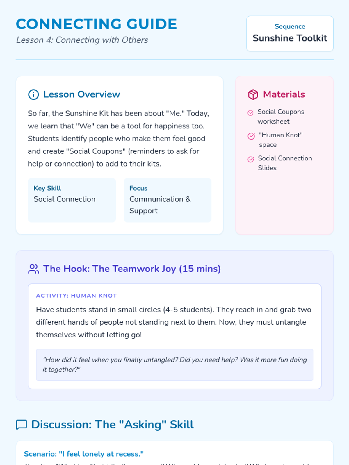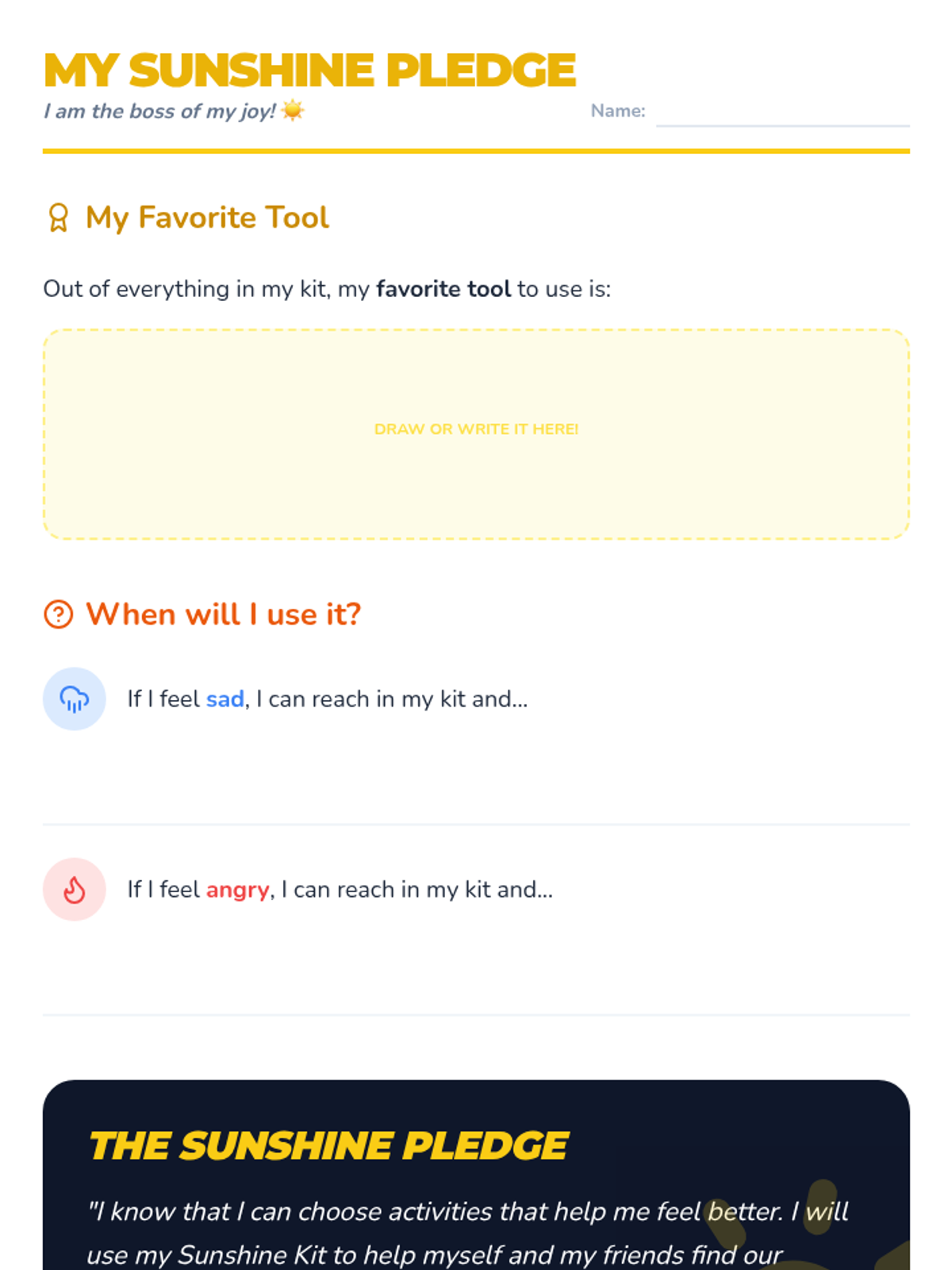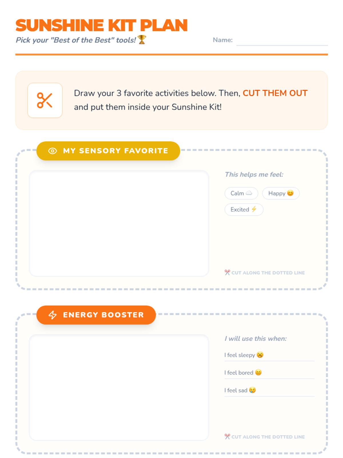 A project-based sequence for 1st graders focused on emotional regulation through the creation of a 'Sunshine Kit'. Students explore sensory, physical, and social activities to build a personalized toolkit of positive experiences for use during challenging moments.