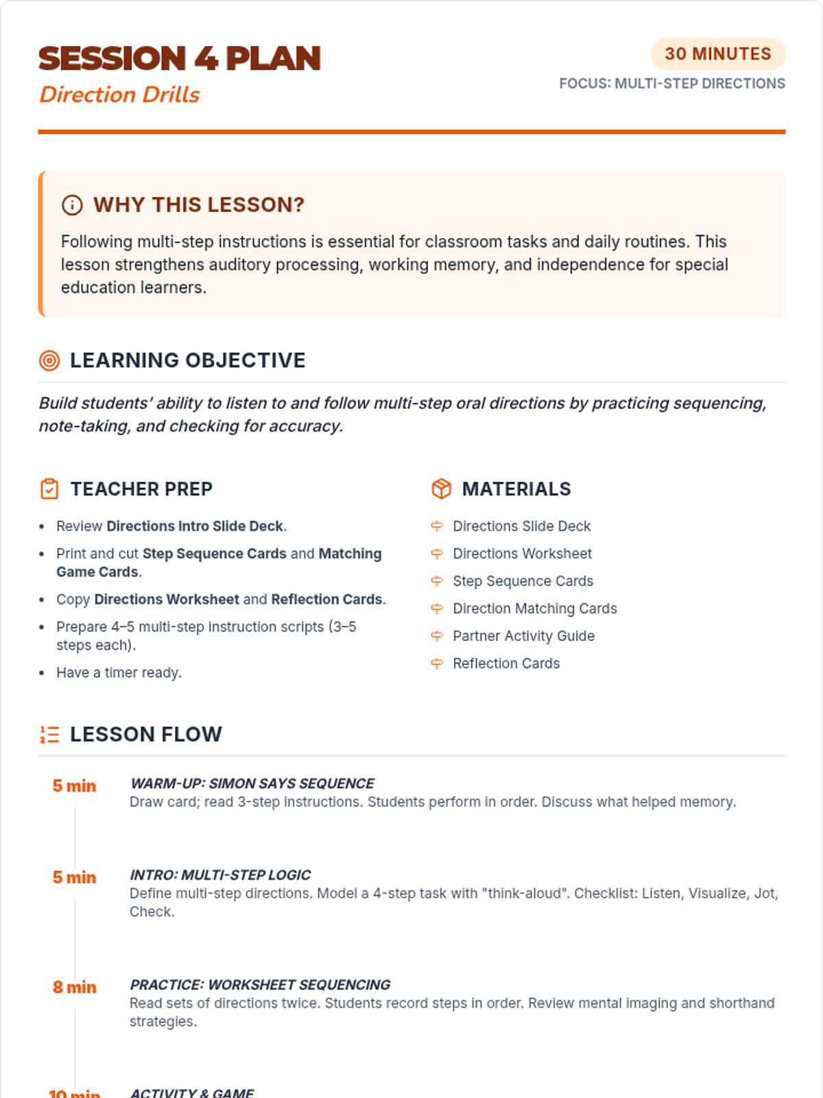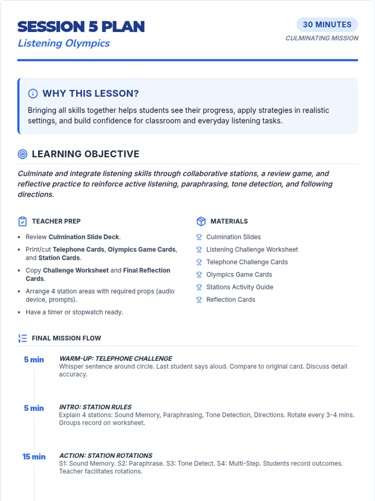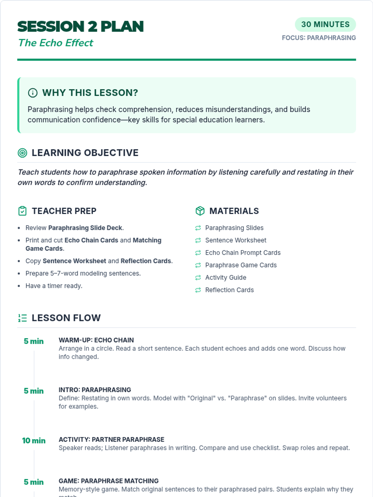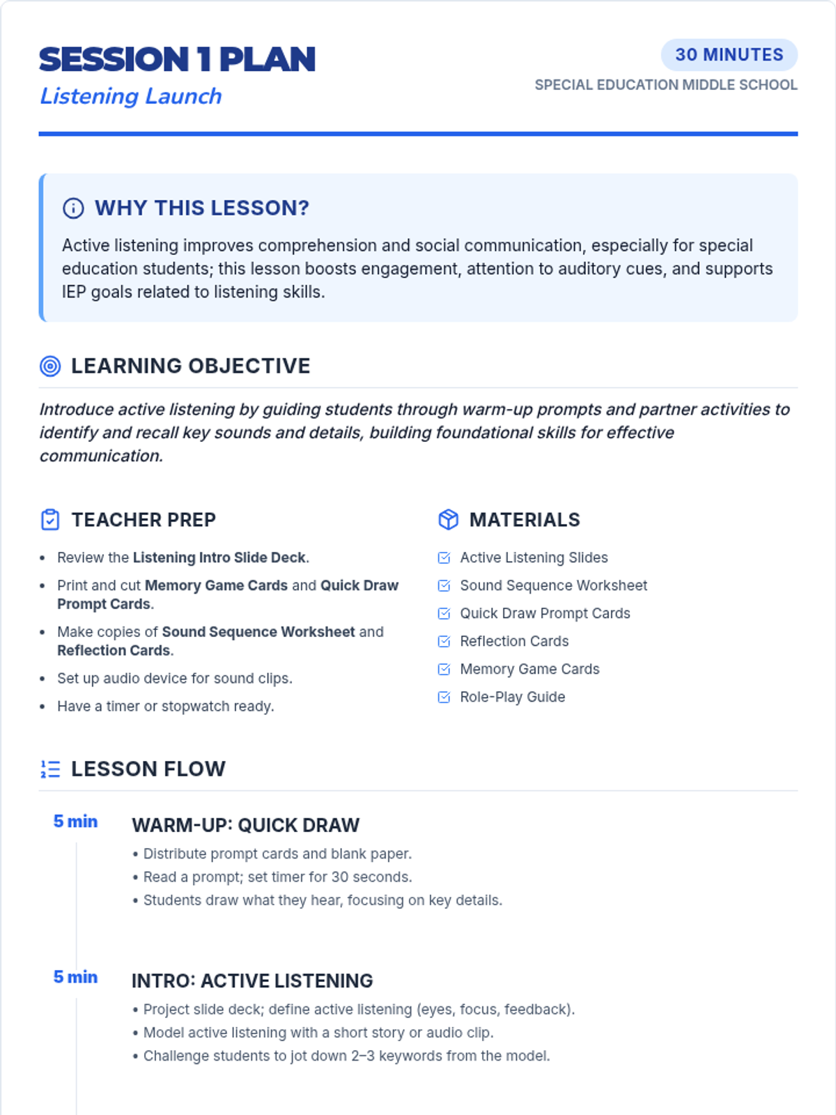 A 5-session unit for middle school special education students to build key listening skills, including active listening, paraphrasing, tone detection, and following multi-step directions through interactive games and structured practice.