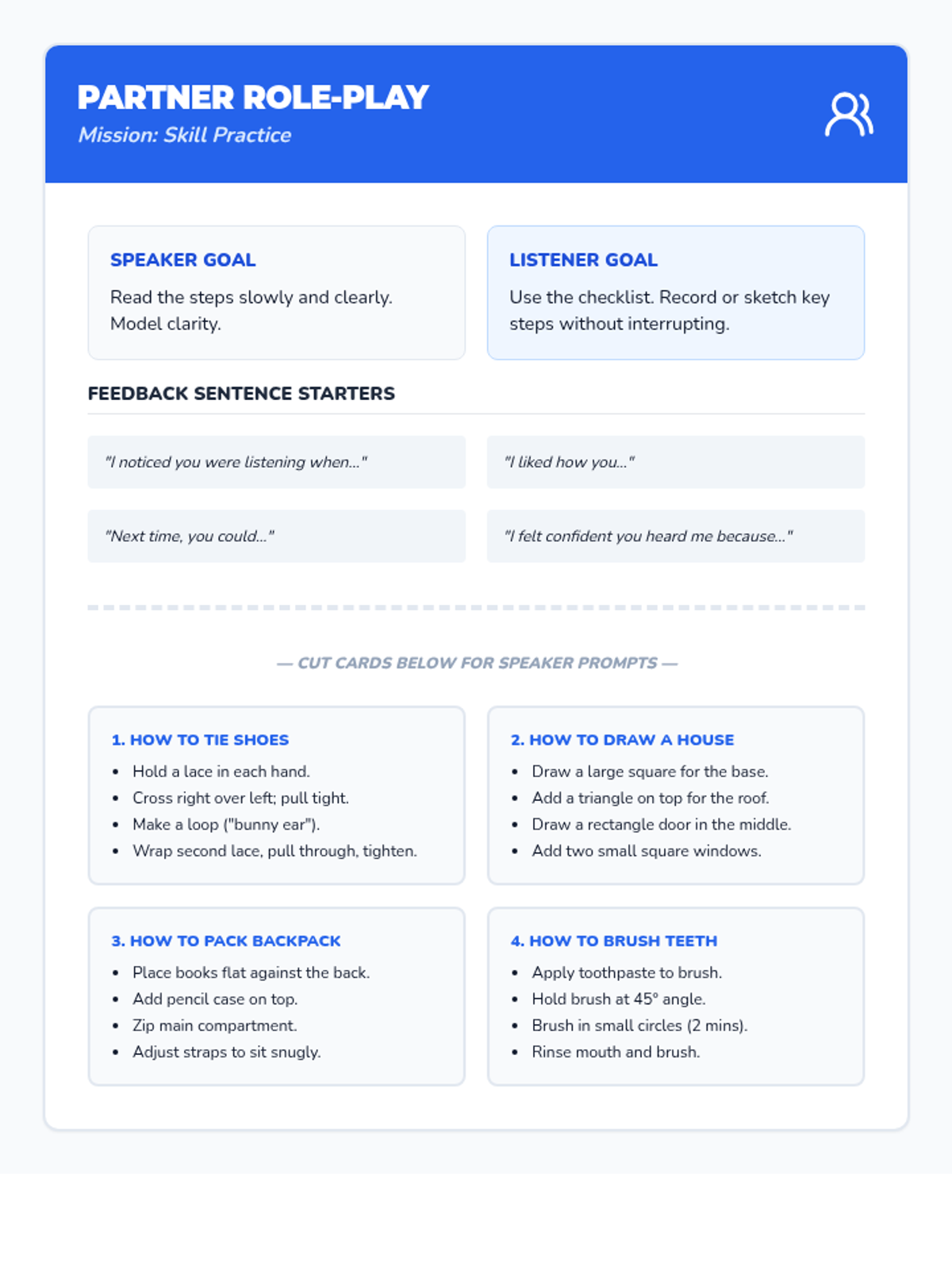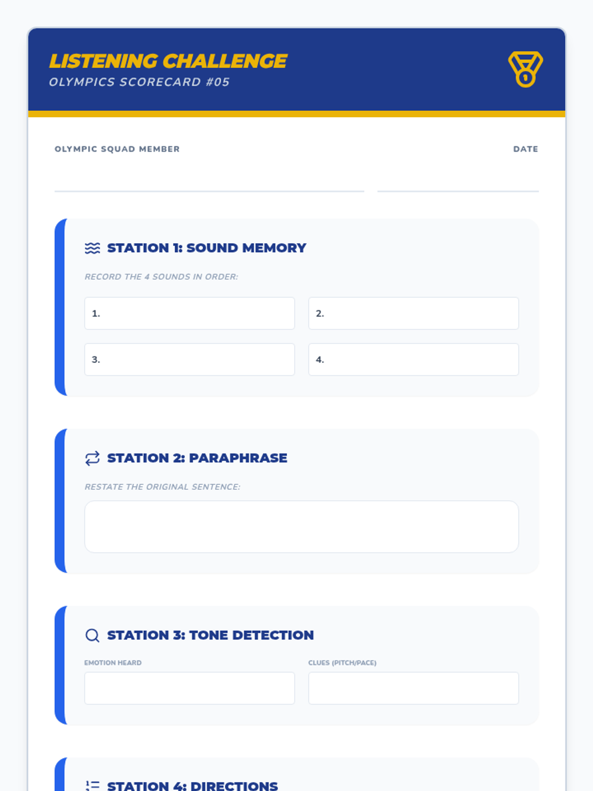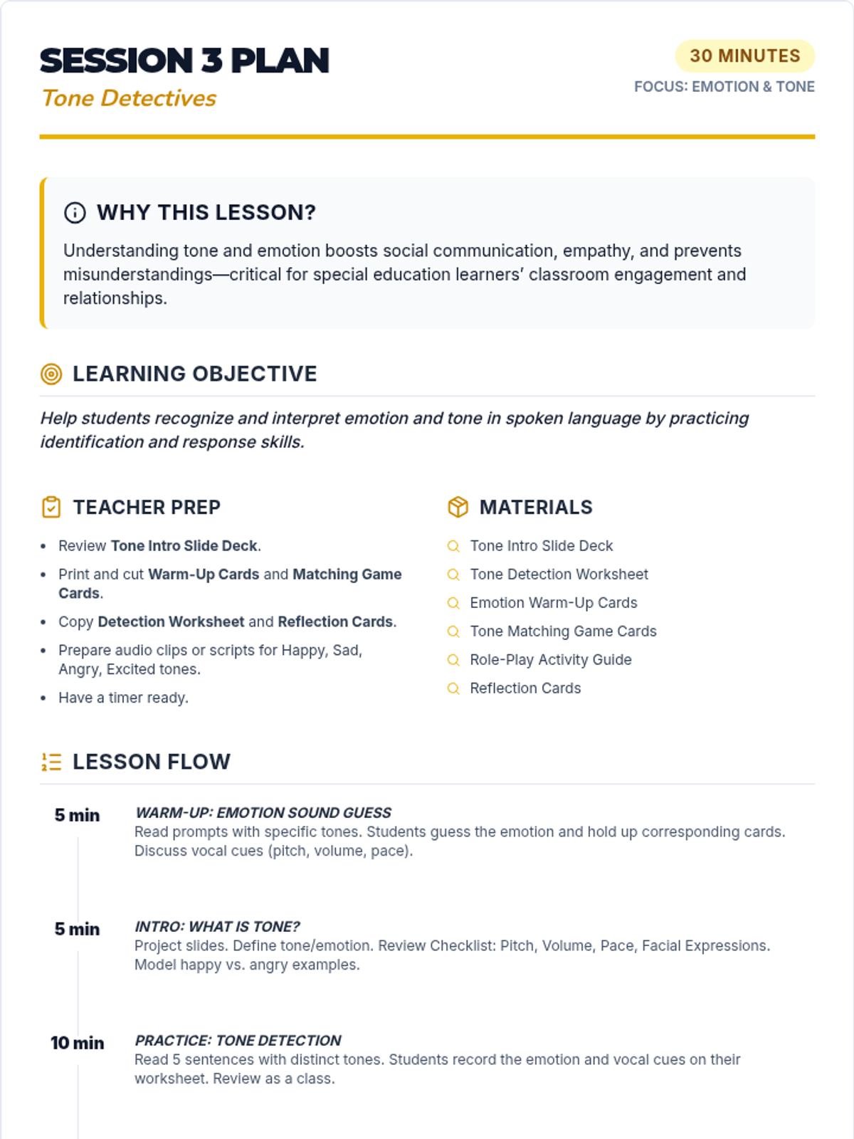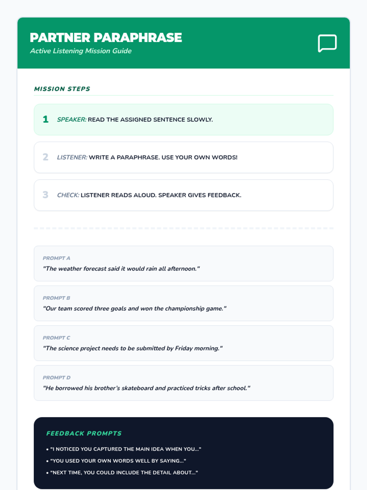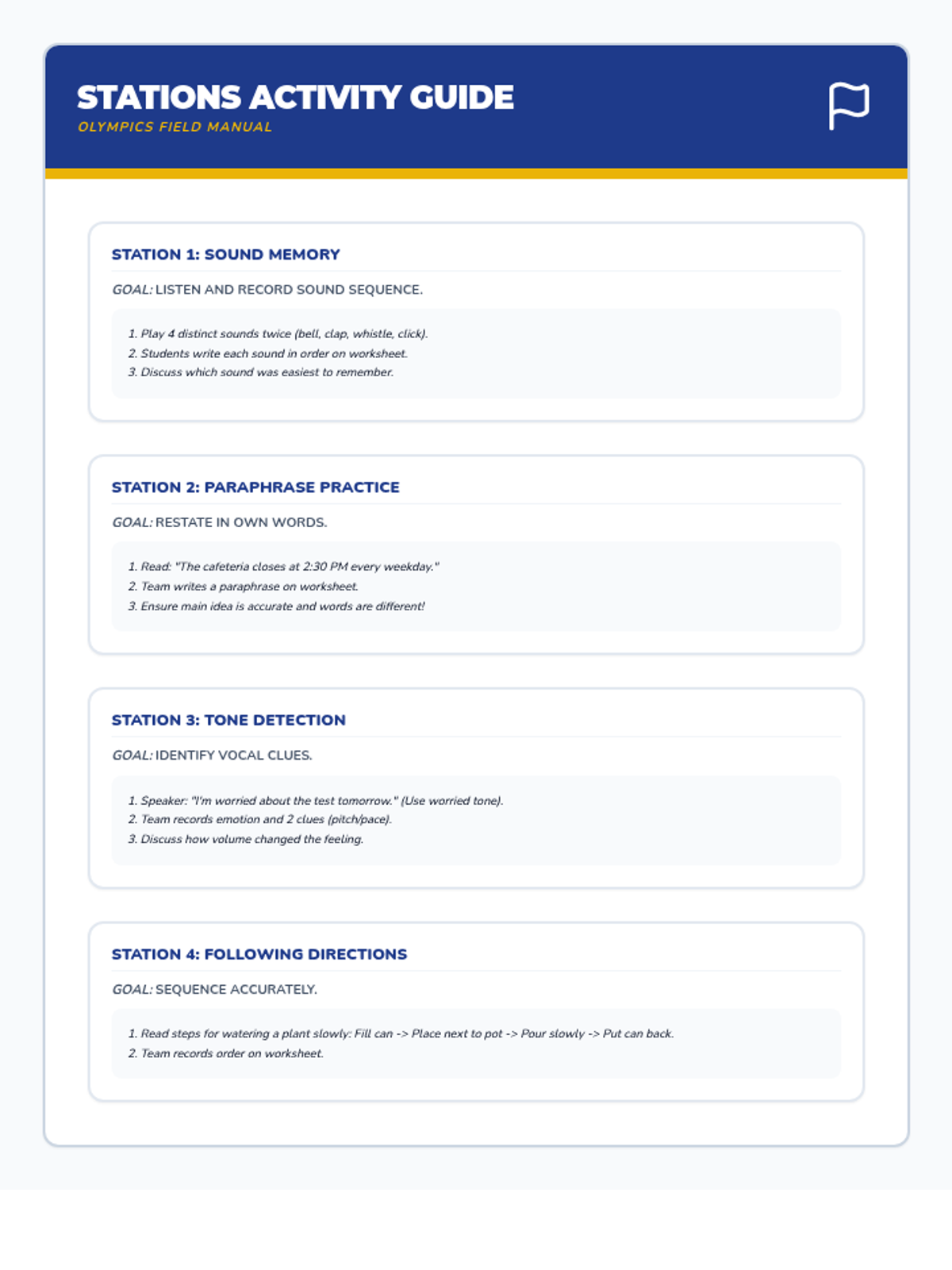 A 5-session unit for middle school special education students to build key listening skills, including active listening, paraphrasing, tone detection, and following multi-step directions through interactive games and structured practice.