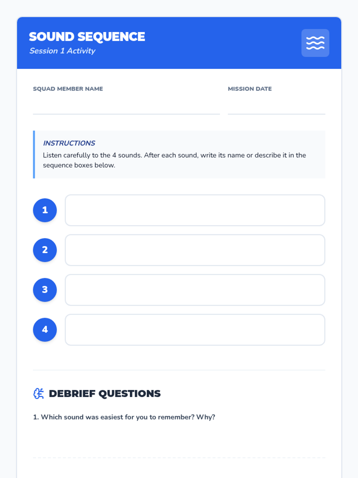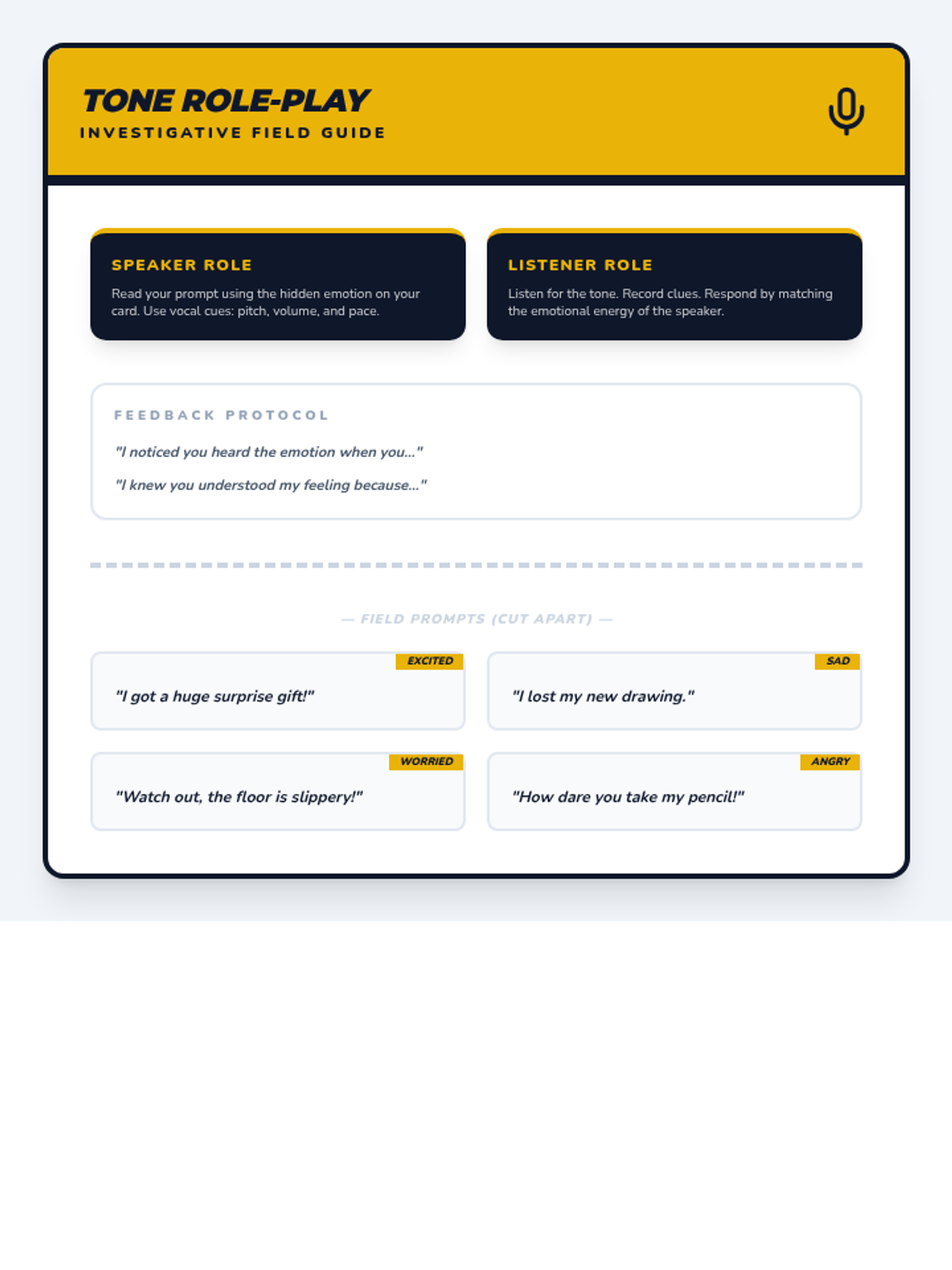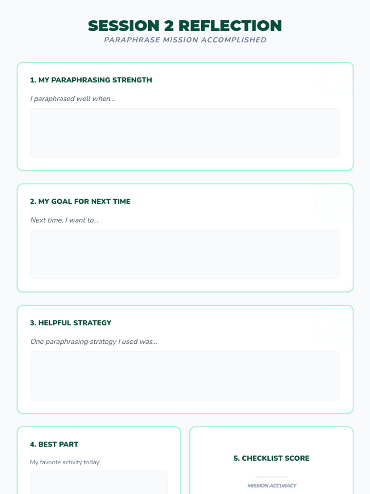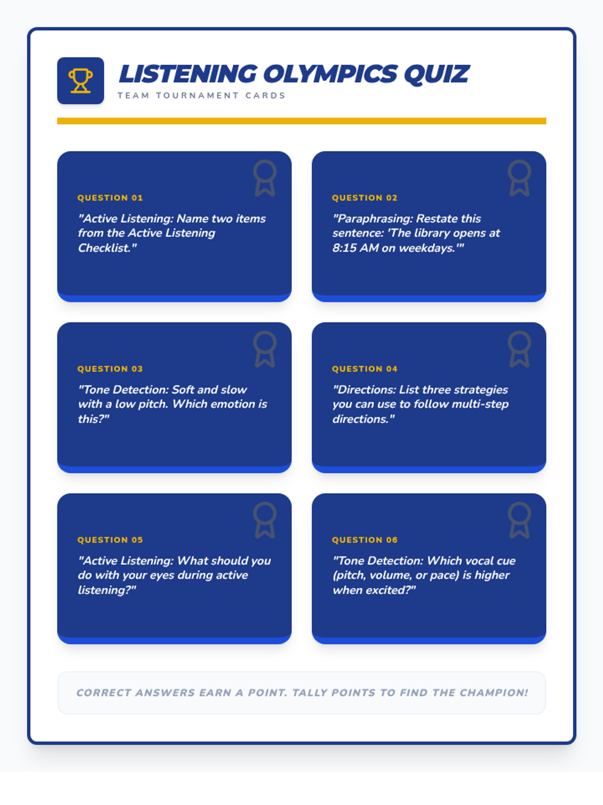 A 5-session unit for middle school special education students to build key listening skills, including active listening, paraphrasing, tone detection, and following multi-step directions through interactive games and structured practice.