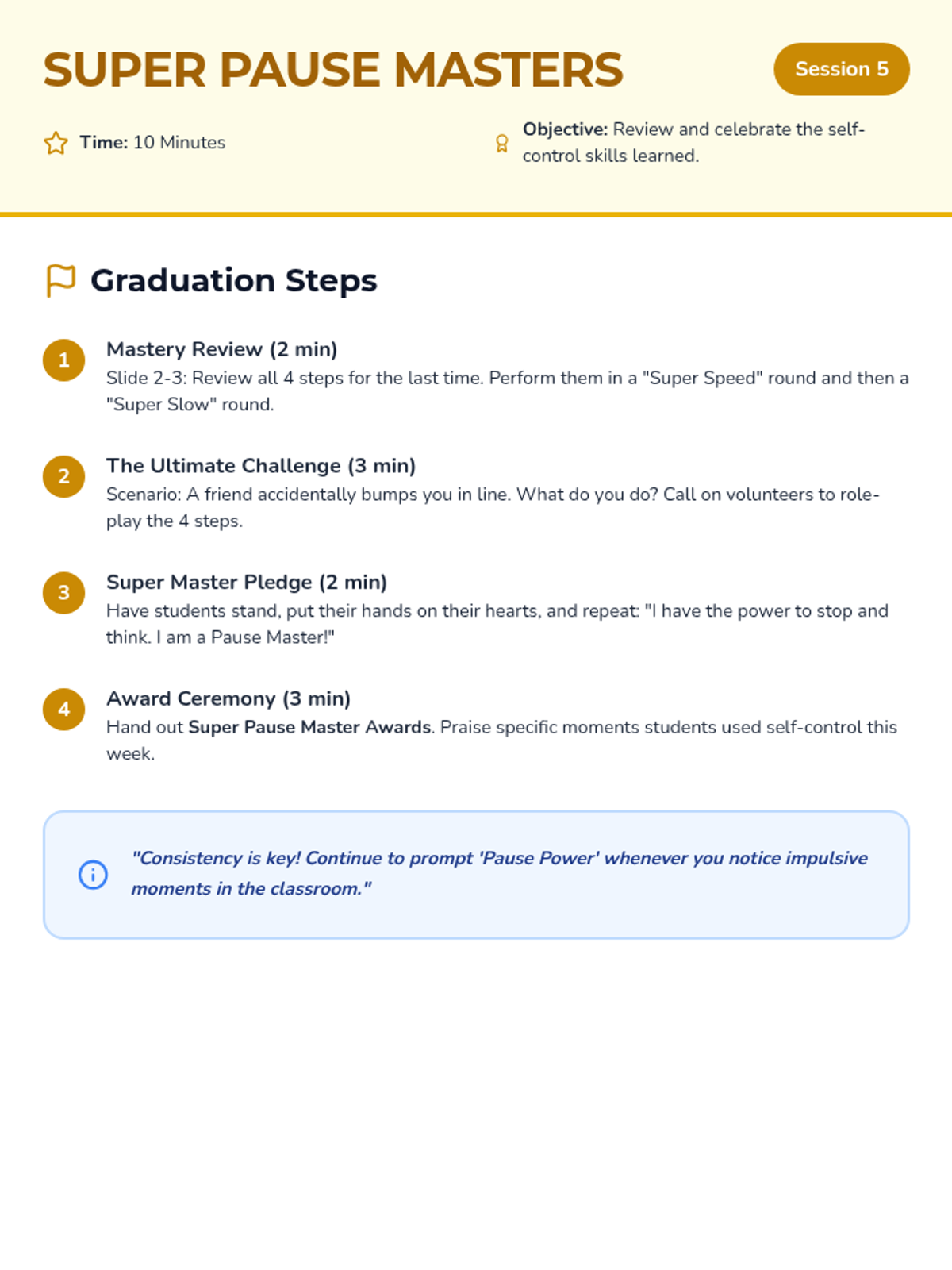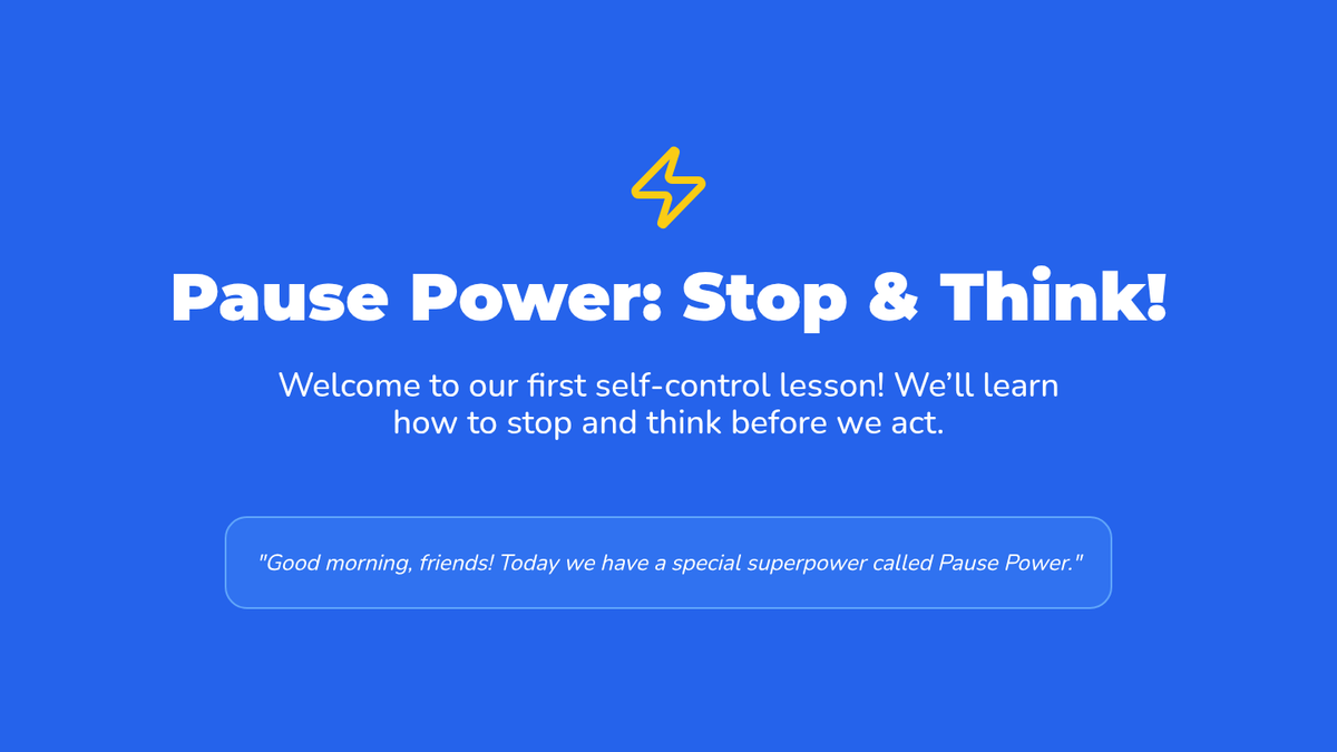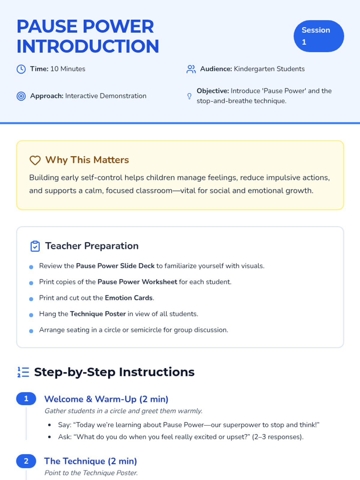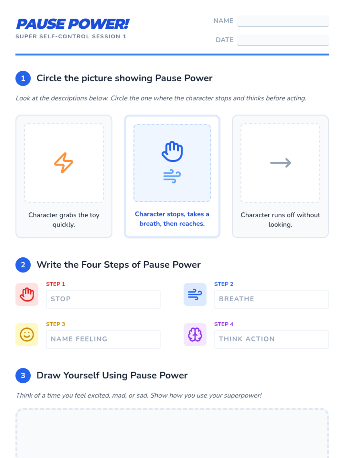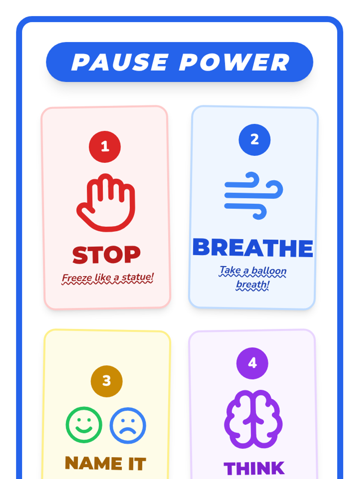 A 5-session social-emotional learning sequence for kindergarteners to develop self-control through the 'Pause Power' technique (Stop, Breathe, Name, Think).