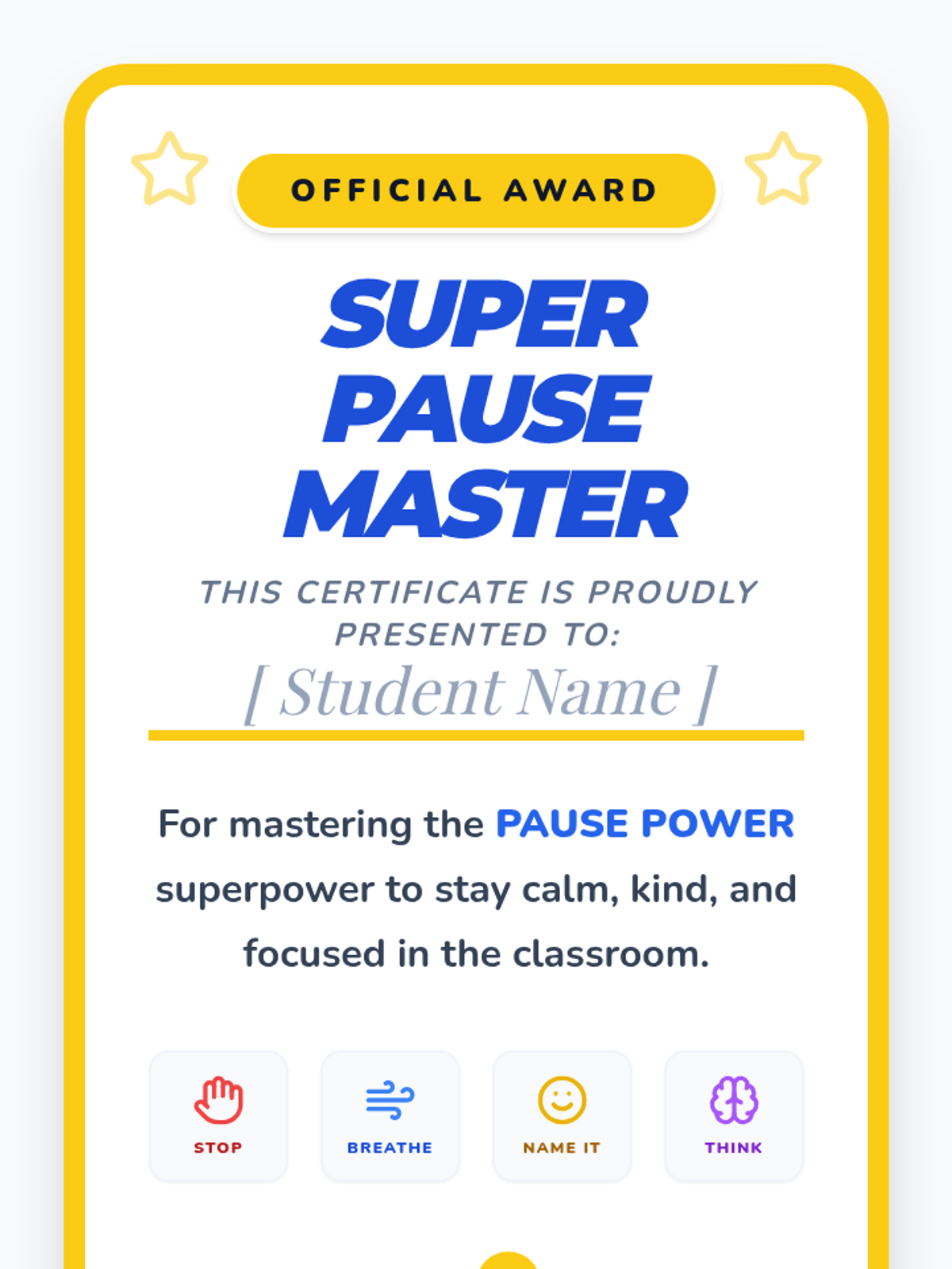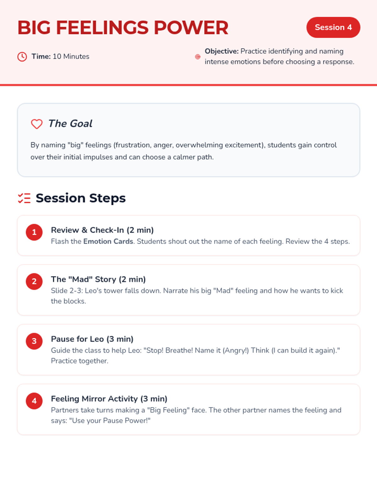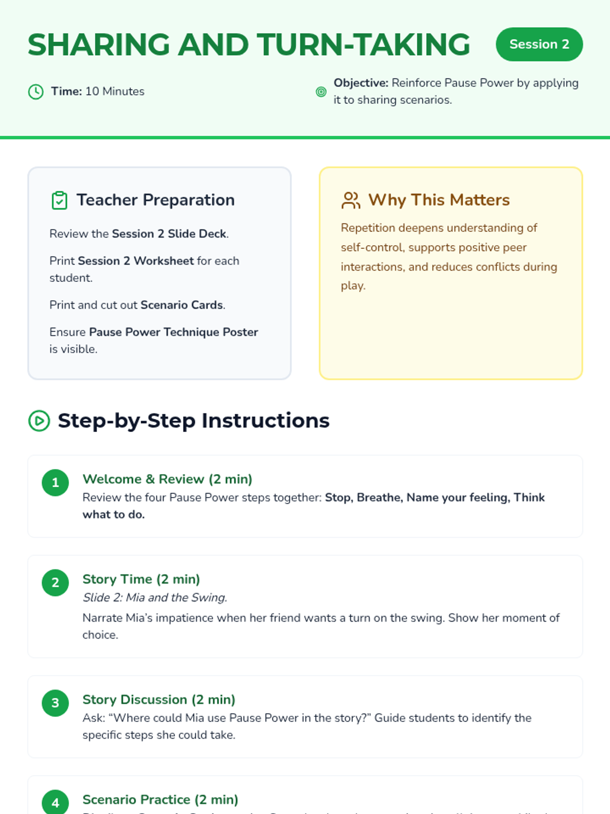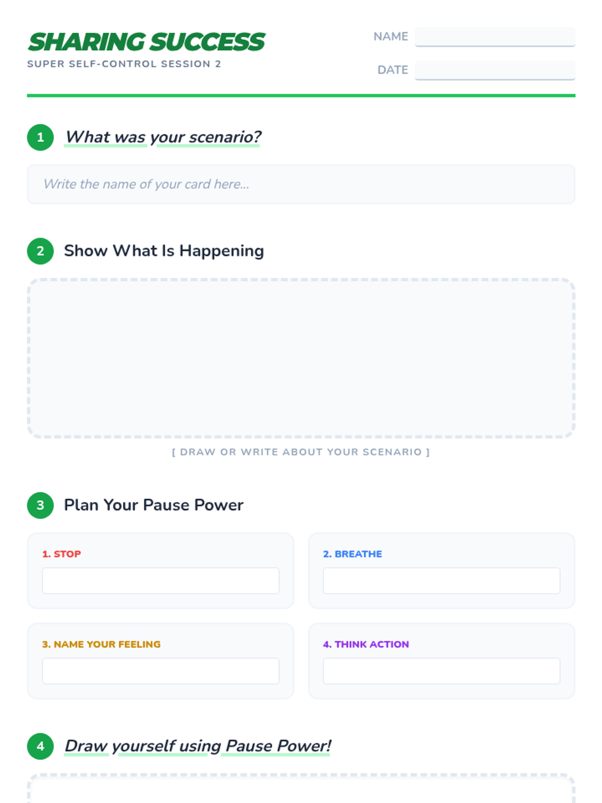A 5-session social-emotional learning sequence for kindergarteners to develop self-control through the 'Pause Power' technique (Stop, Breathe, Name, Think).