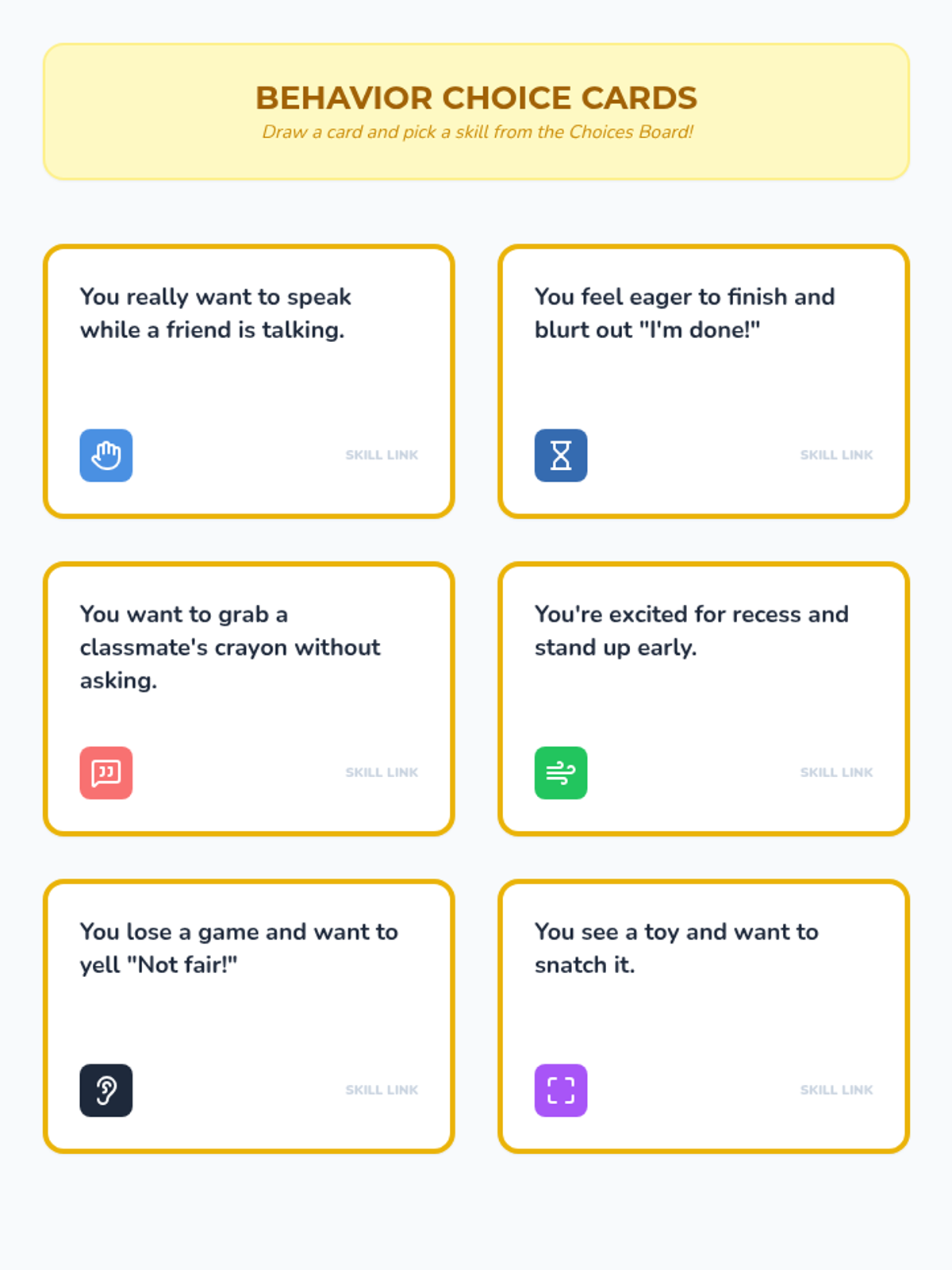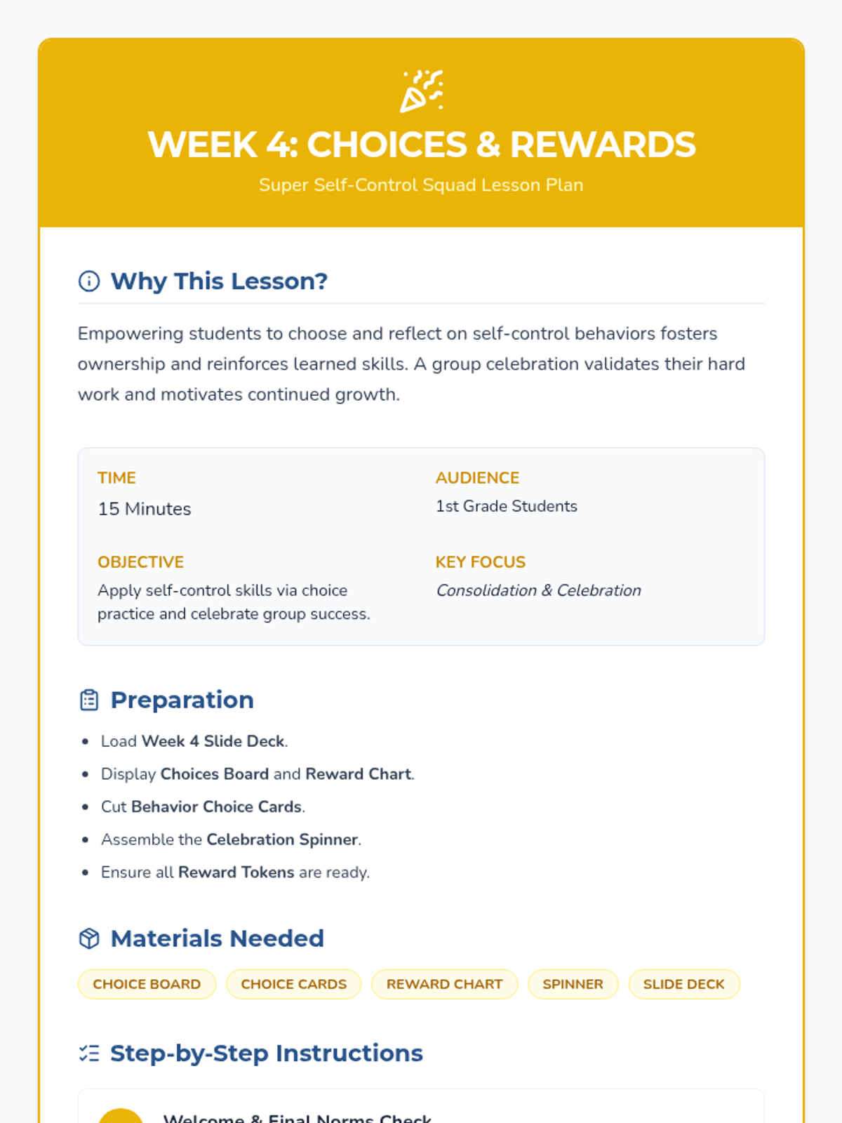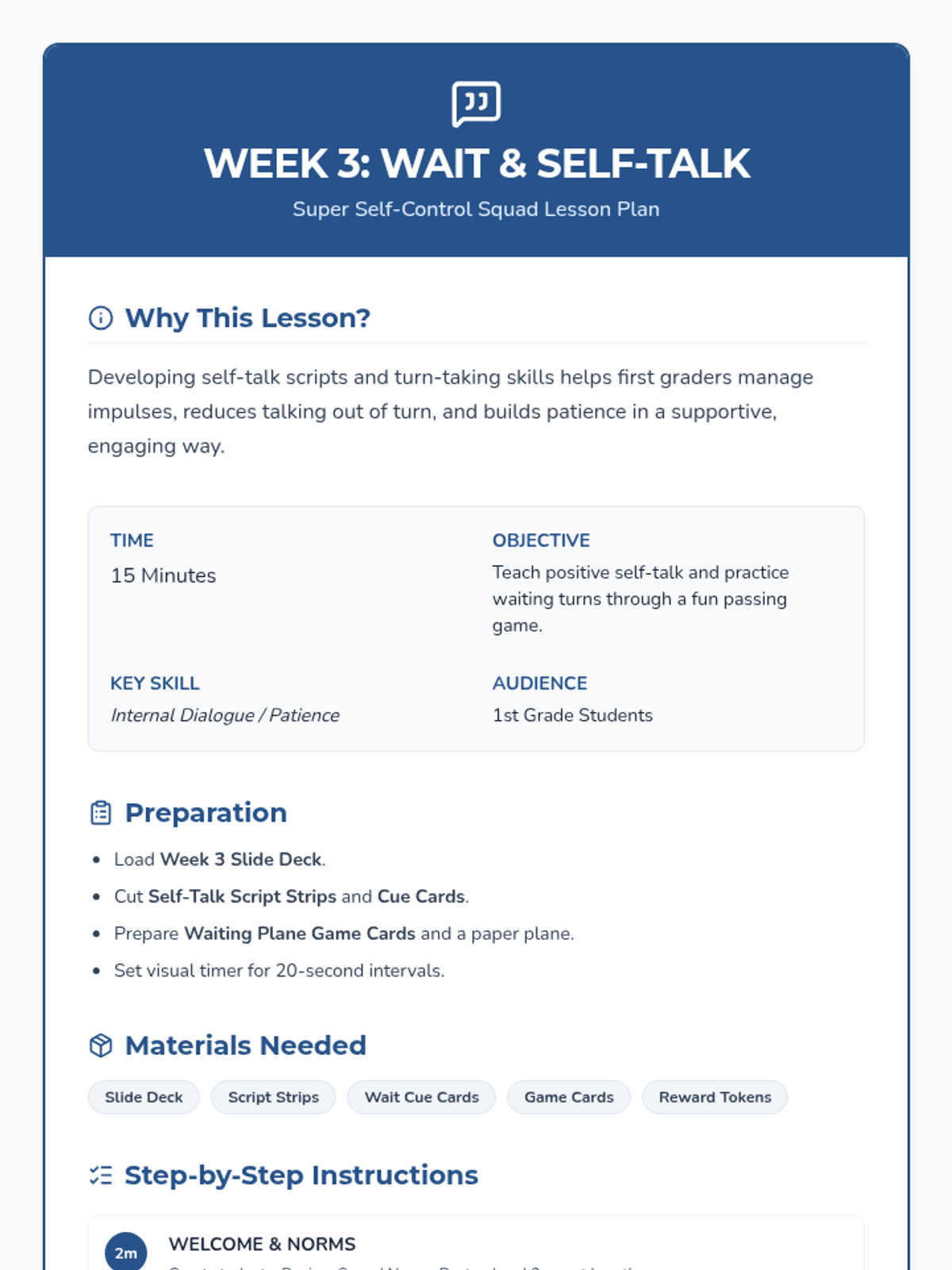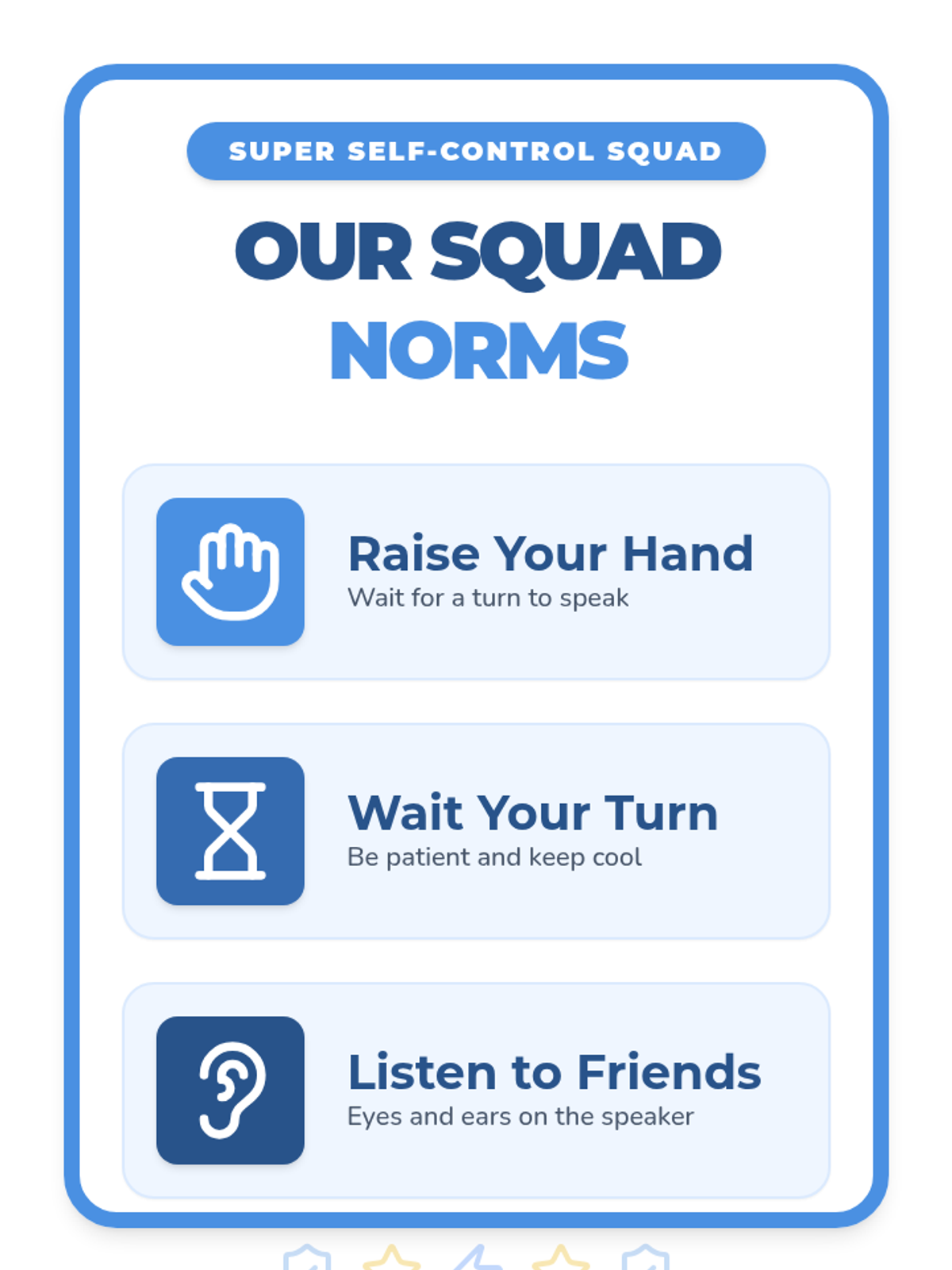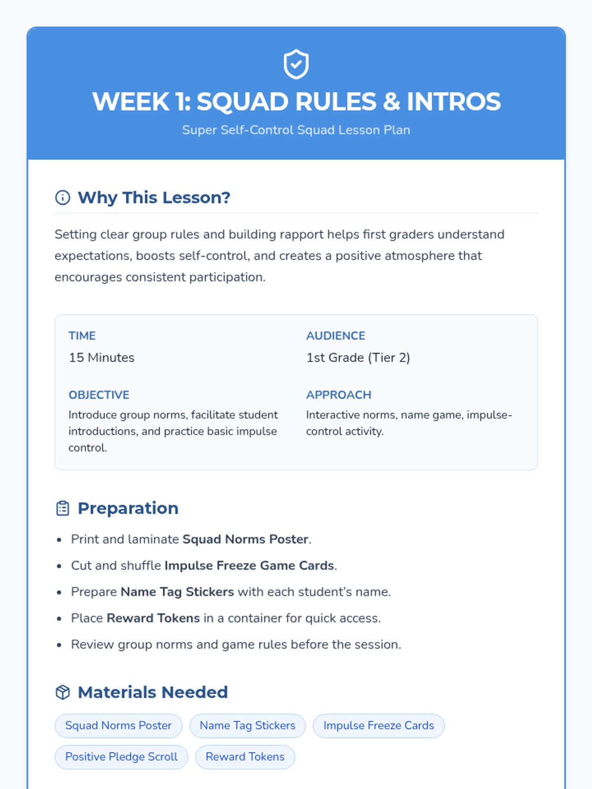 A 4-week Tier 2 social-skills group for 1st graders focused on building impulse control through fun games, interactive activities, and consistent norms. These 15-minute sessions help students practice raising hands, waiting turns, and making mindful choices in a supportive 'Super Squad' environment.