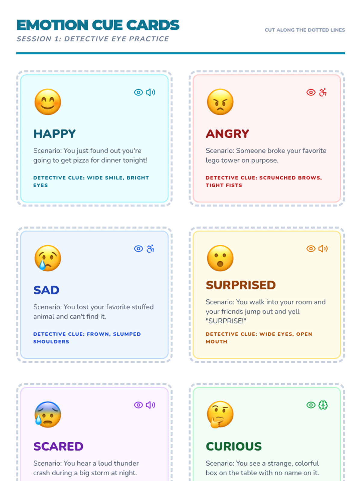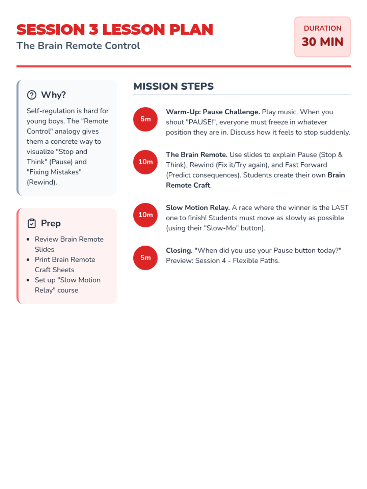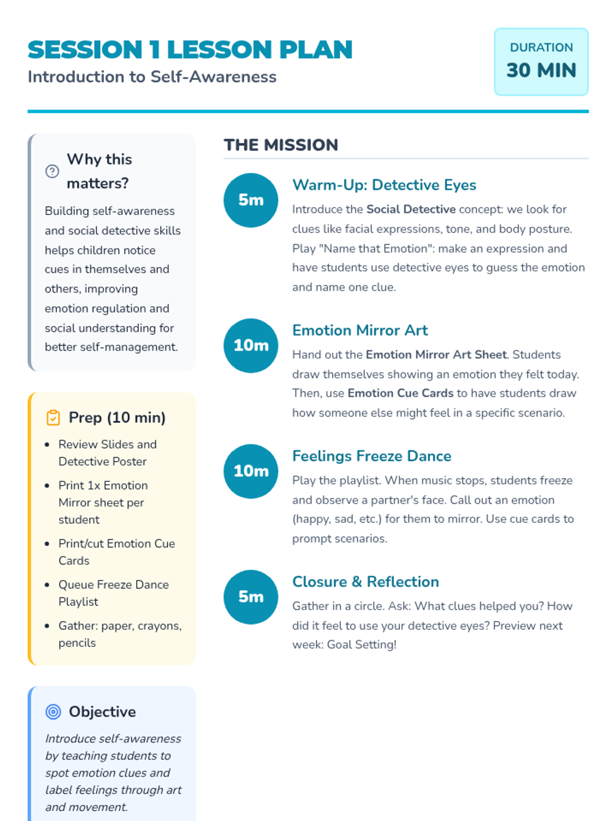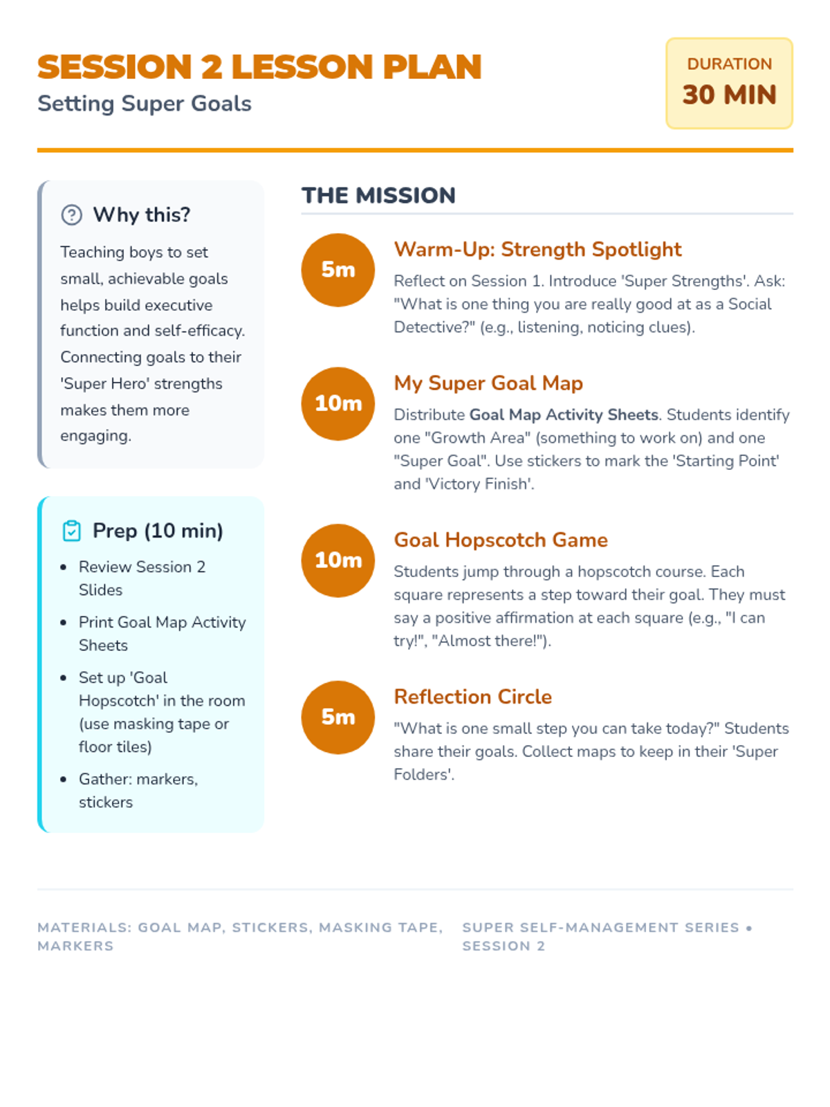 A 10-session group lesson series for grades 1-3 boys focused on building self-management skills through art therapy, movement games, and Social Thinking strategies. Students become 'Social Detectives' to learn emotion regulation, goal setting, and flexible thinking.
