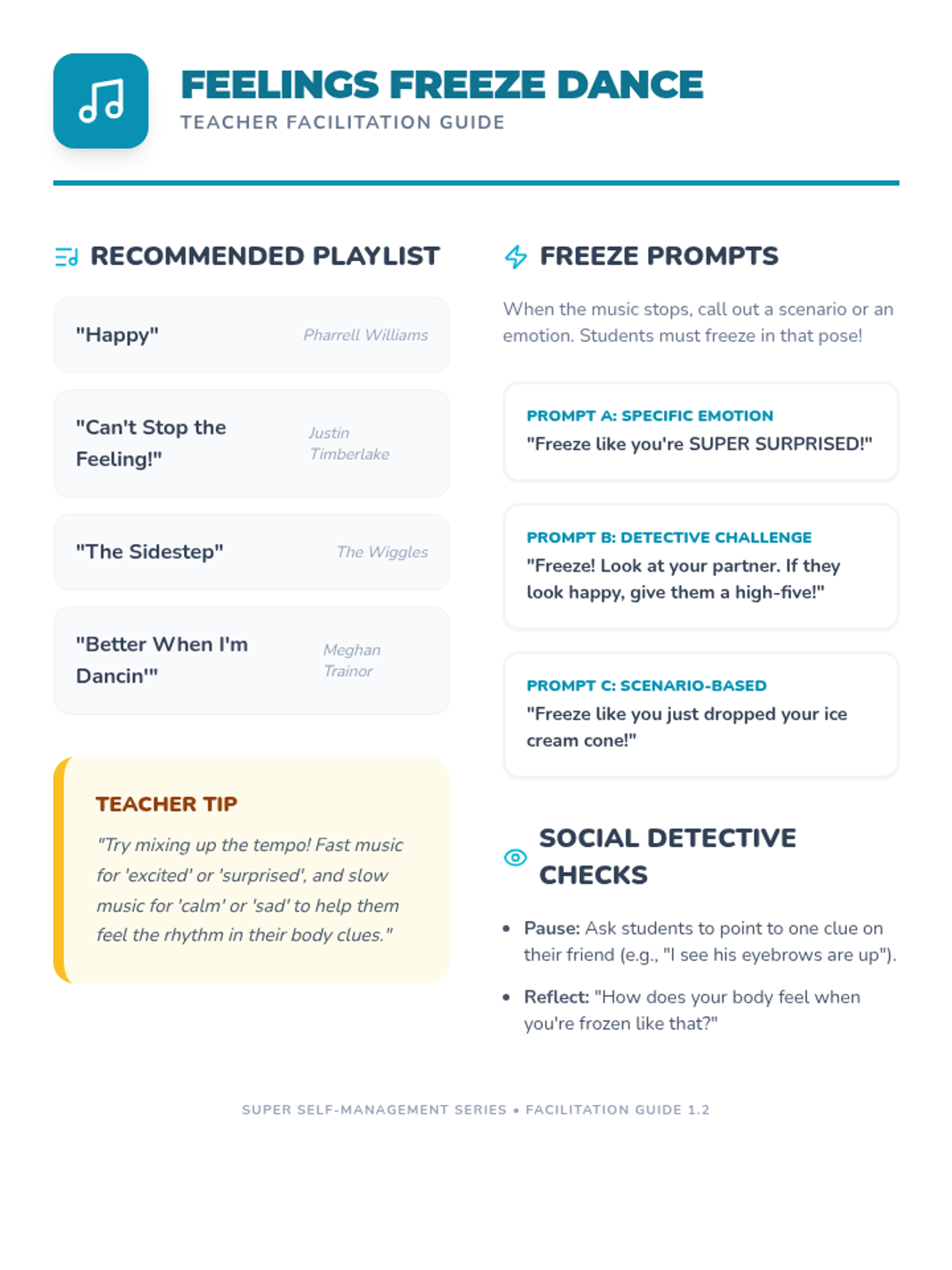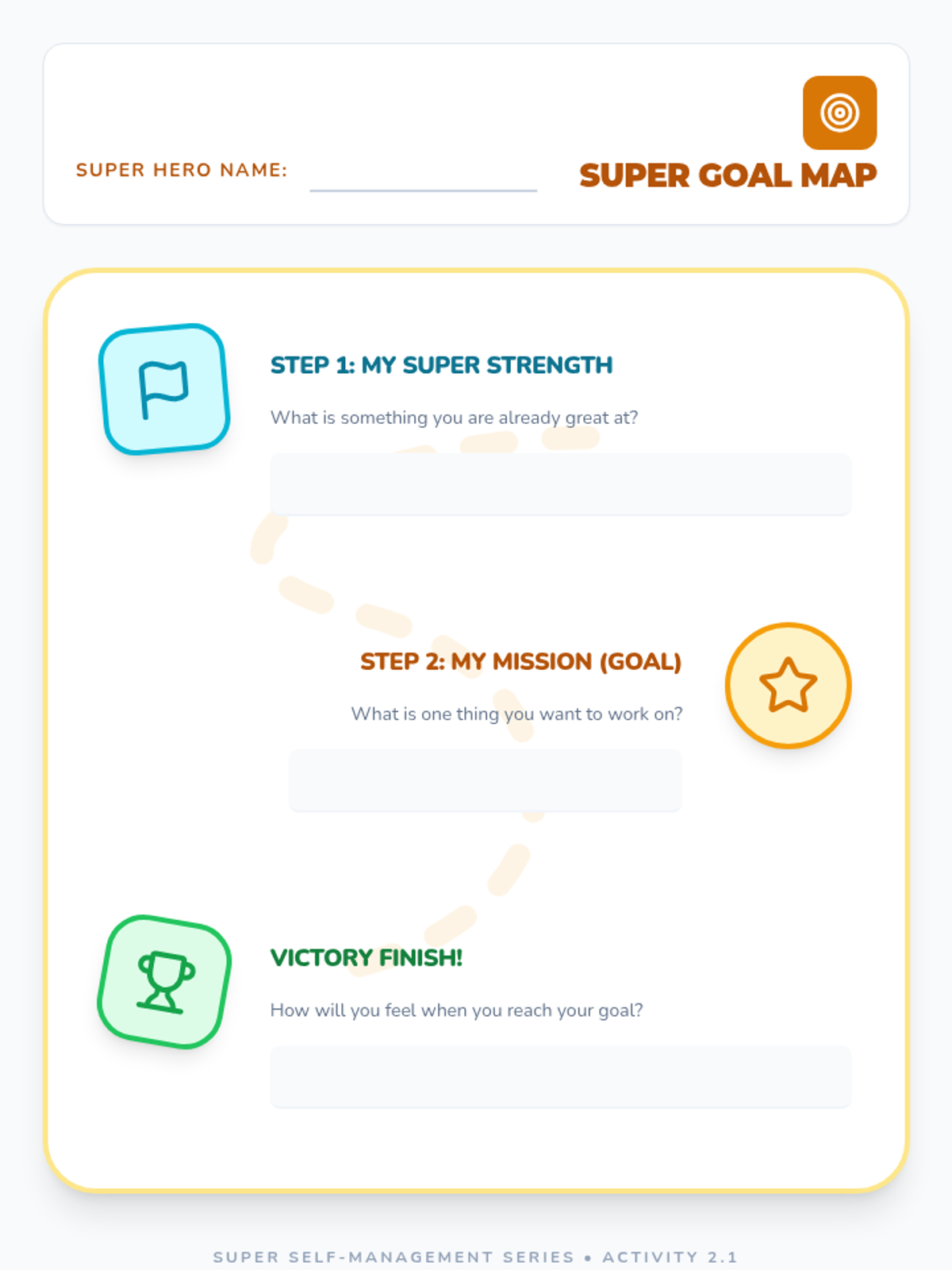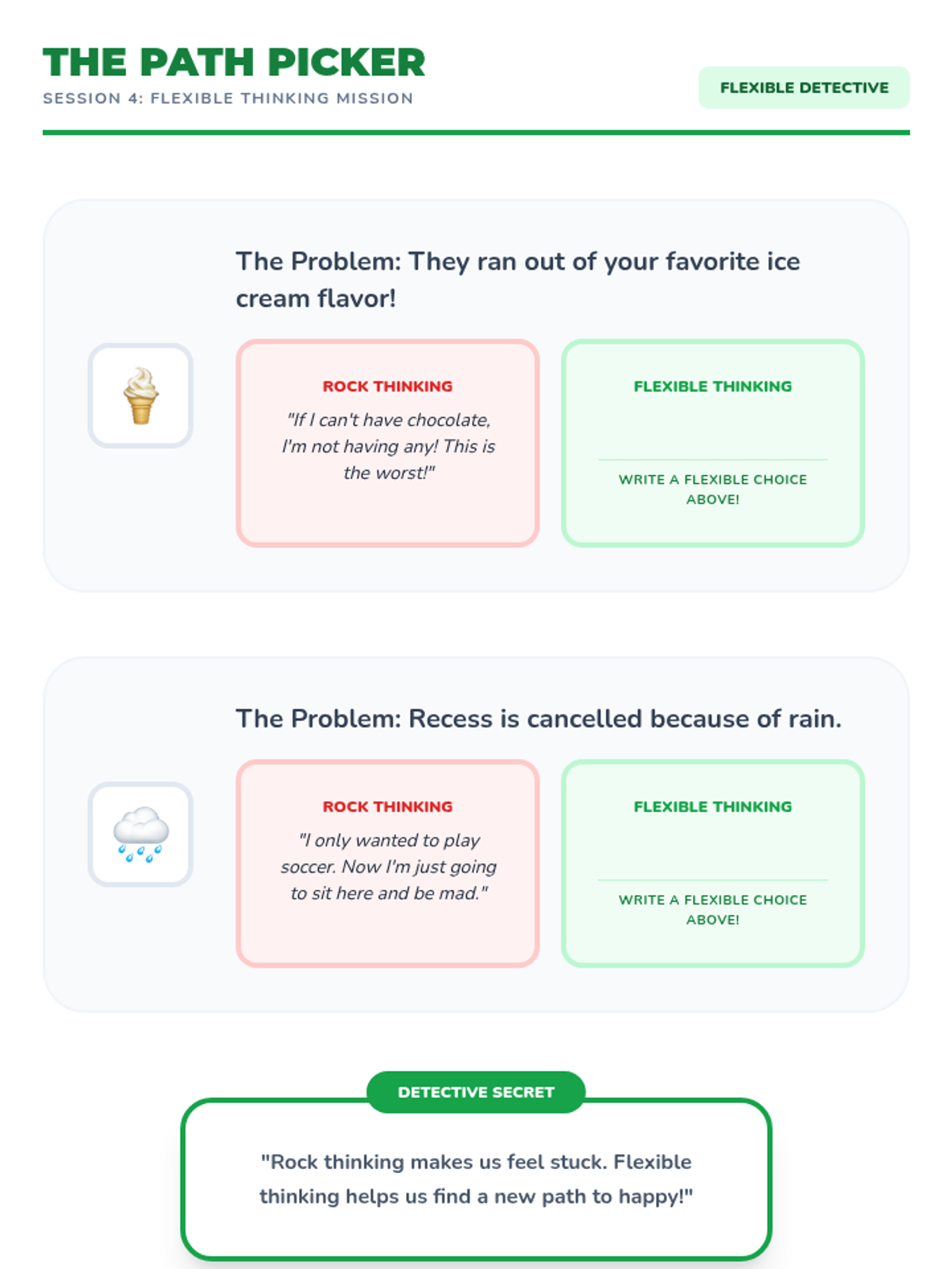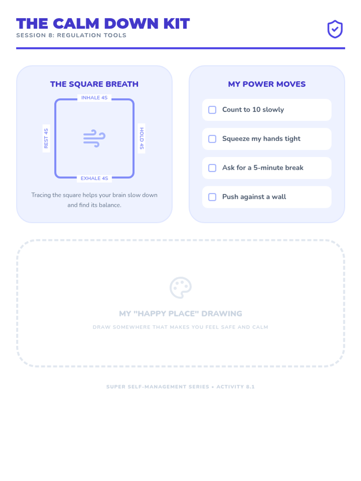 A 10-session group lesson series for grades 1-3 boys focused on building self-management skills through art therapy, movement games, and Social Thinking strategies. Students become 'Social Detectives' to learn emotion regulation, goal setting, and flexible thinking.