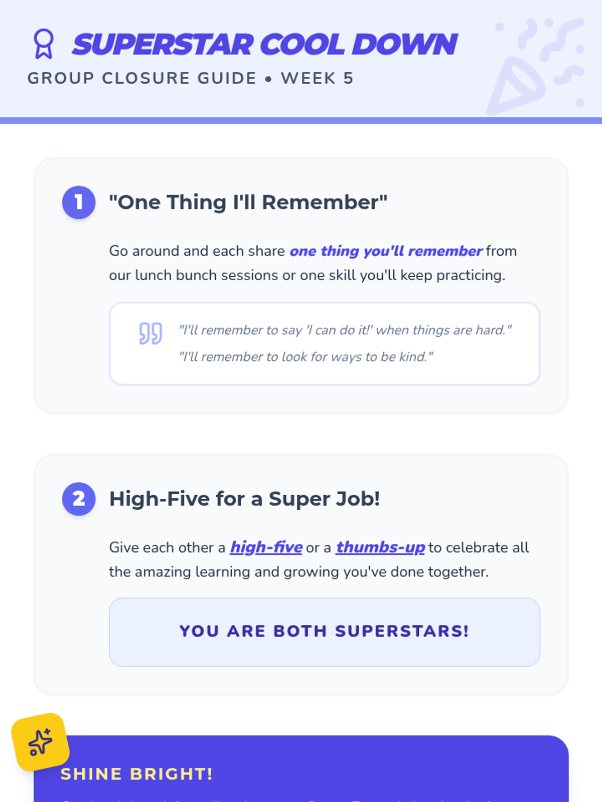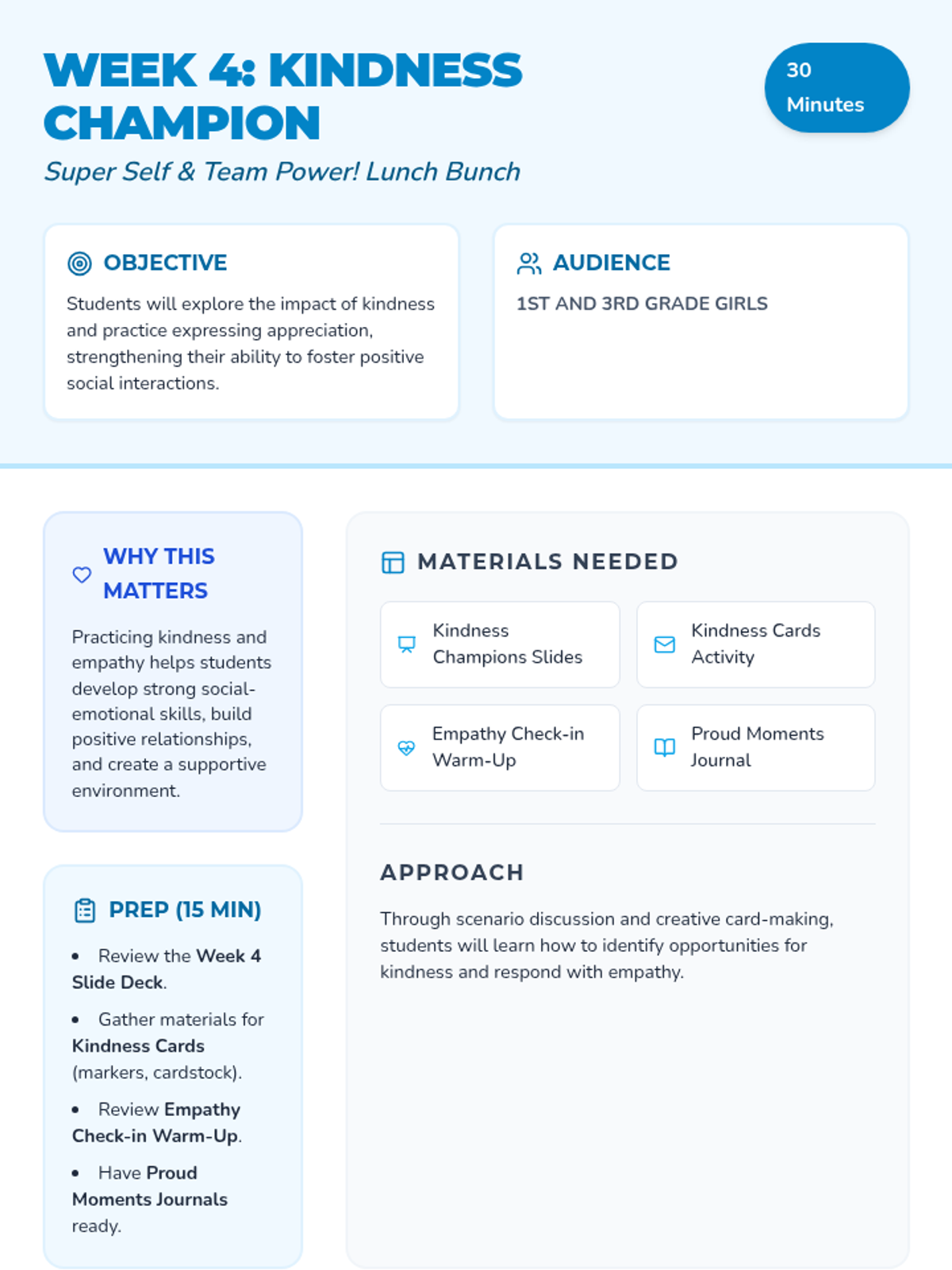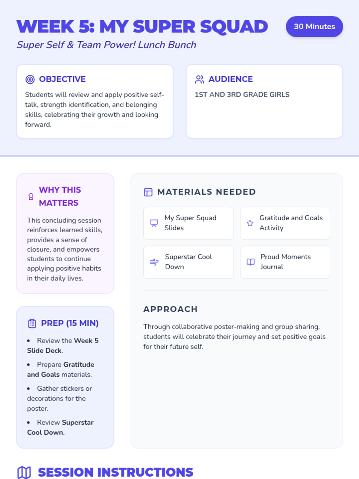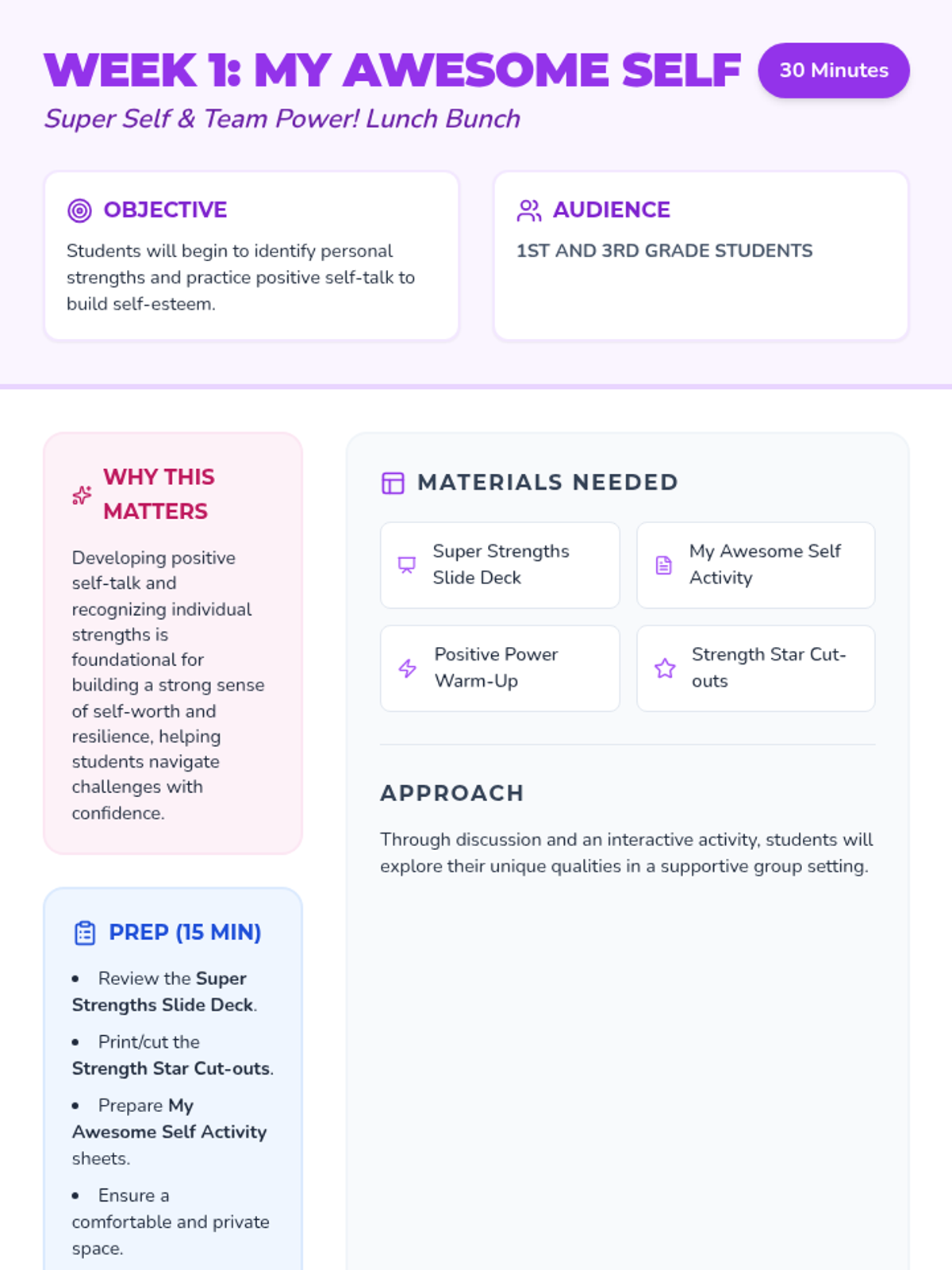 A 5-week Tier 2 lunch bunch curriculum for primary students focusing on positive self-talk, strength identification, teamwork, and kindness. Students engage in weekly reflections and collaborative activities to build self-esteem and a sense of belonging.