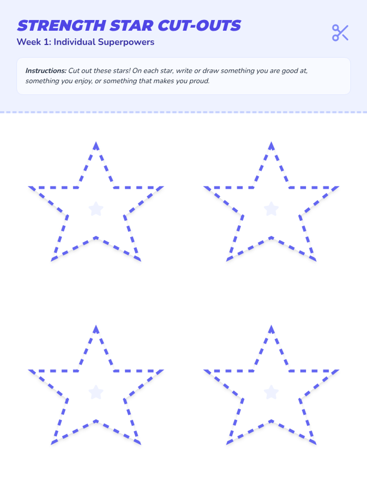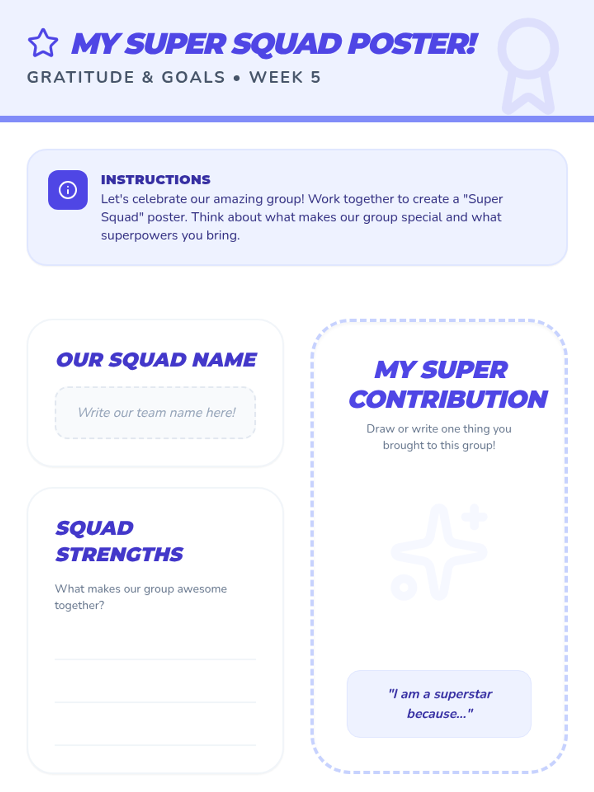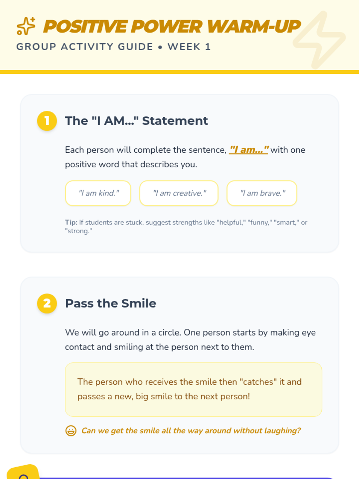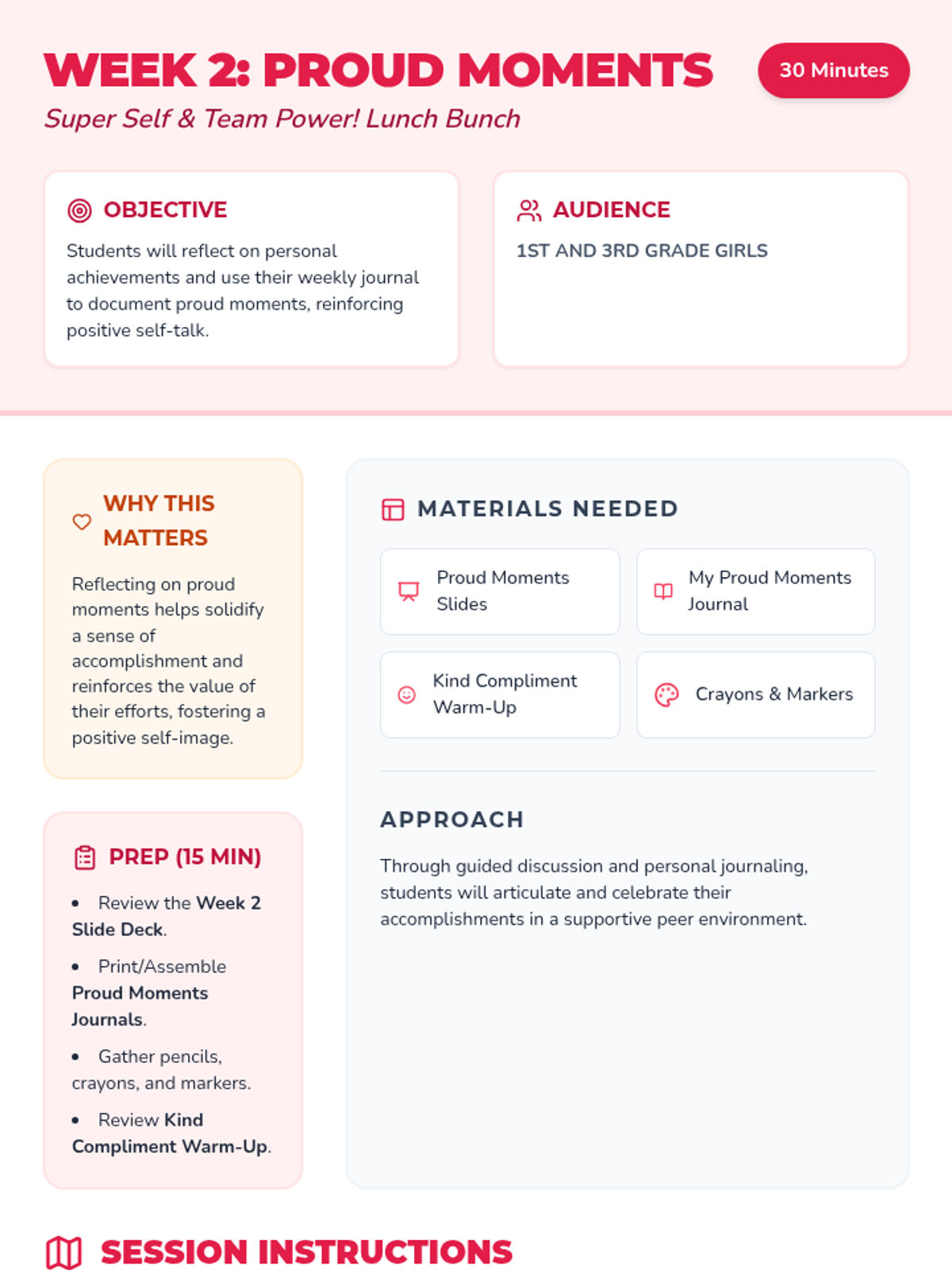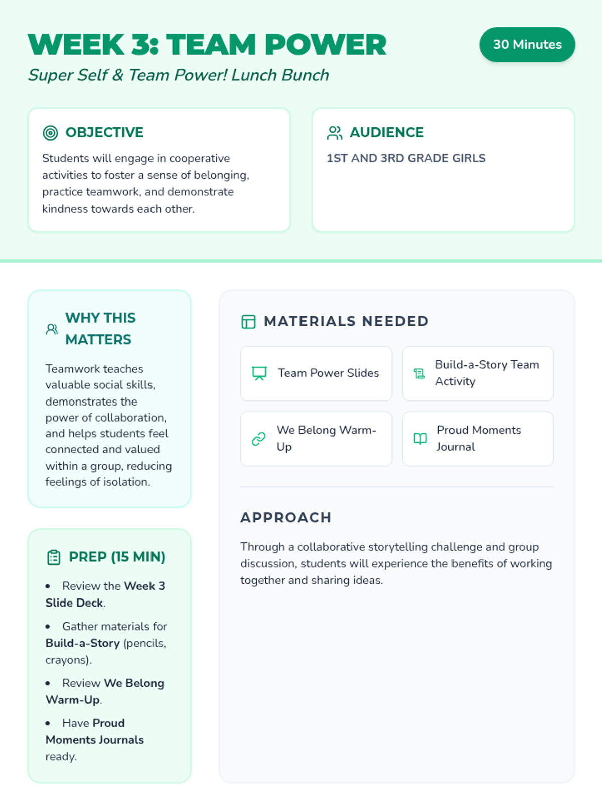 A 5-week Tier 2 lunch bunch curriculum for primary students focusing on positive self-talk, strength identification, teamwork, and kindness. Students engage in weekly reflections and collaborative activities to build self-esteem and a sense of belonging.