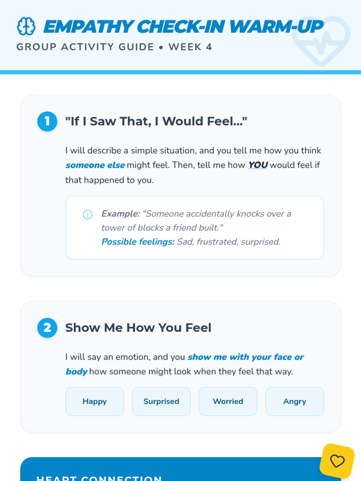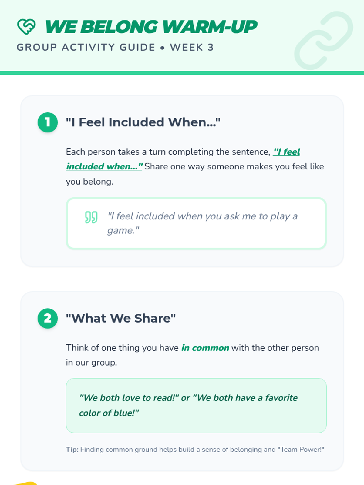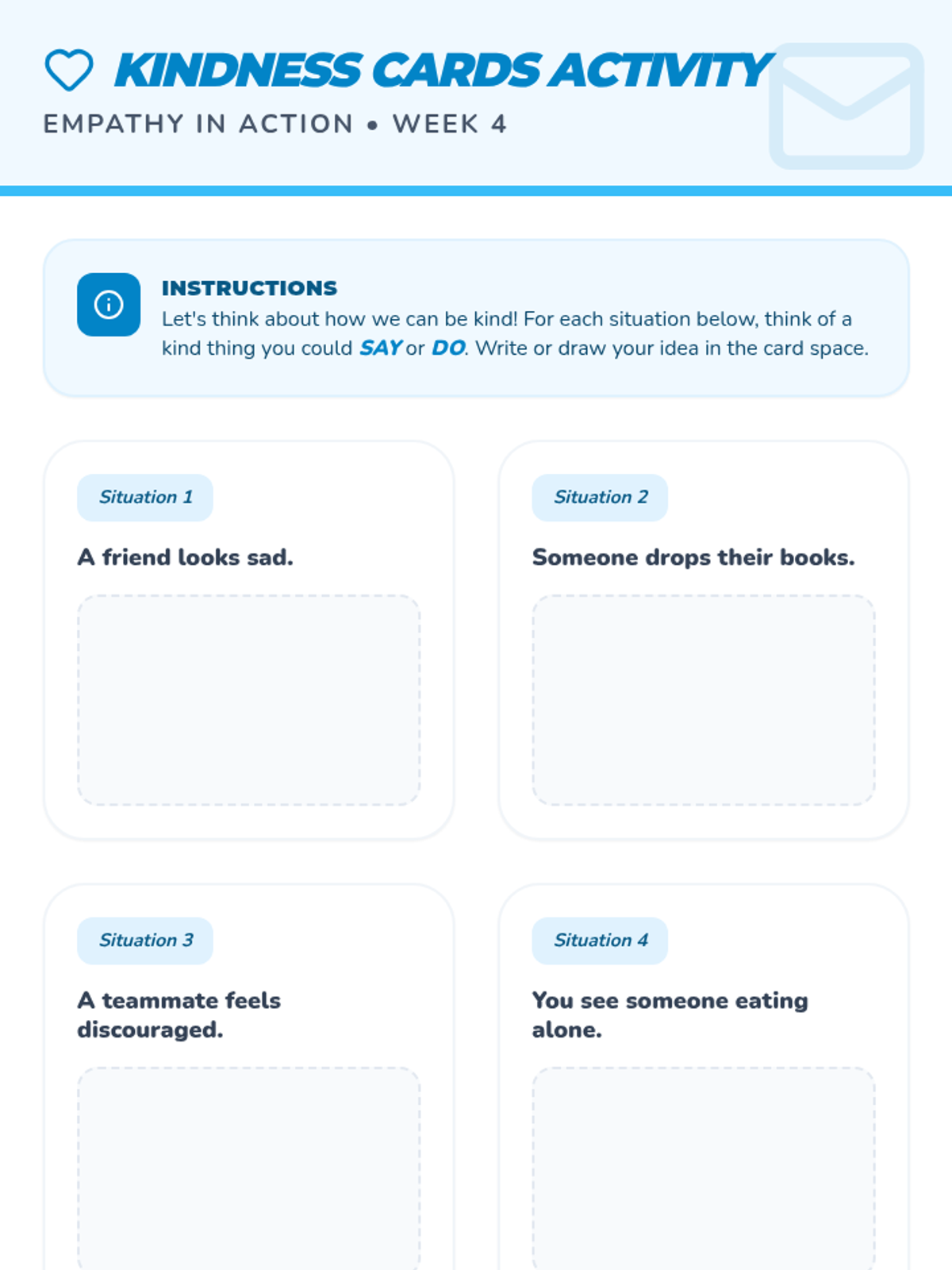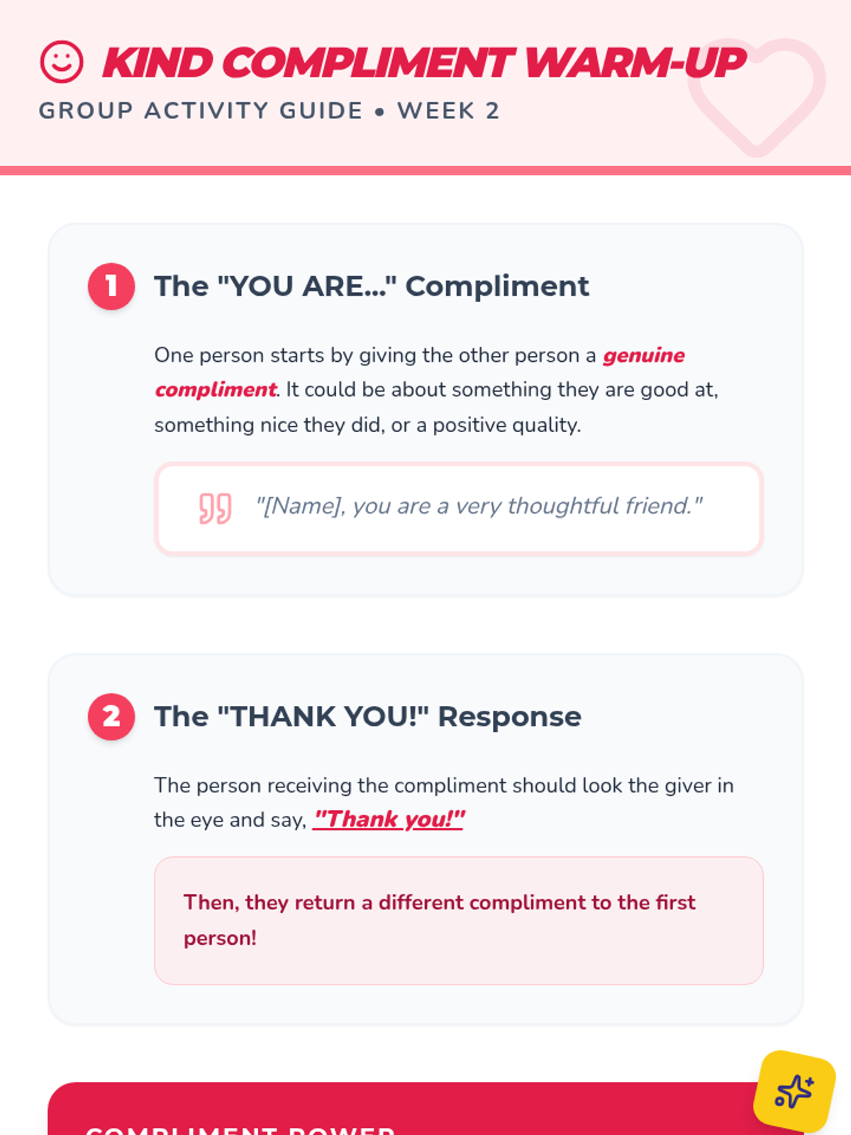 A 5-week Tier 2 lunch bunch curriculum for primary students focusing on positive self-talk, strength identification, teamwork, and kindness. Students engage in weekly reflections and collaborative activities to build self-esteem and a sense of belonging.