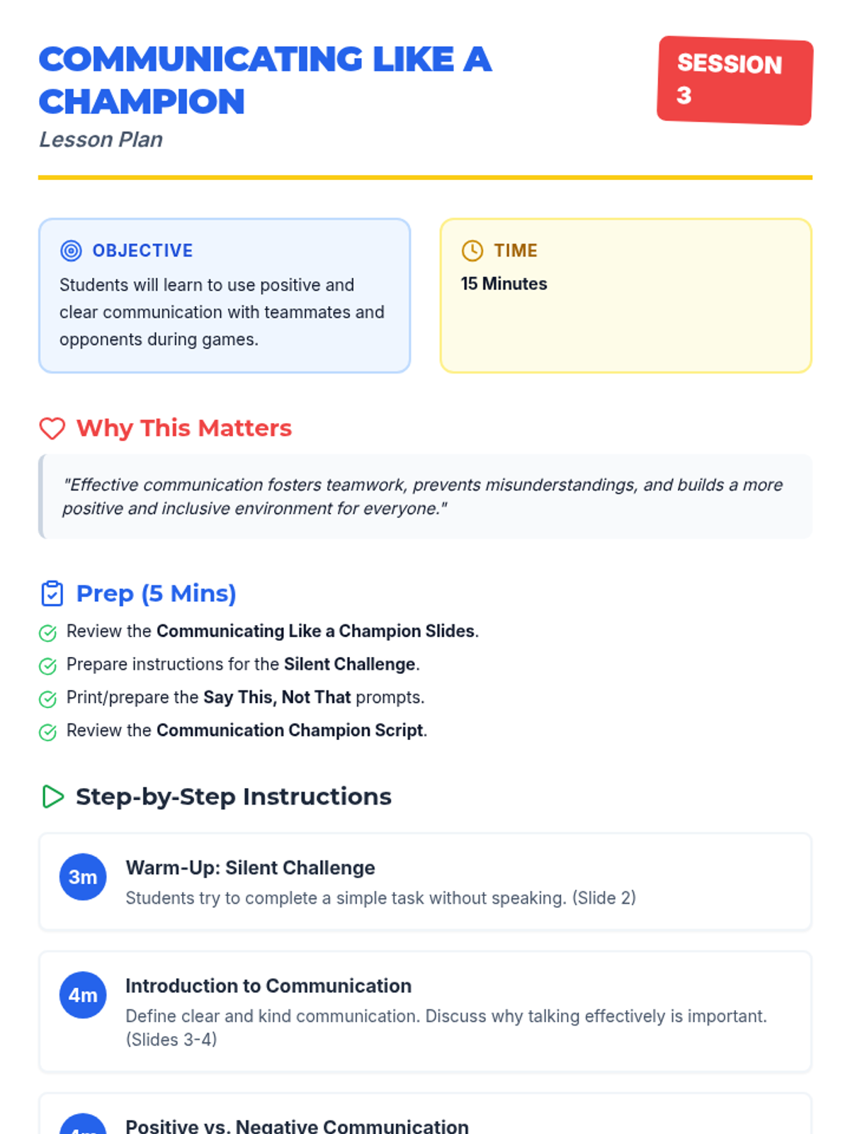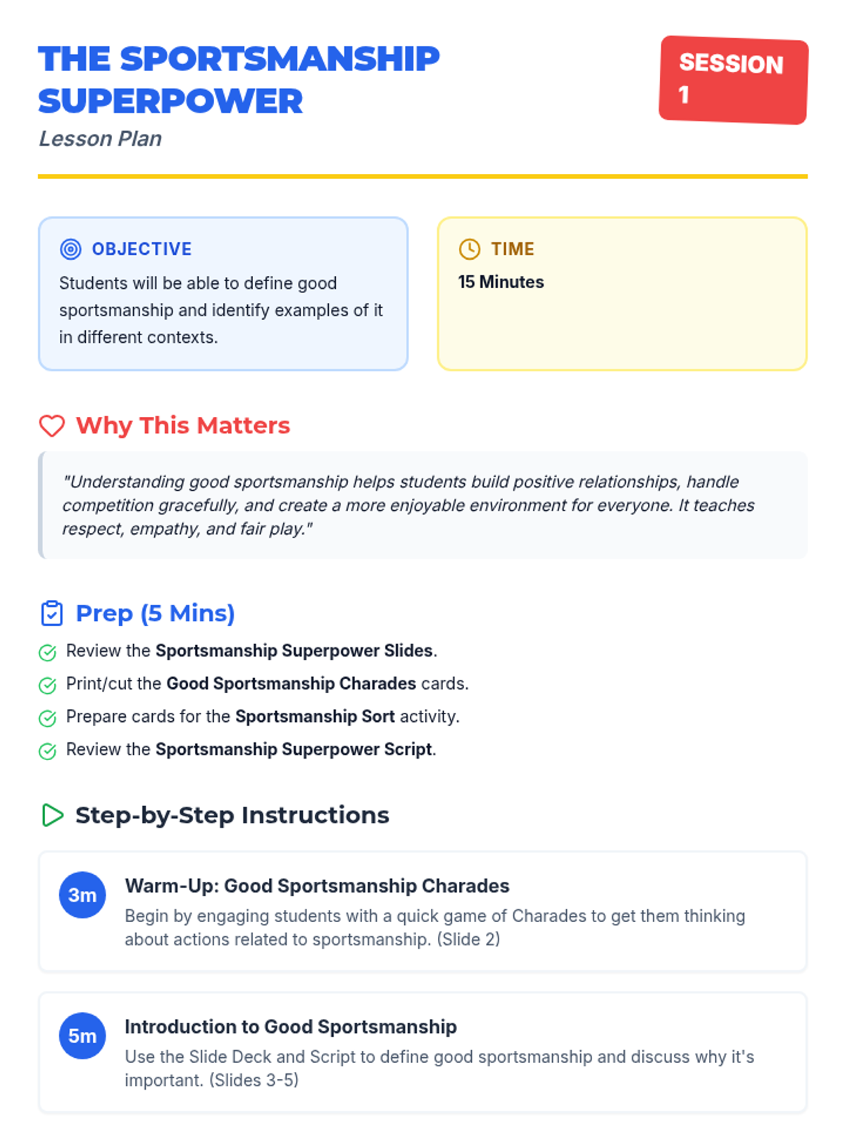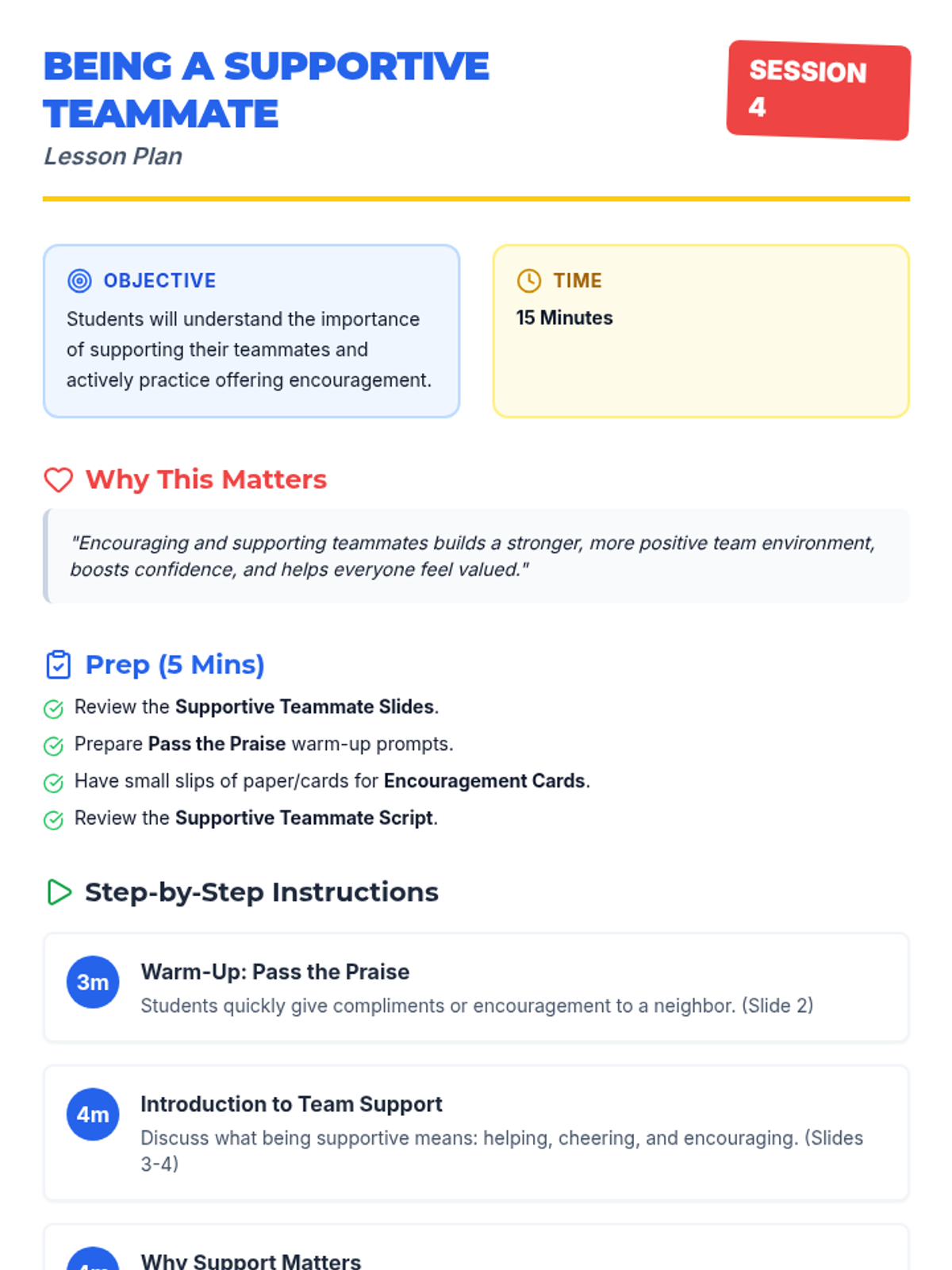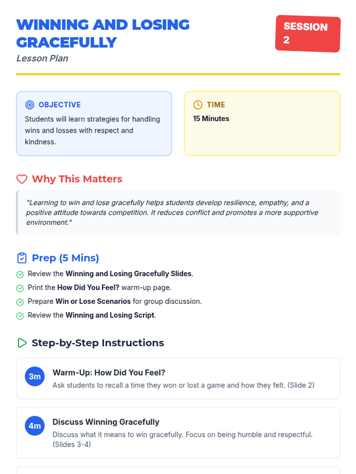A series of five 15-minute mini-lessons for 2nd graders focused on developing positive sportsmanship, effective communication, and supportive teamwork through interactive activities and discussions.