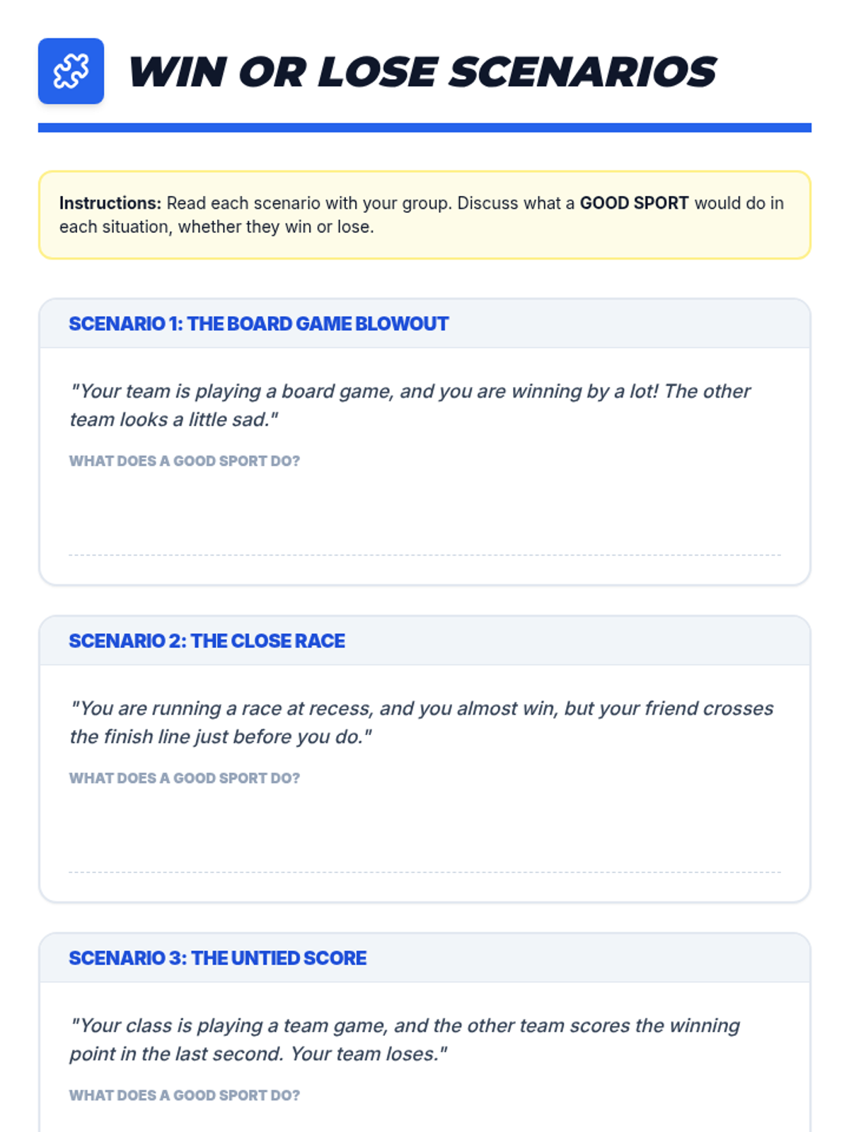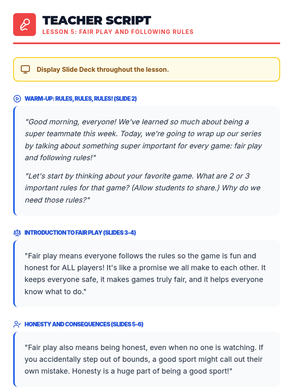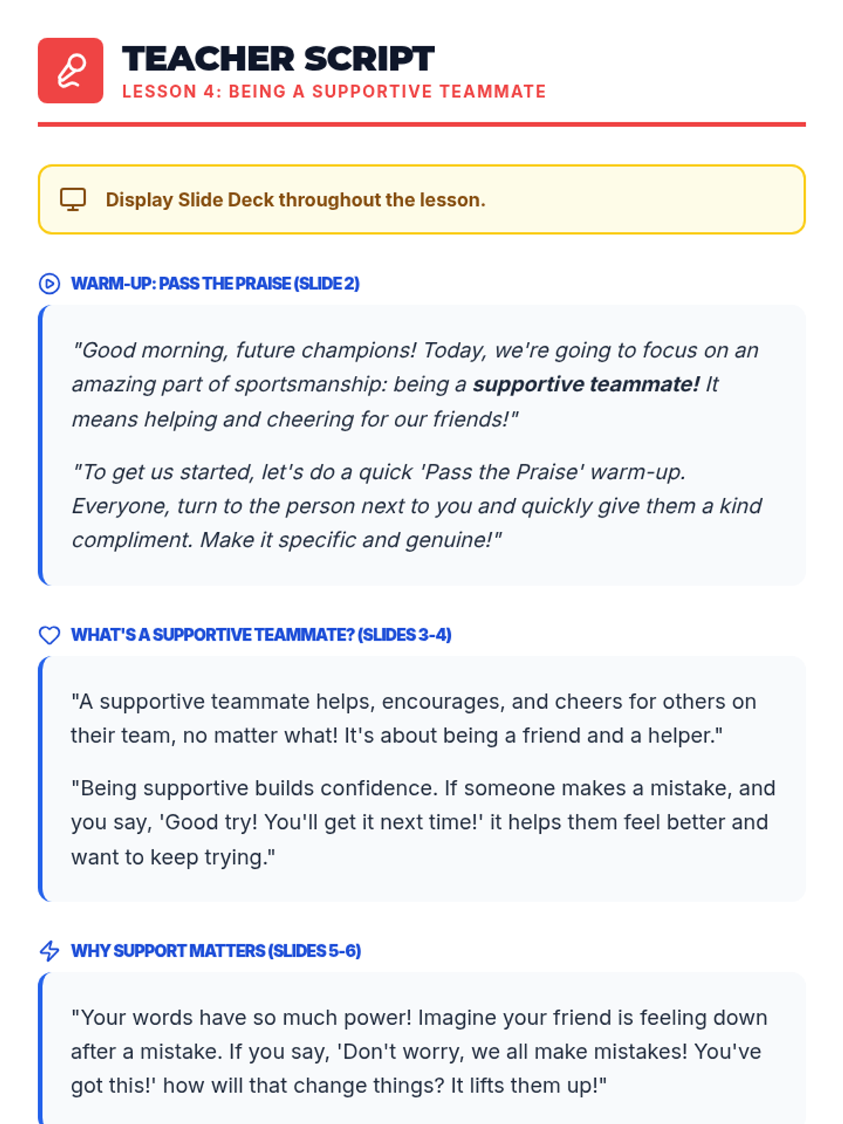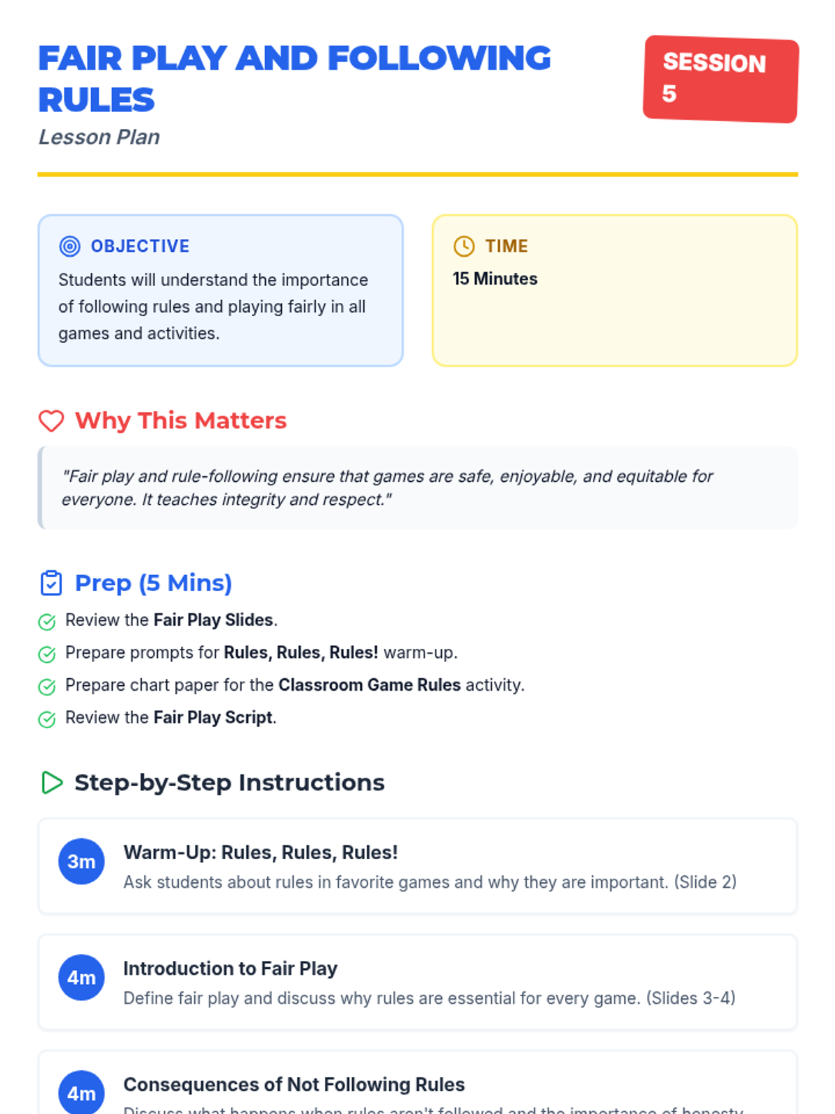 A series of five 15-minute mini-lessons for 2nd graders focused on developing positive sportsmanship, effective communication, and supportive teamwork through interactive activities and discussions.
