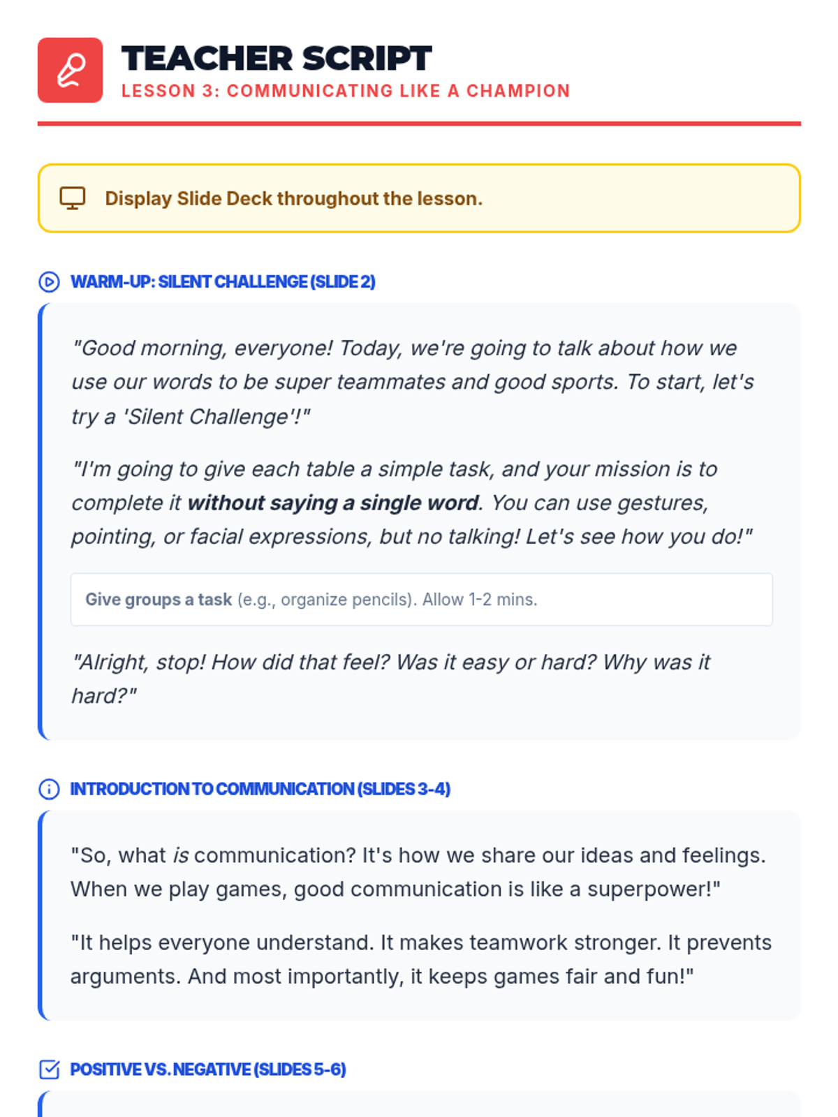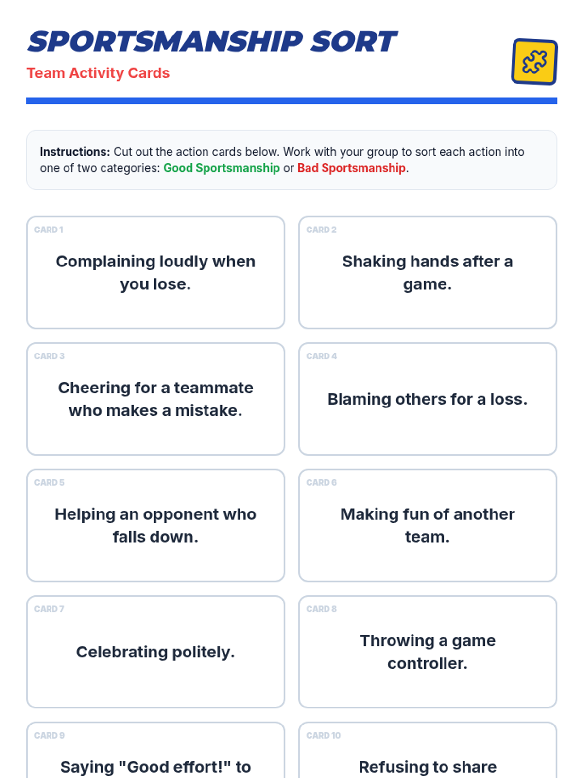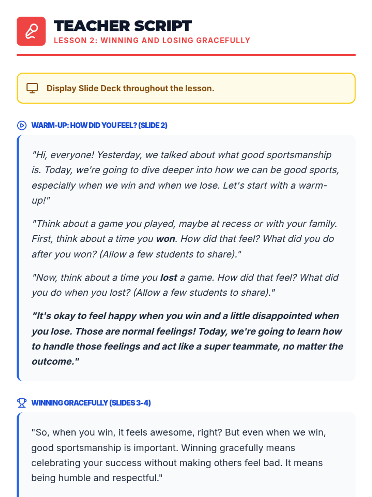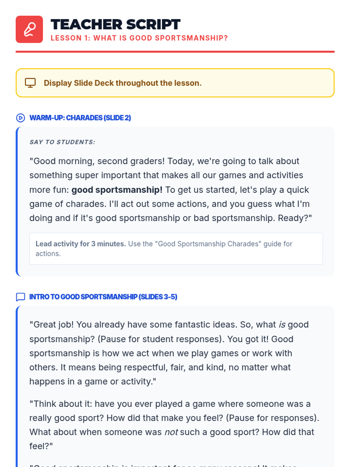 A series of five 15-minute mini-lessons for 2nd graders focused on developing positive sportsmanship, effective communication, and supportive teamwork through interactive activities and discussions.