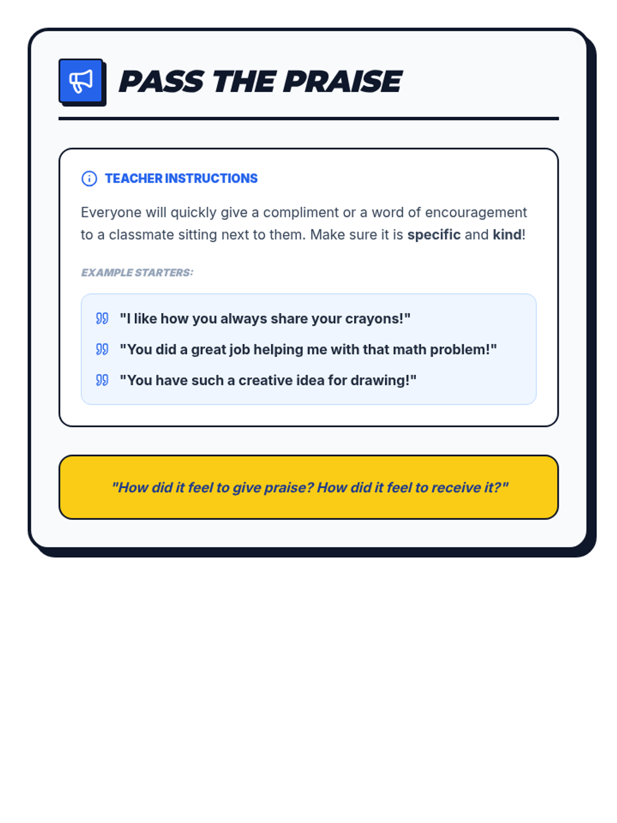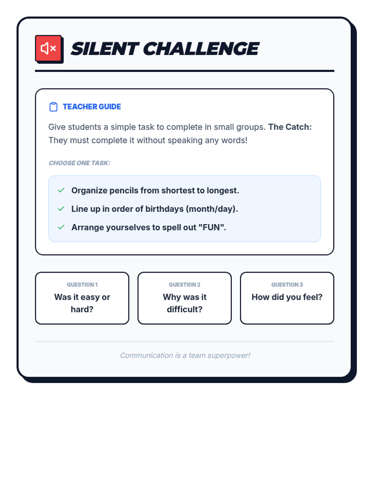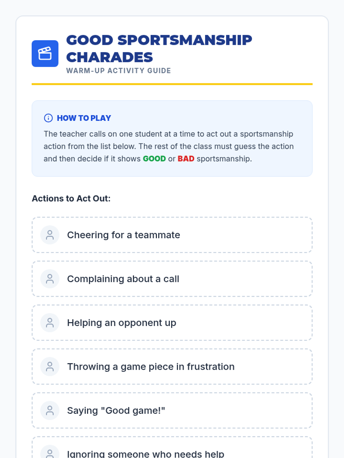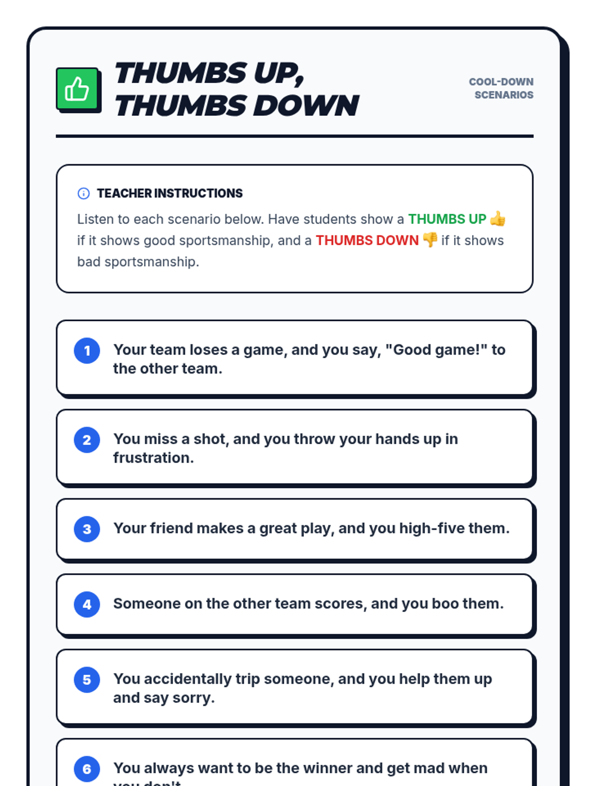 A series of five 15-minute mini-lessons for 2nd graders focused on developing positive sportsmanship, effective communication, and supportive teamwork through interactive activities and discussions.