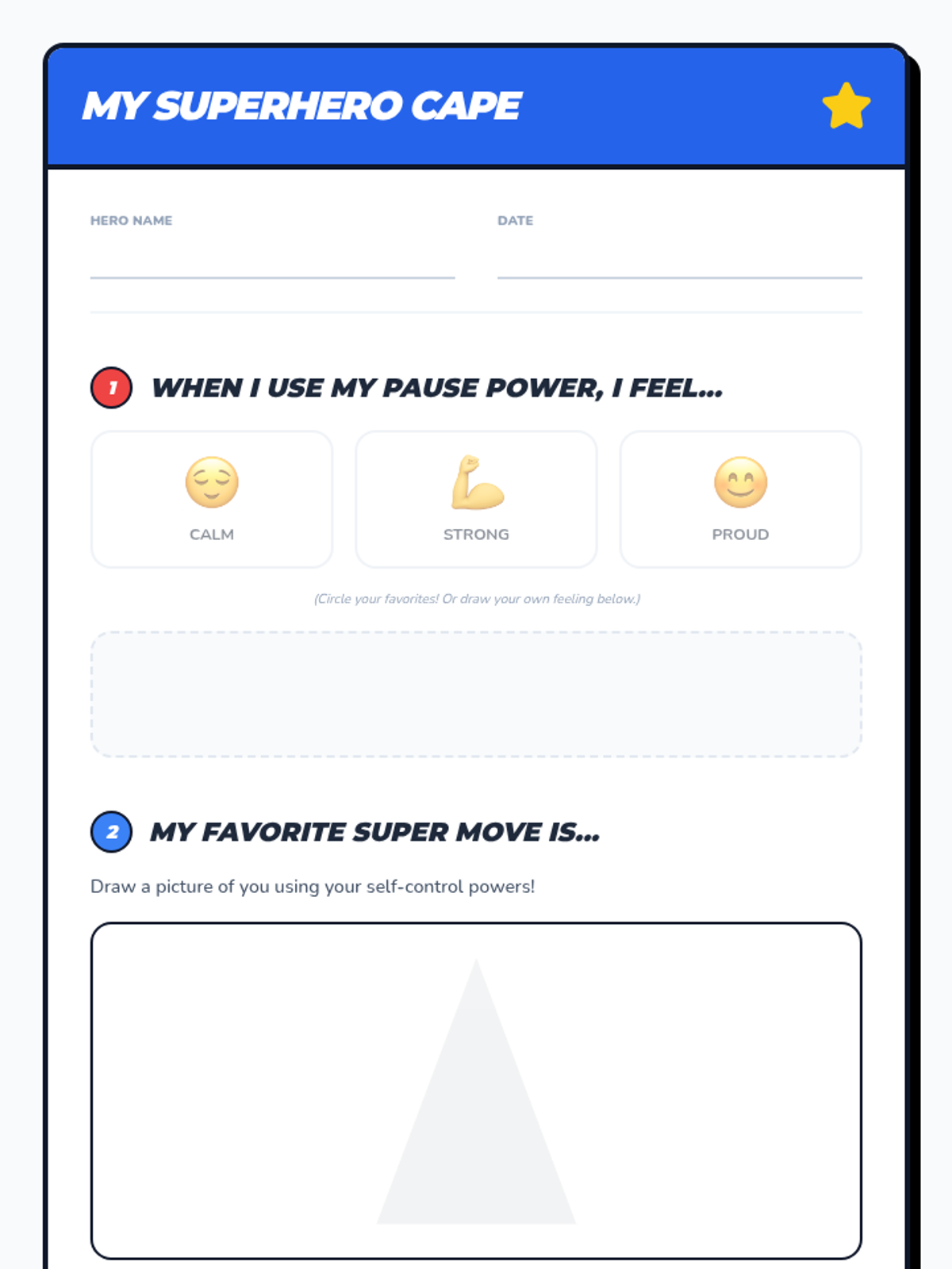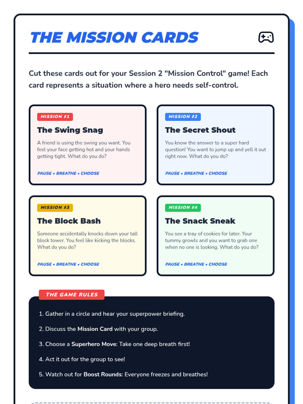 A two-session sequence for kindergarteners focusing on self-control, impulsivity, and following directions using a fun superhero theme. Students learn to 'pause, breathe, and choose' through role-playing and interactive games.
