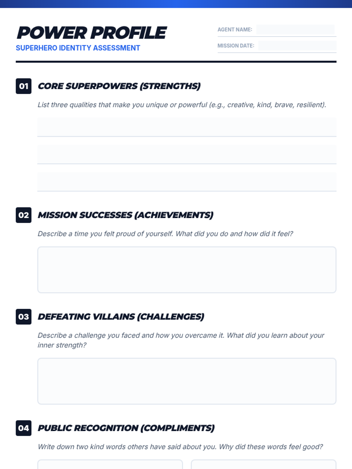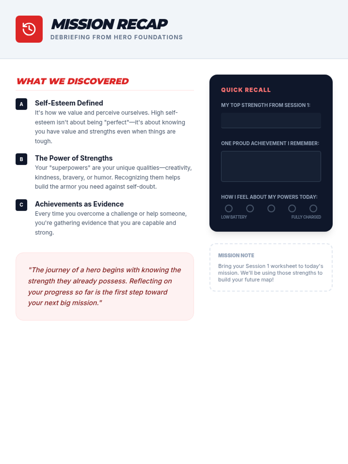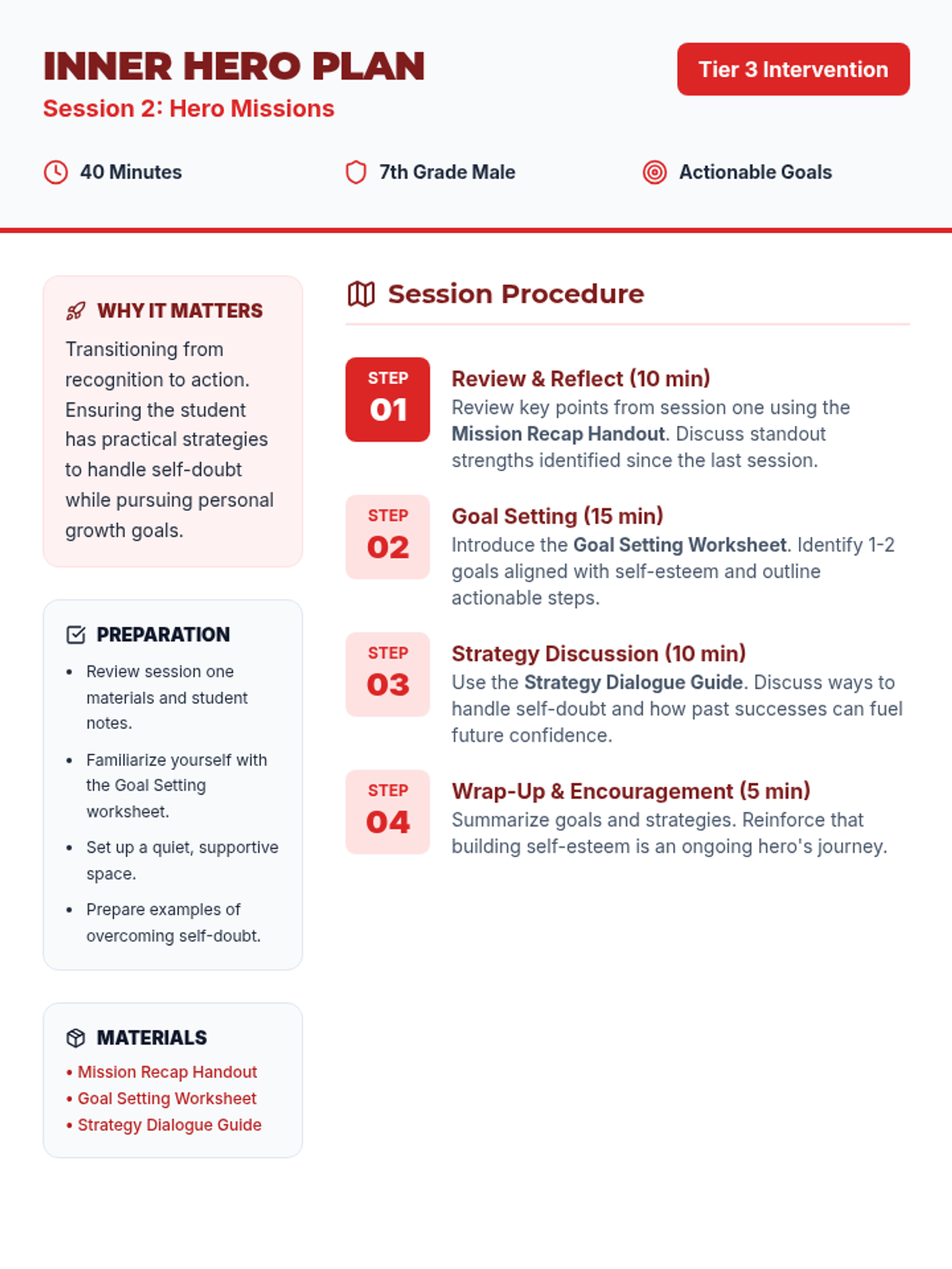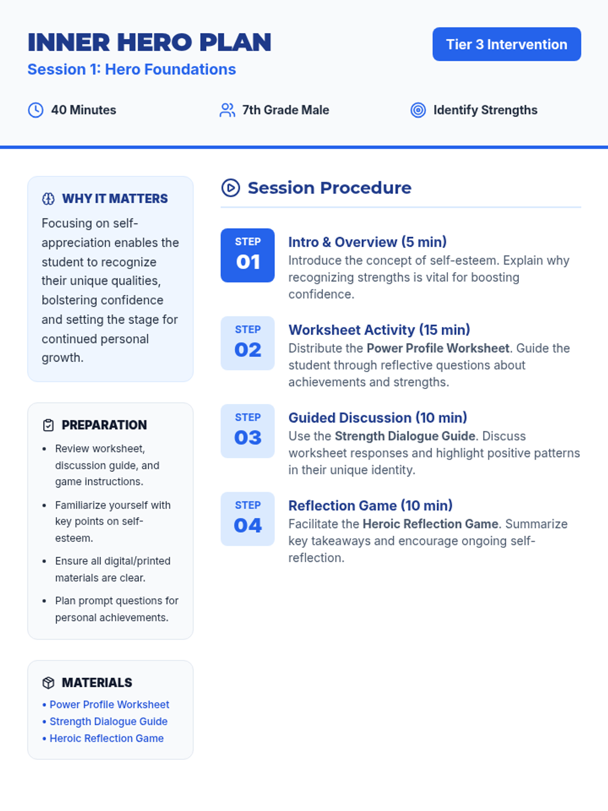 A two-session Tier 3 intervention for a 7th-grade male student focused on building self-esteem through a superhero-themed exploration of personal strengths, achievements, and goal setting.