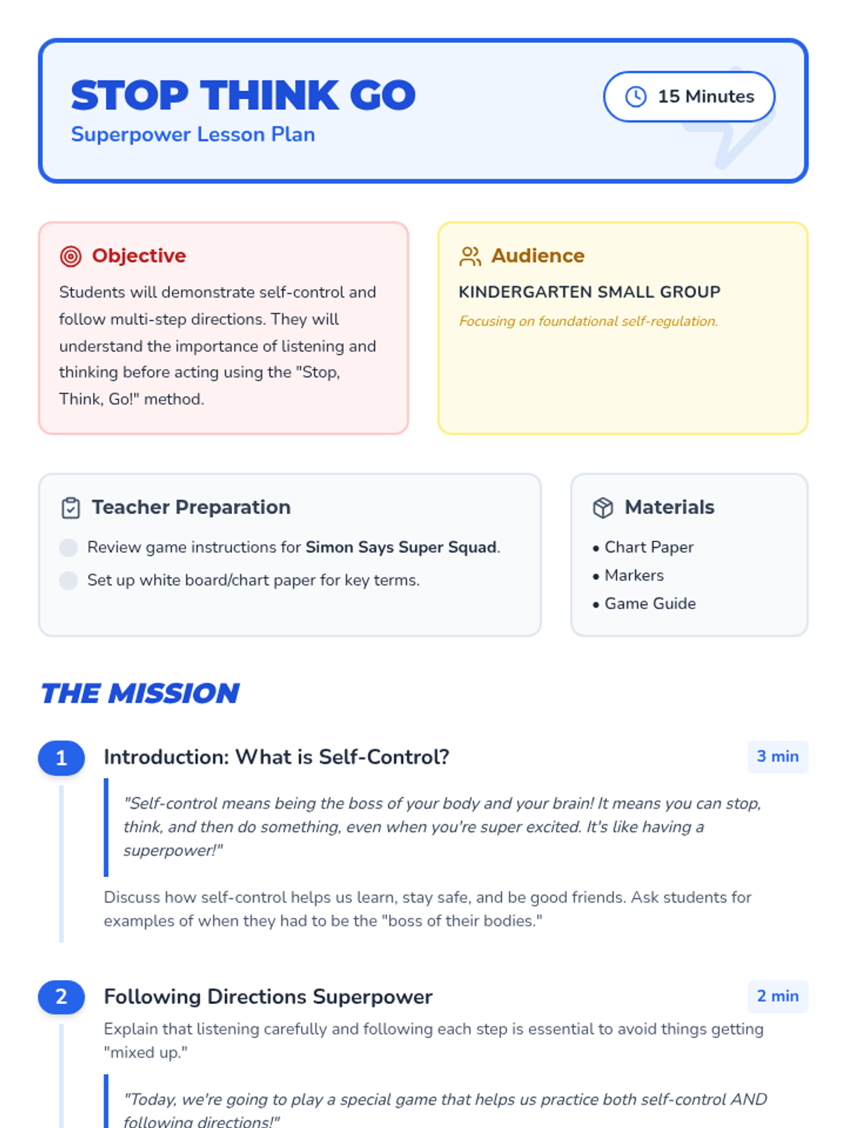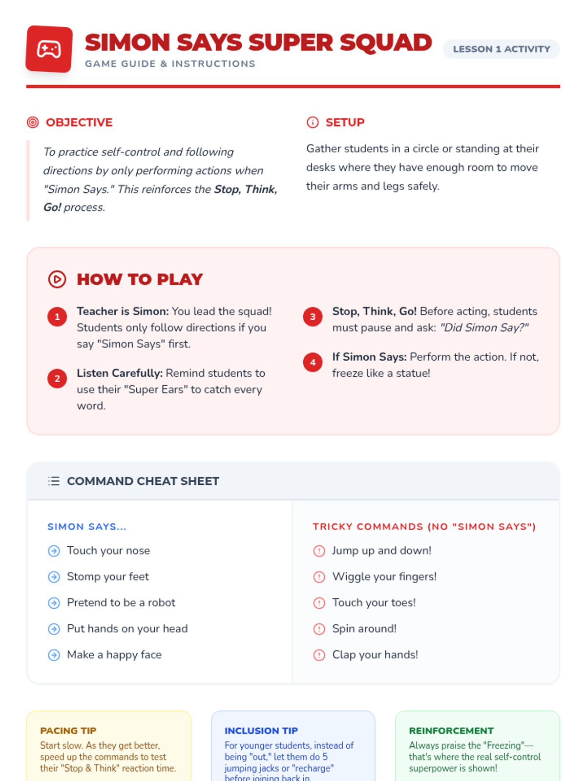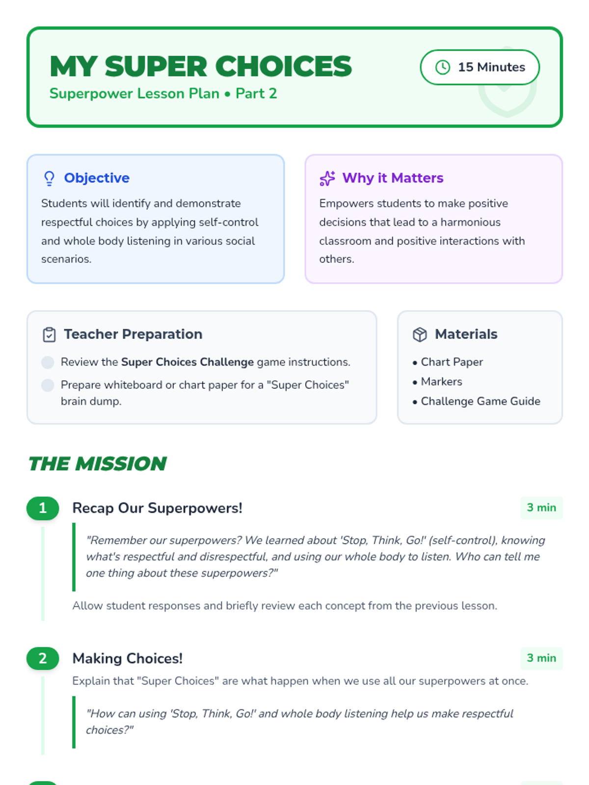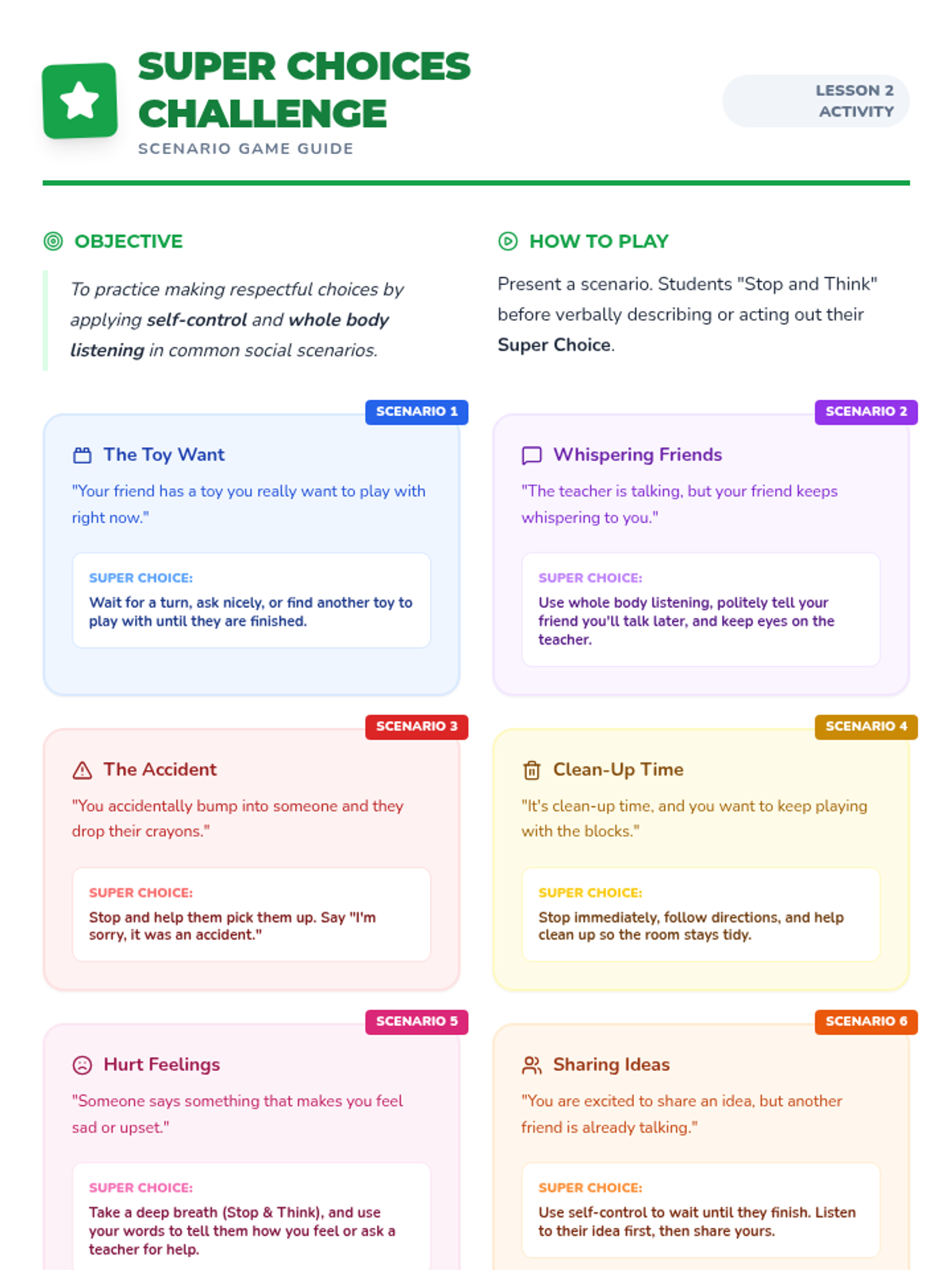 A two-part series for Kindergarteners focused on developing self-control, listening skills, and making respectful decisions through interactive games and comic-themed adventures.
