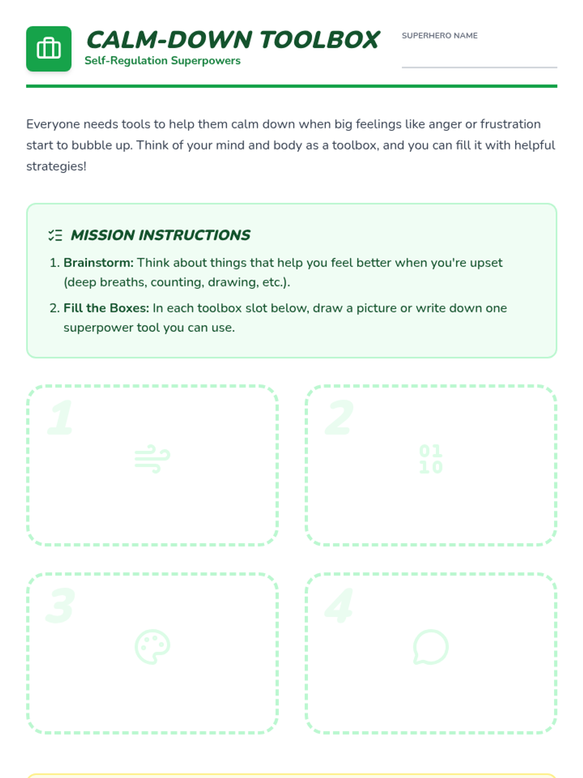An 8-week individual counseling program for a 3rd-grade boy with Oppositional Defiant Disorder (ODD) focused on developing self-regulation skills through a superhero theme. Sessions are 30 minutes each and cover identifying emotions, physical warning signs, triggers, and coping strategies.