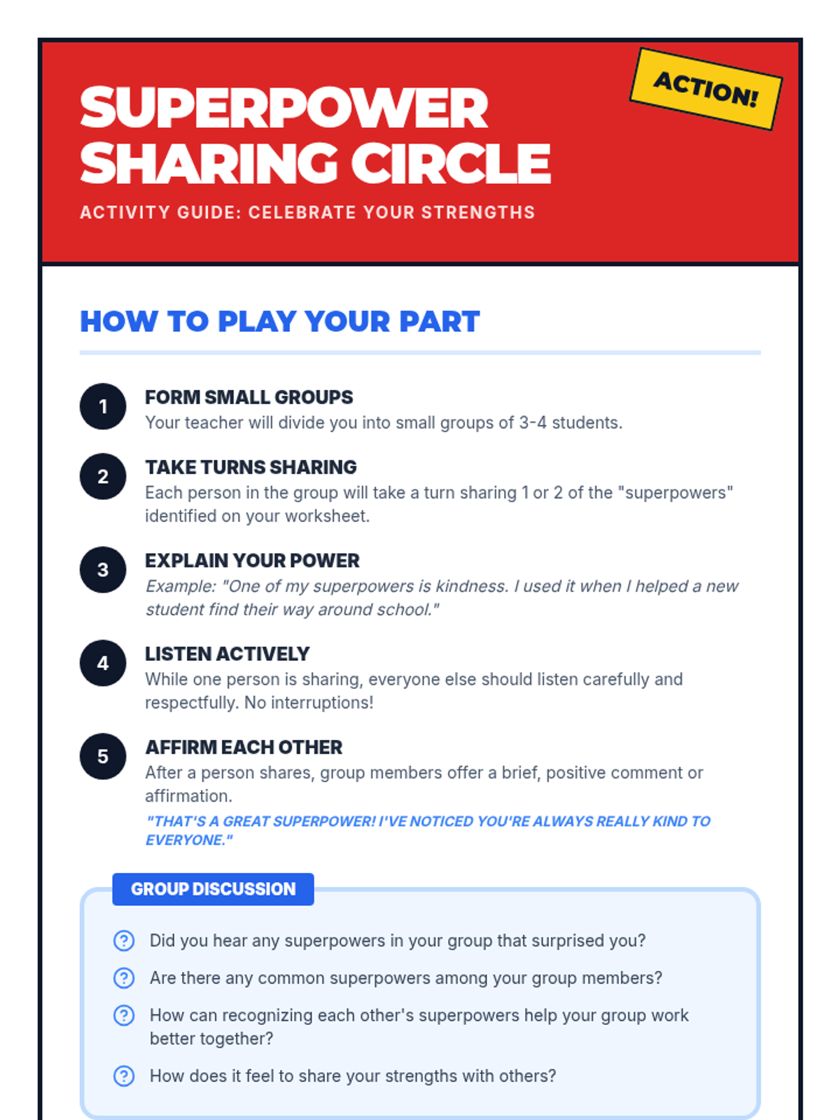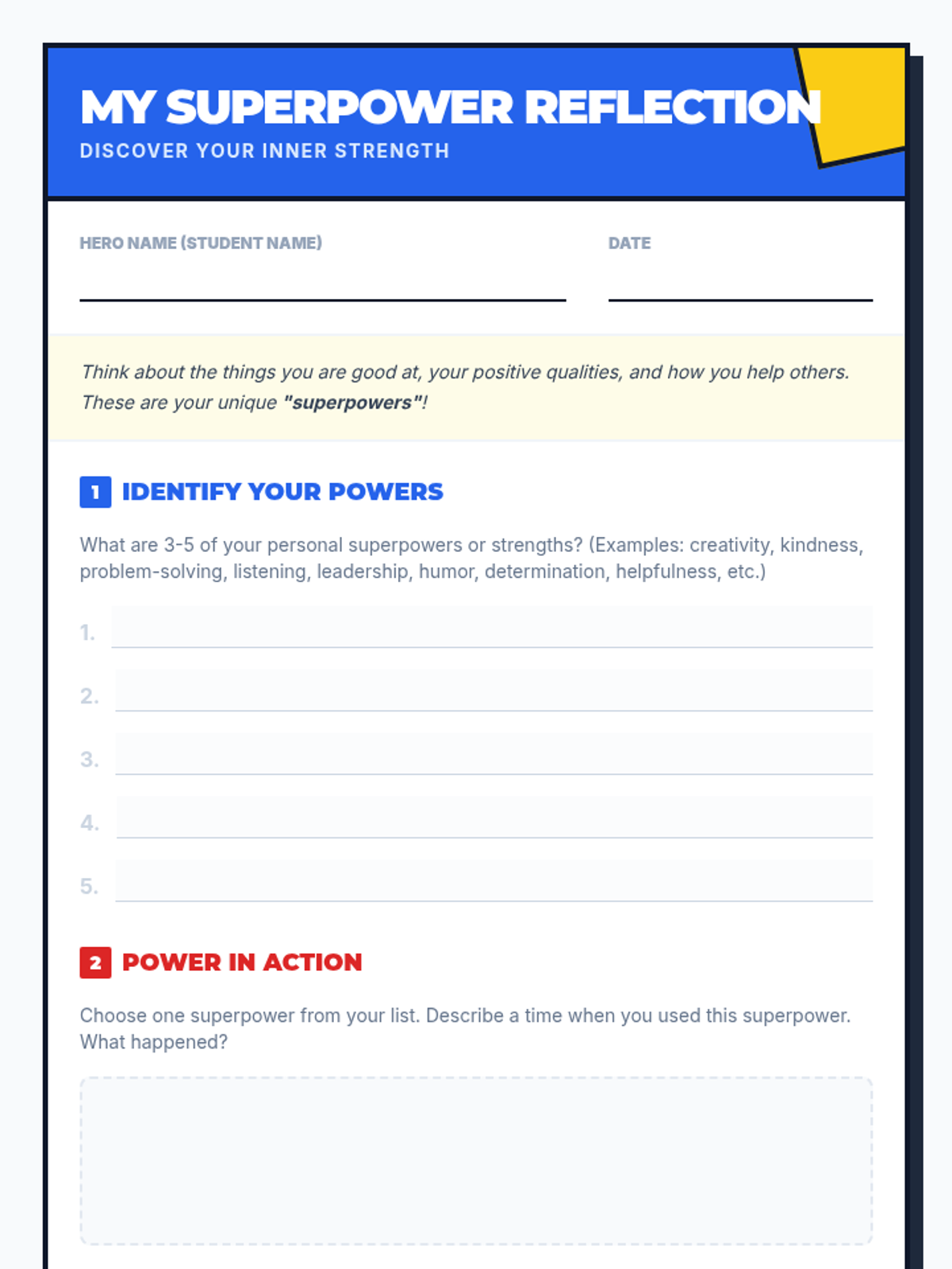 A sequence of lessons designed for different grade levels (K-2 and Middle School) to help students discover their inner strengths and "superpowers."