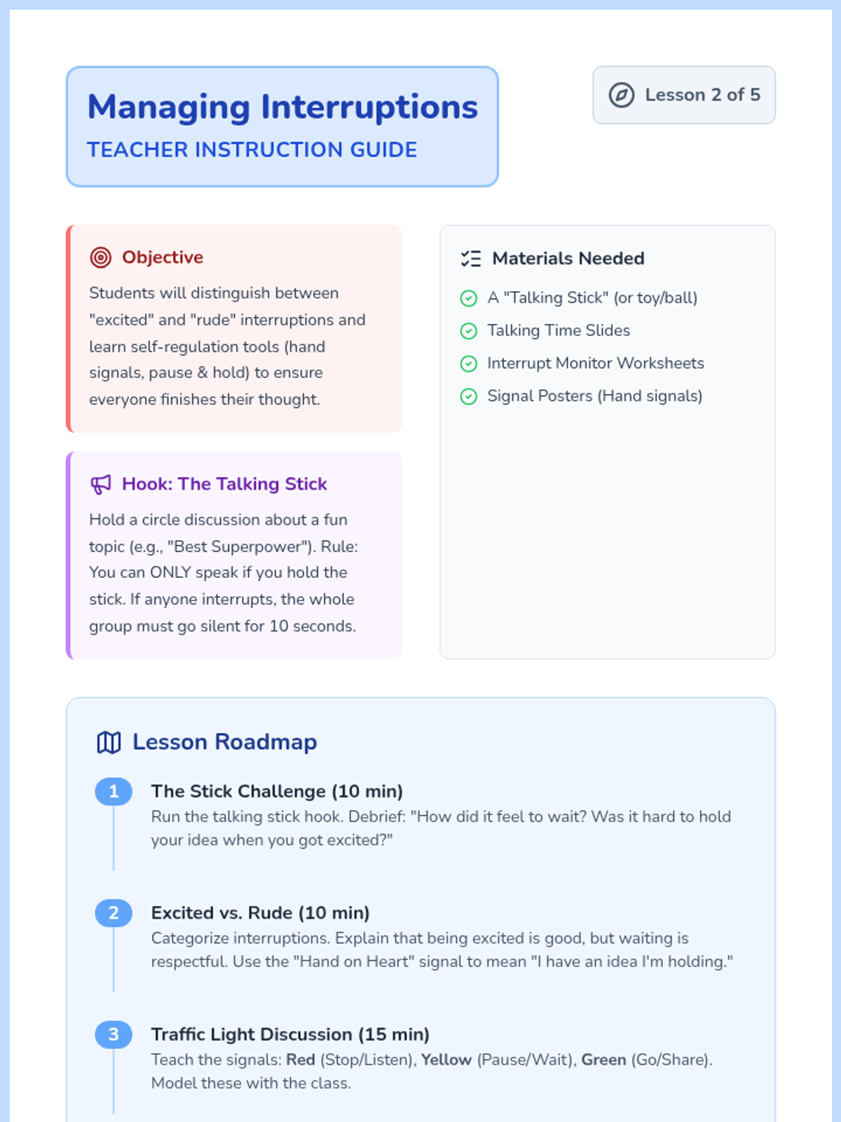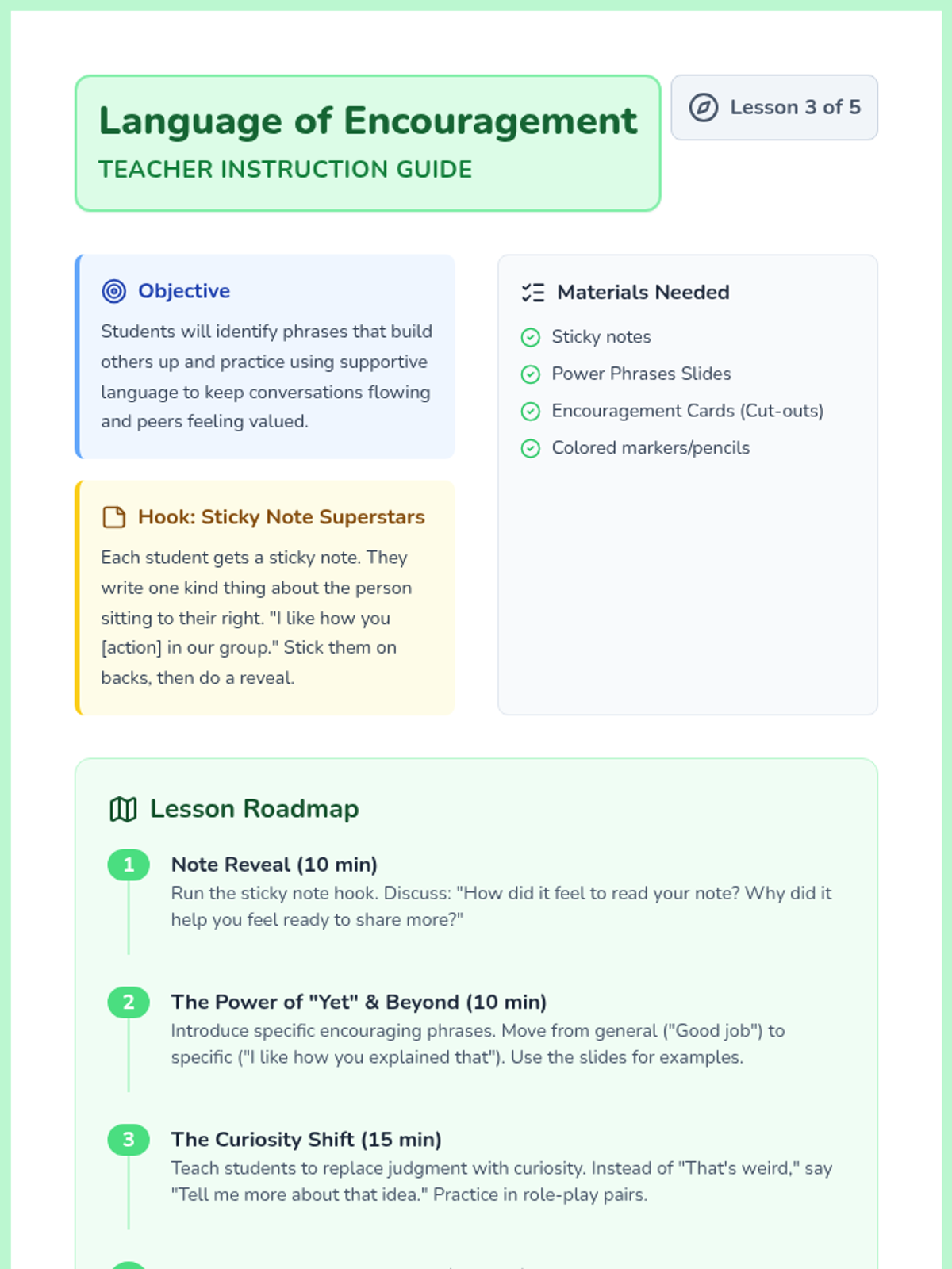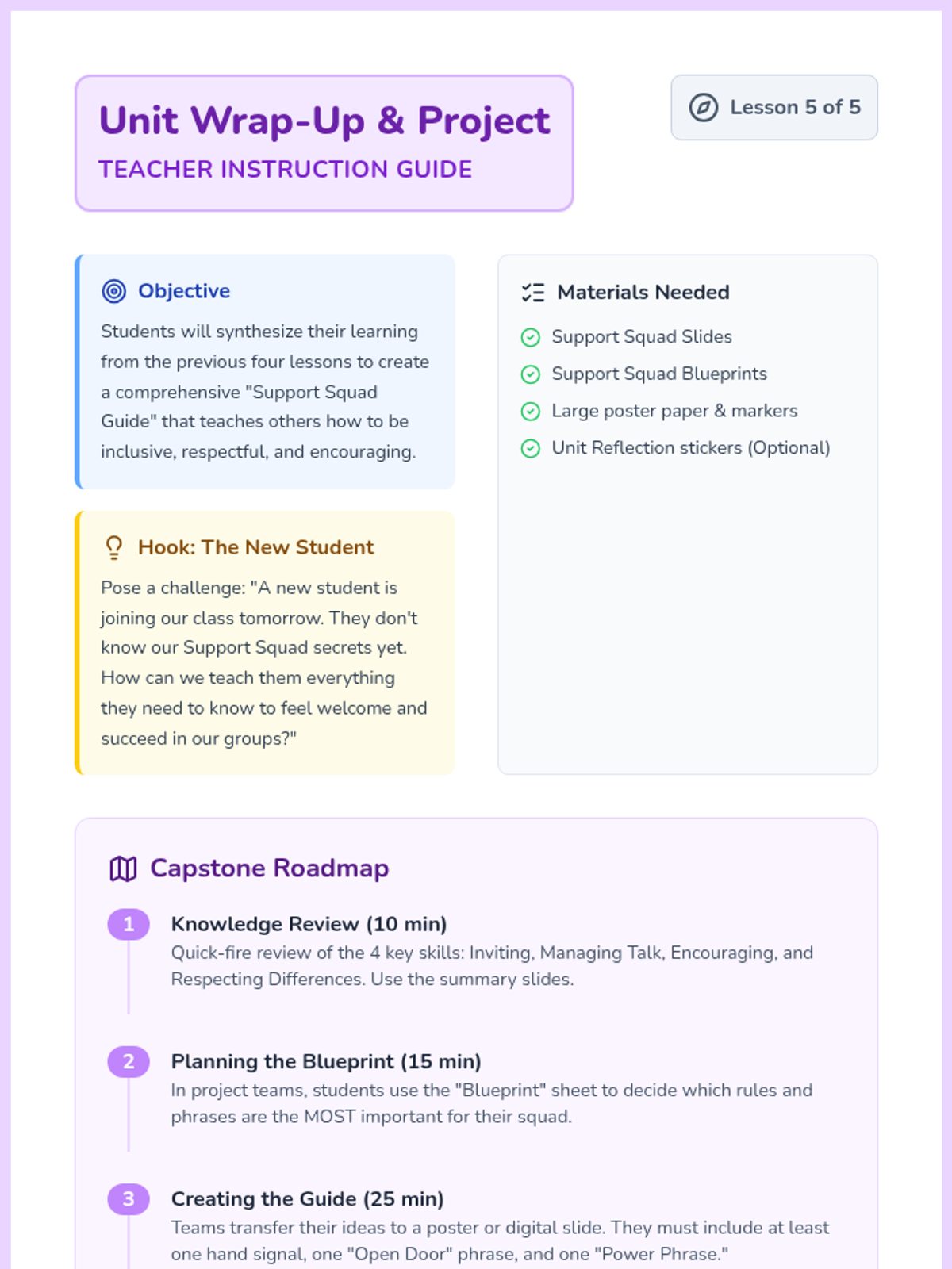A 5-lesson sequence for 3rd graders focused on building inclusive, encouraging, and respectful group dynamics. Students learn to invite others in, manage interruptions, use encouraging language, and navigate disagreements while maintaining a supportive environment.