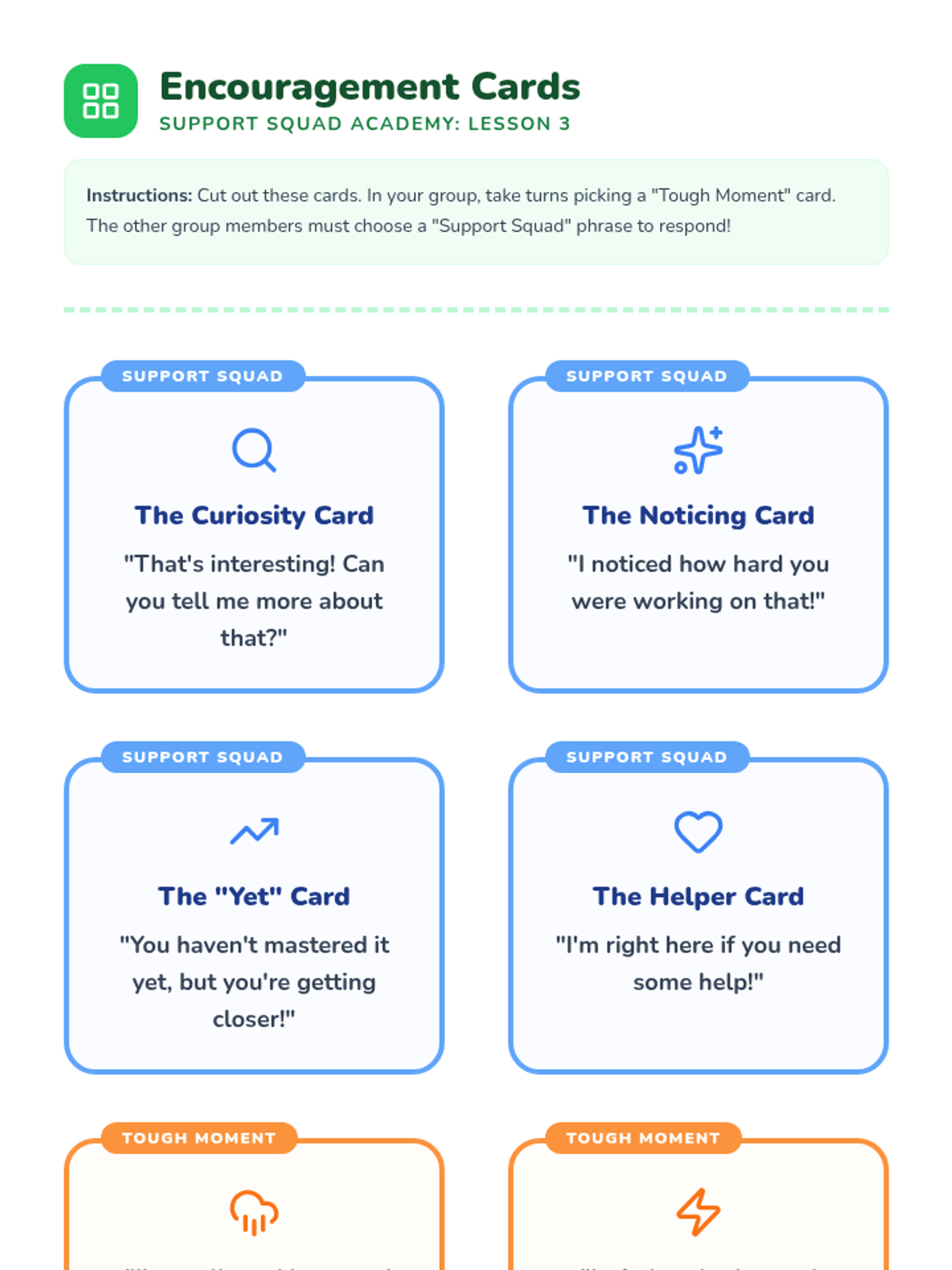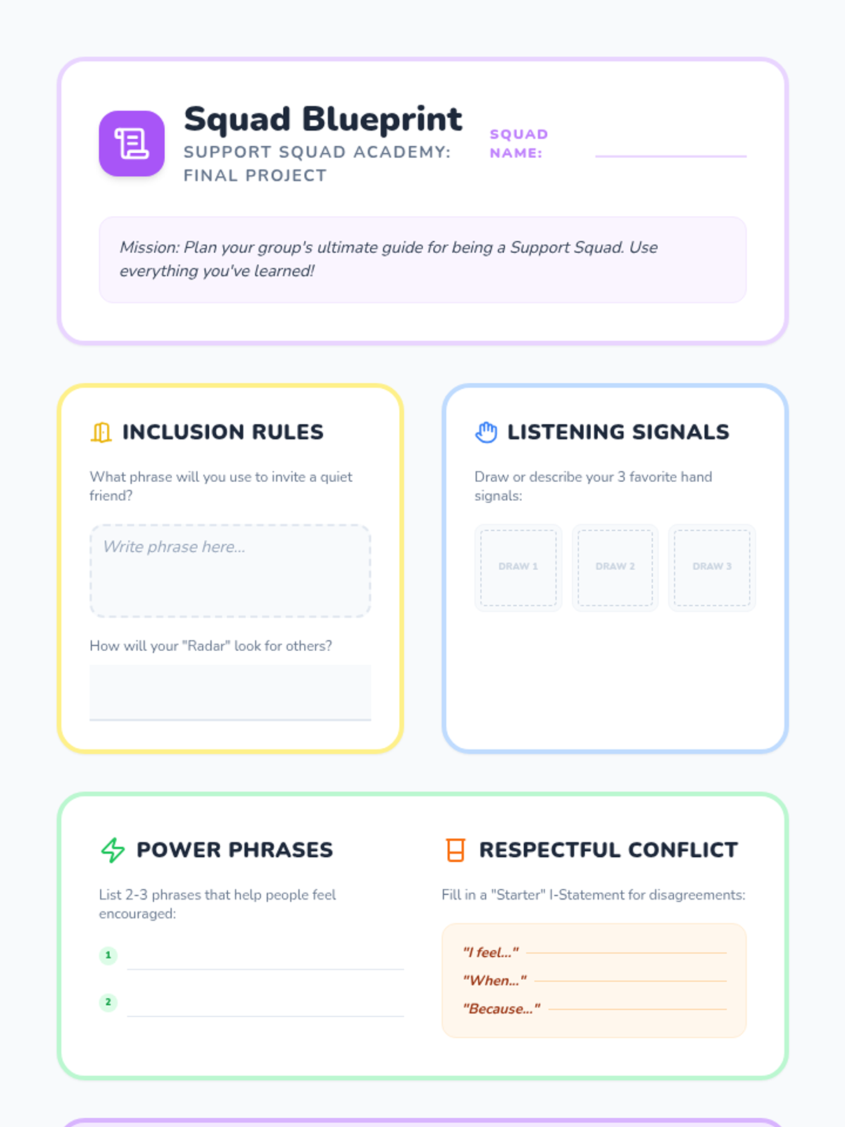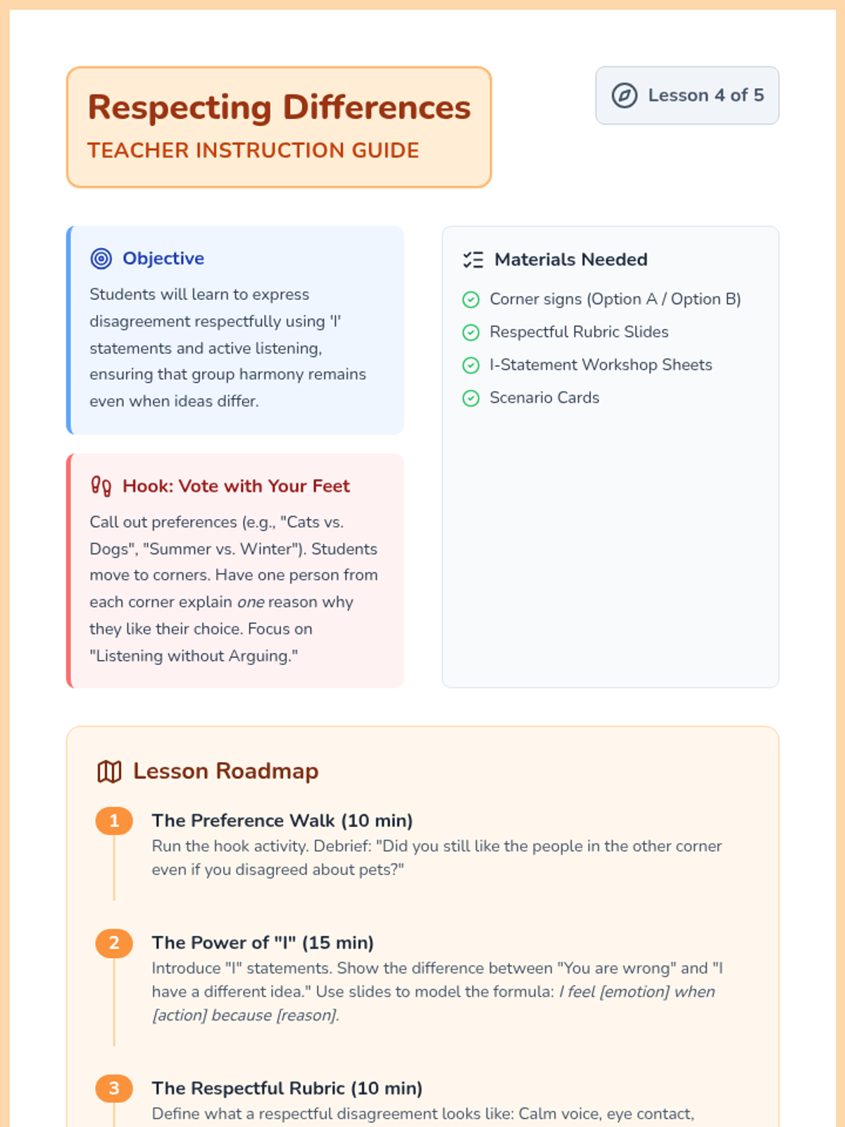 A 5-lesson sequence for 3rd graders focused on building inclusive, encouraging, and respectful group dynamics. Students learn to invite others in, manage interruptions, use encouraging language, and navigate disagreements while maintaining a supportive environment.