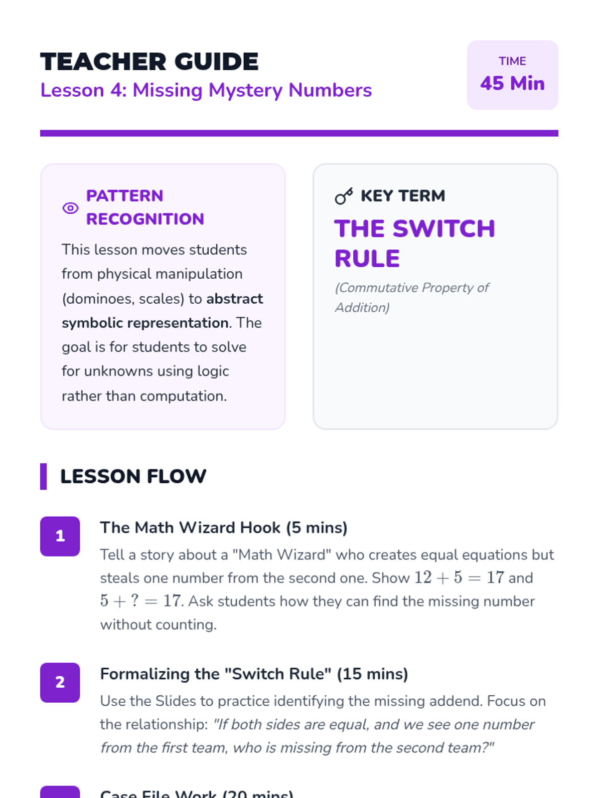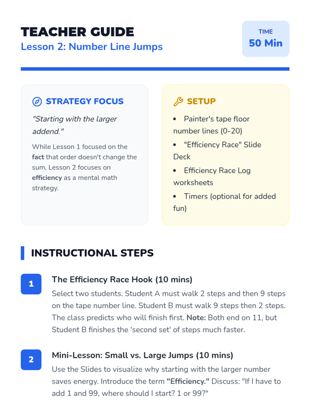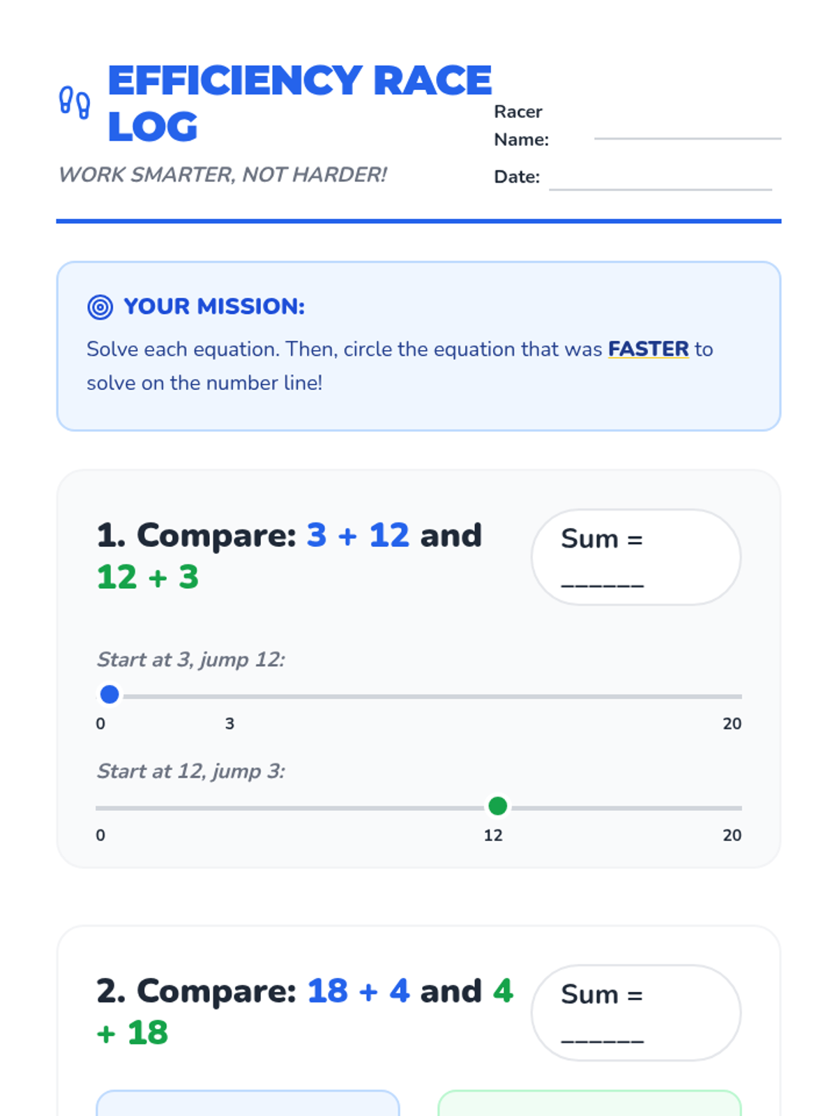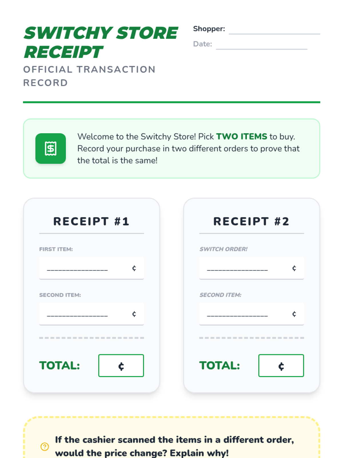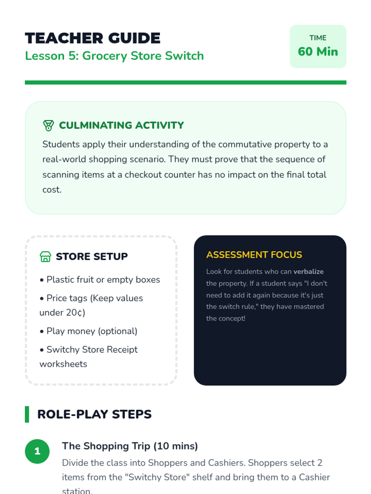 A 2nd-grade inquiry-based unit where students investigate the commutative property of addition through dominoes, number lines, balance scales, and real-world grocery scenarios. Students discover that the order of addends does not change the sum and use this knowledge to improve mental math efficiency.