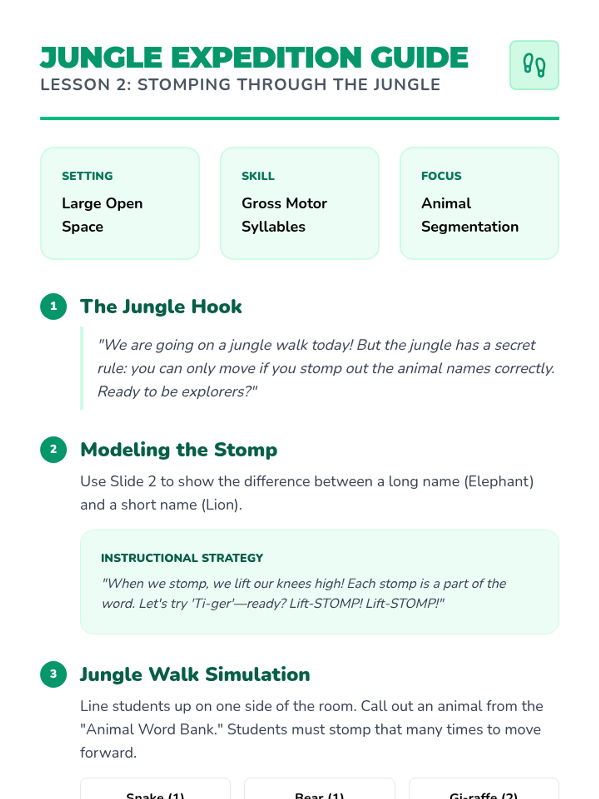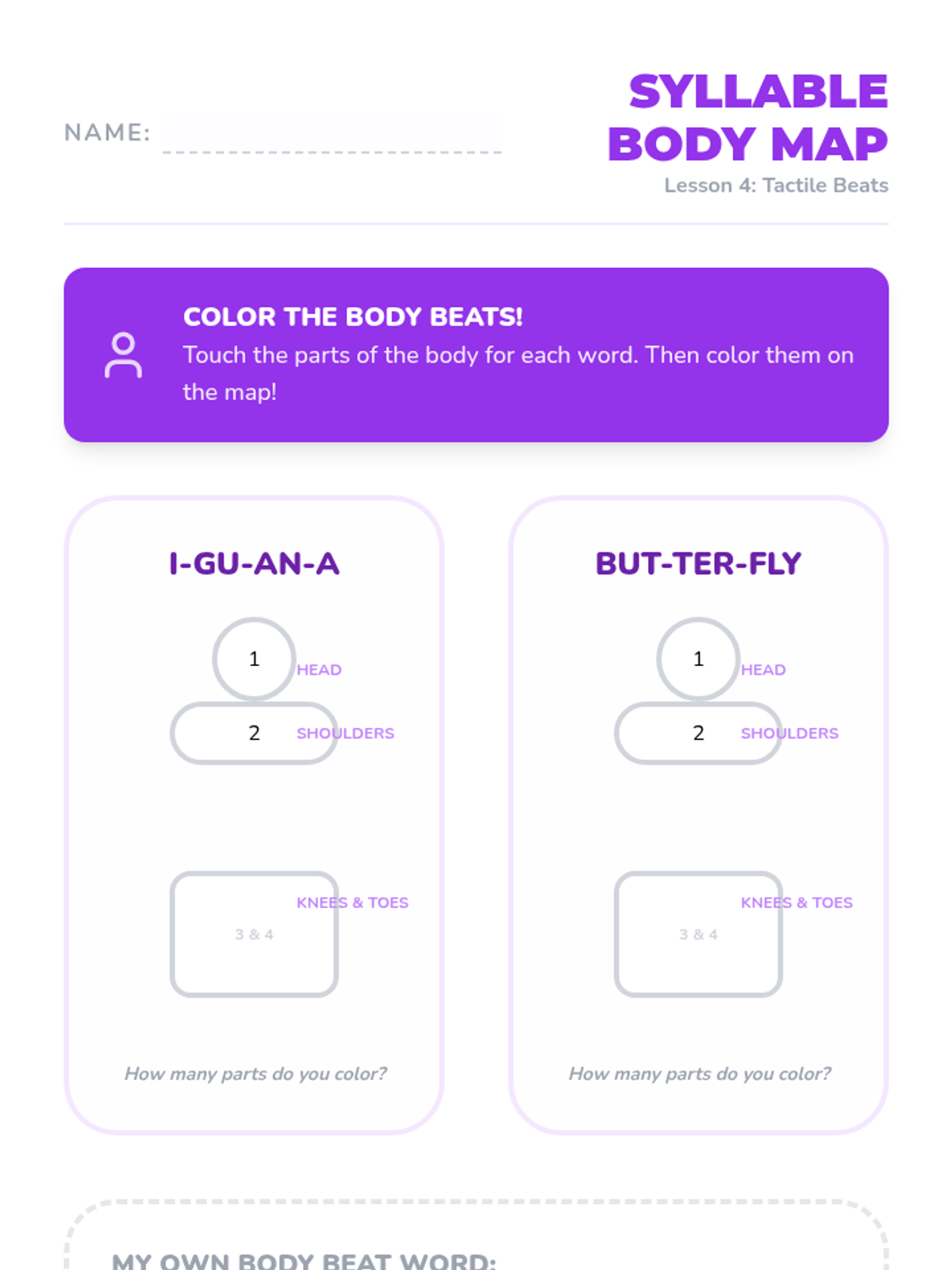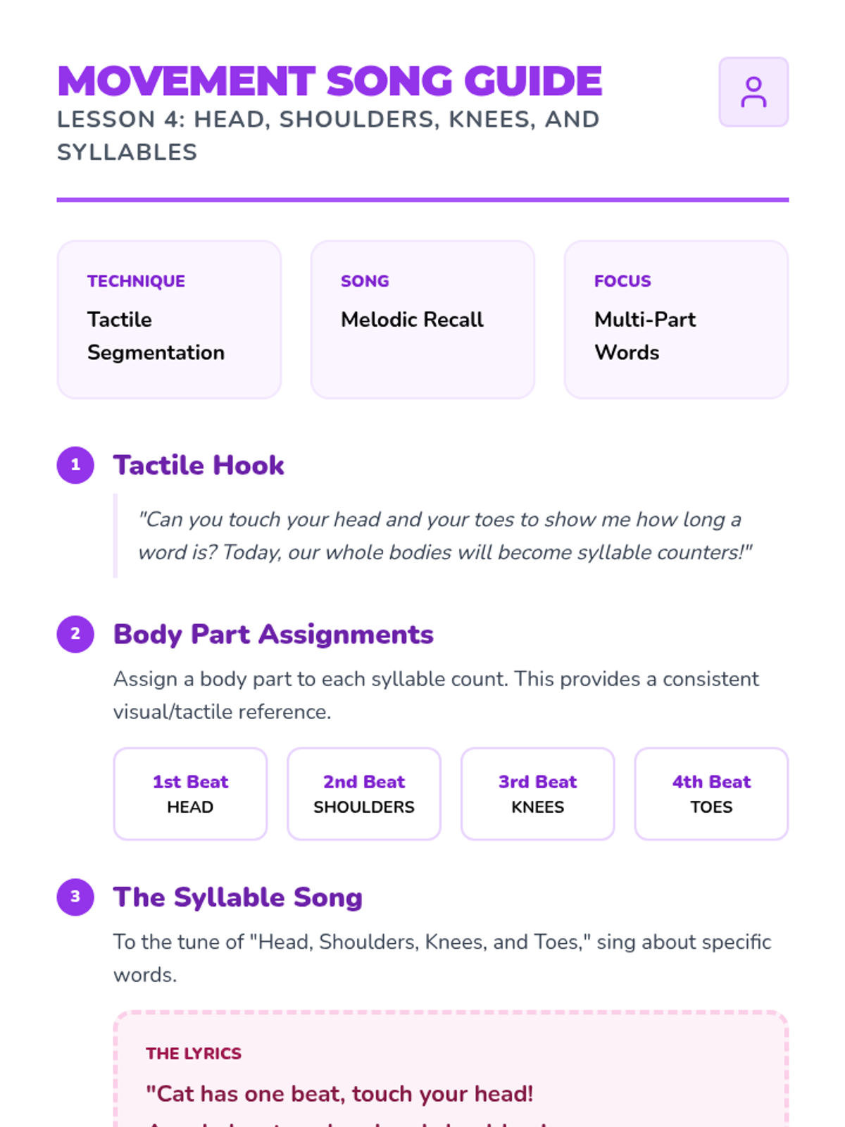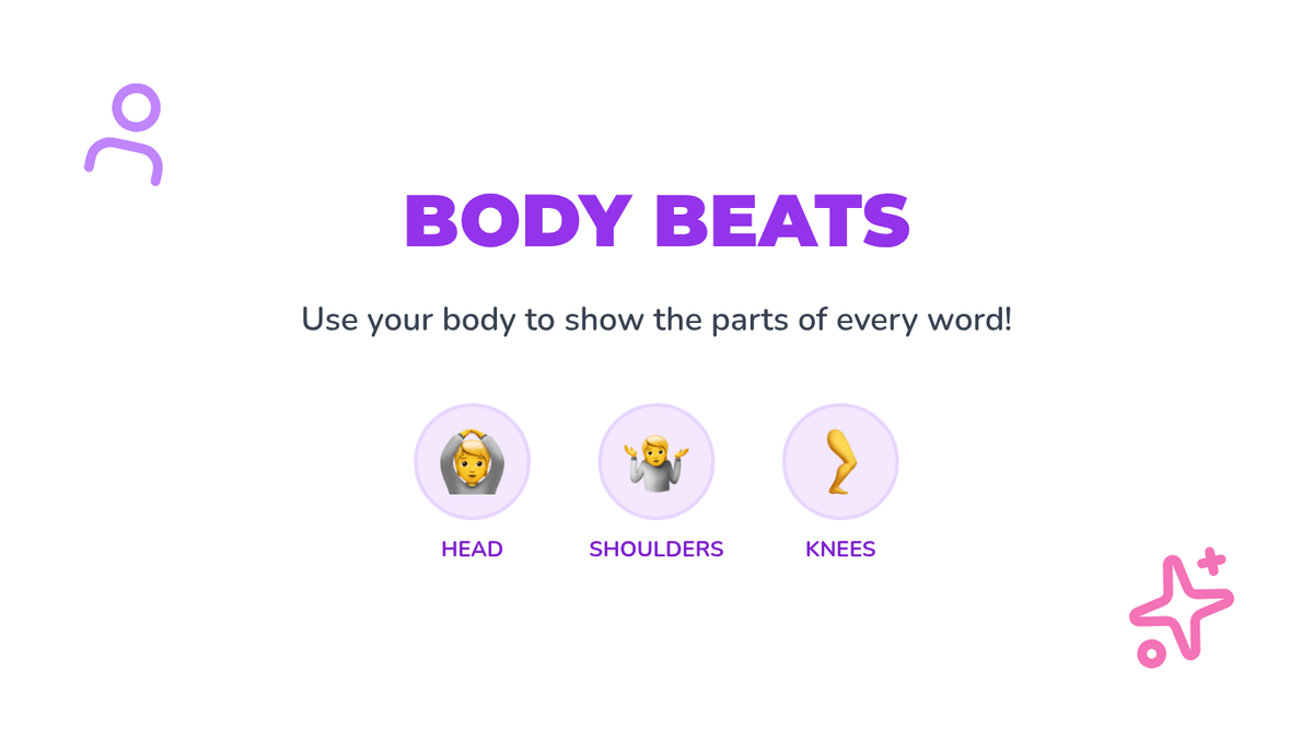 A Pre-K phonics sequence that uses rhythmic movement, gross motor skills, and musical elements to teach students how to identify and count syllables in words. Students progress from clapping names to stomping animal names and drumming out classroom objects.
