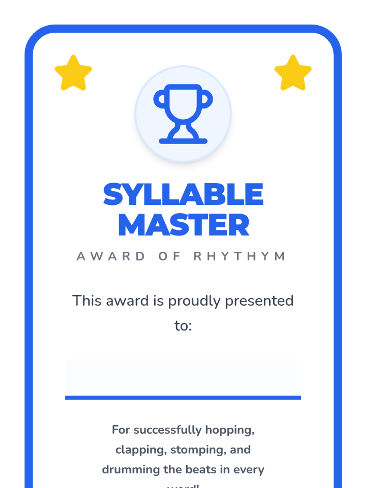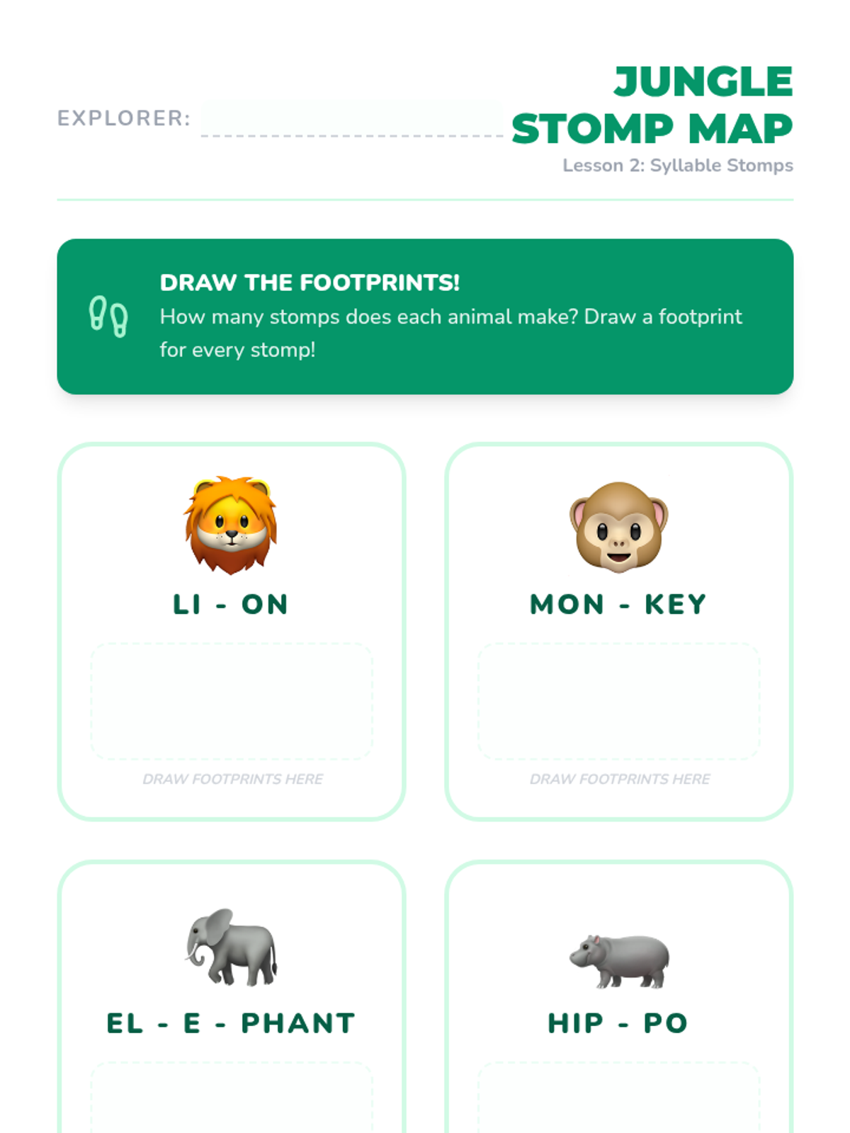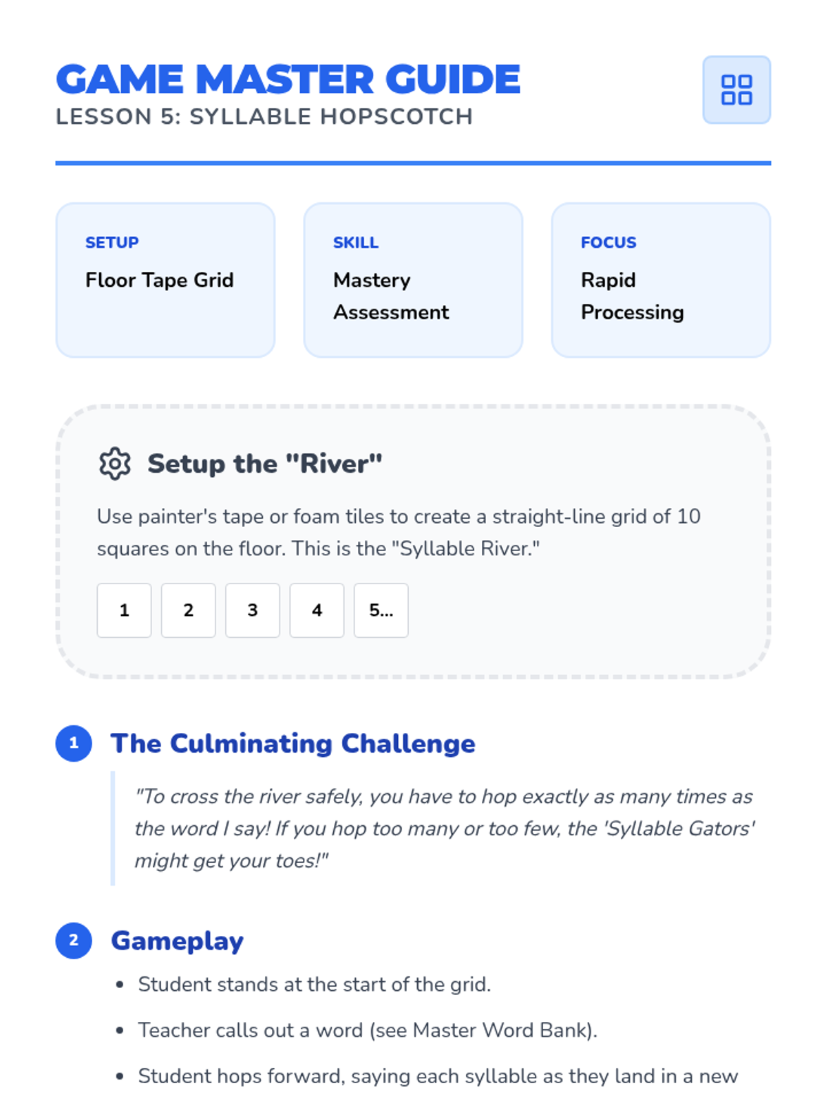 A Pre-K phonics sequence that uses rhythmic movement, gross motor skills, and musical elements to teach students how to identify and count syllables in words. Students progress from clapping names to stomping animal names and drumming out classroom objects.