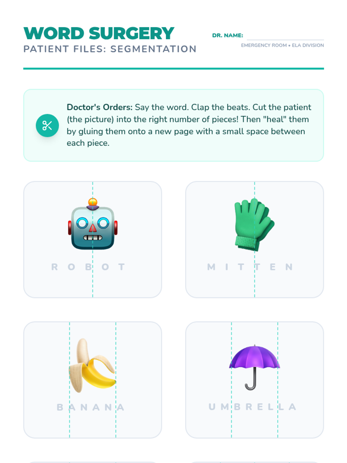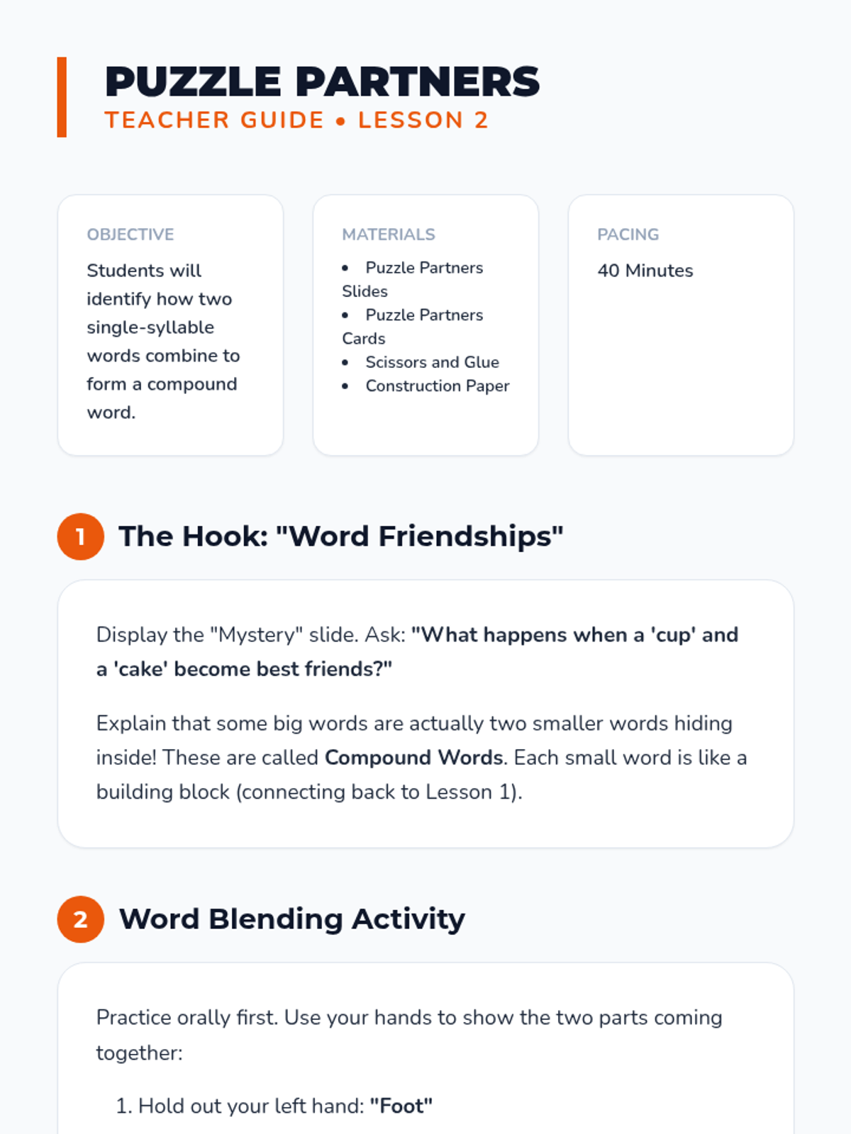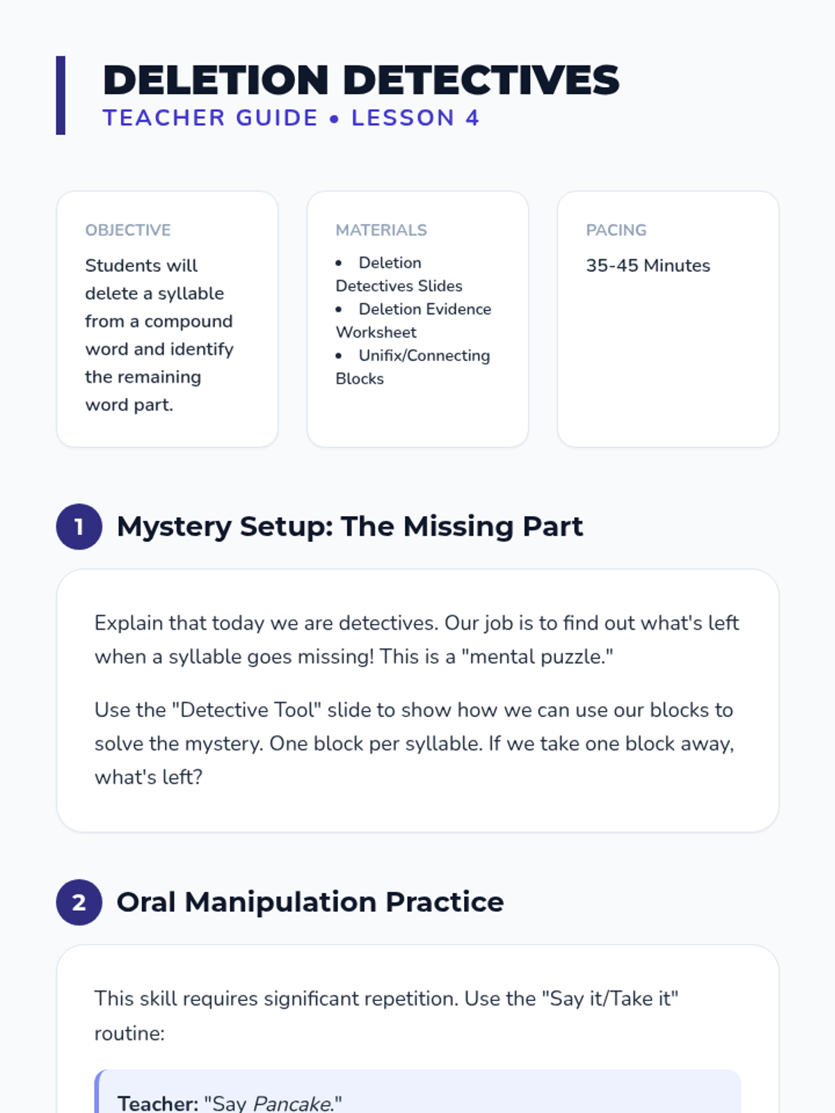 This Kindergarten ELA sequence uses concrete manipulatives and visual aids like blocks, puzzles, and 'surgery' kits to help students visualize and manipulate syllables, progressing from compound words to complex segmentation and deletion.