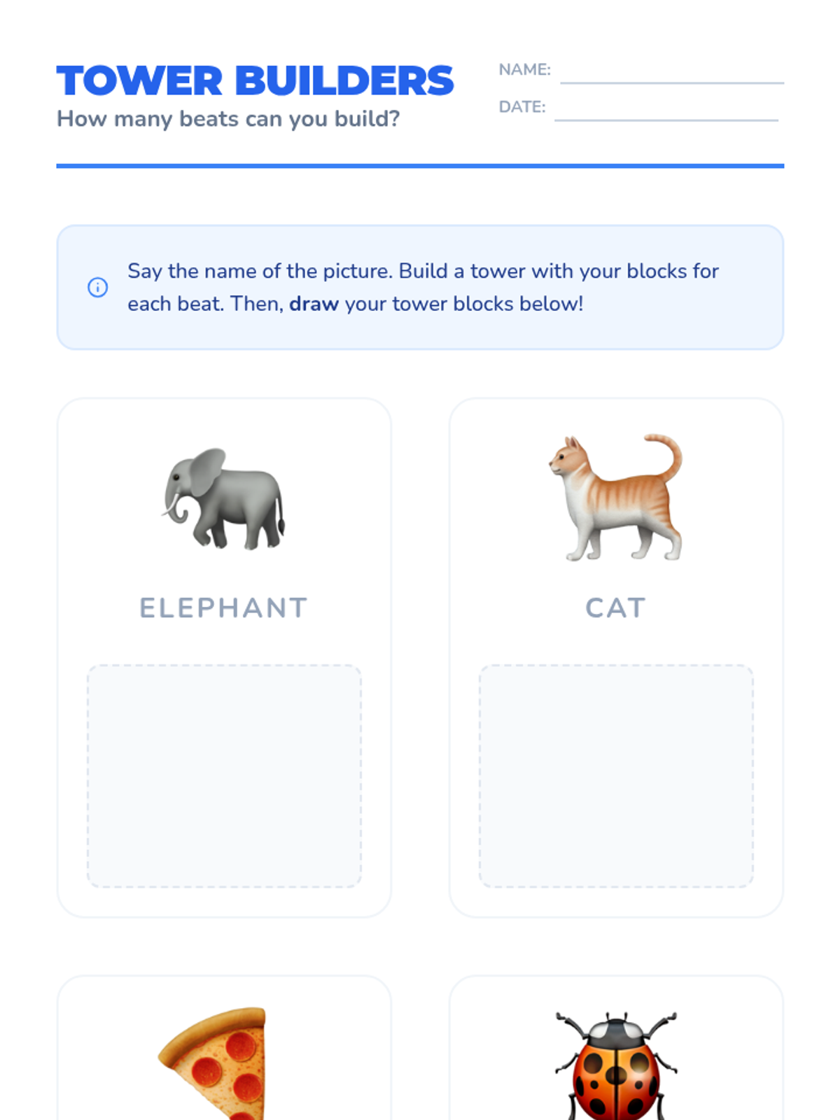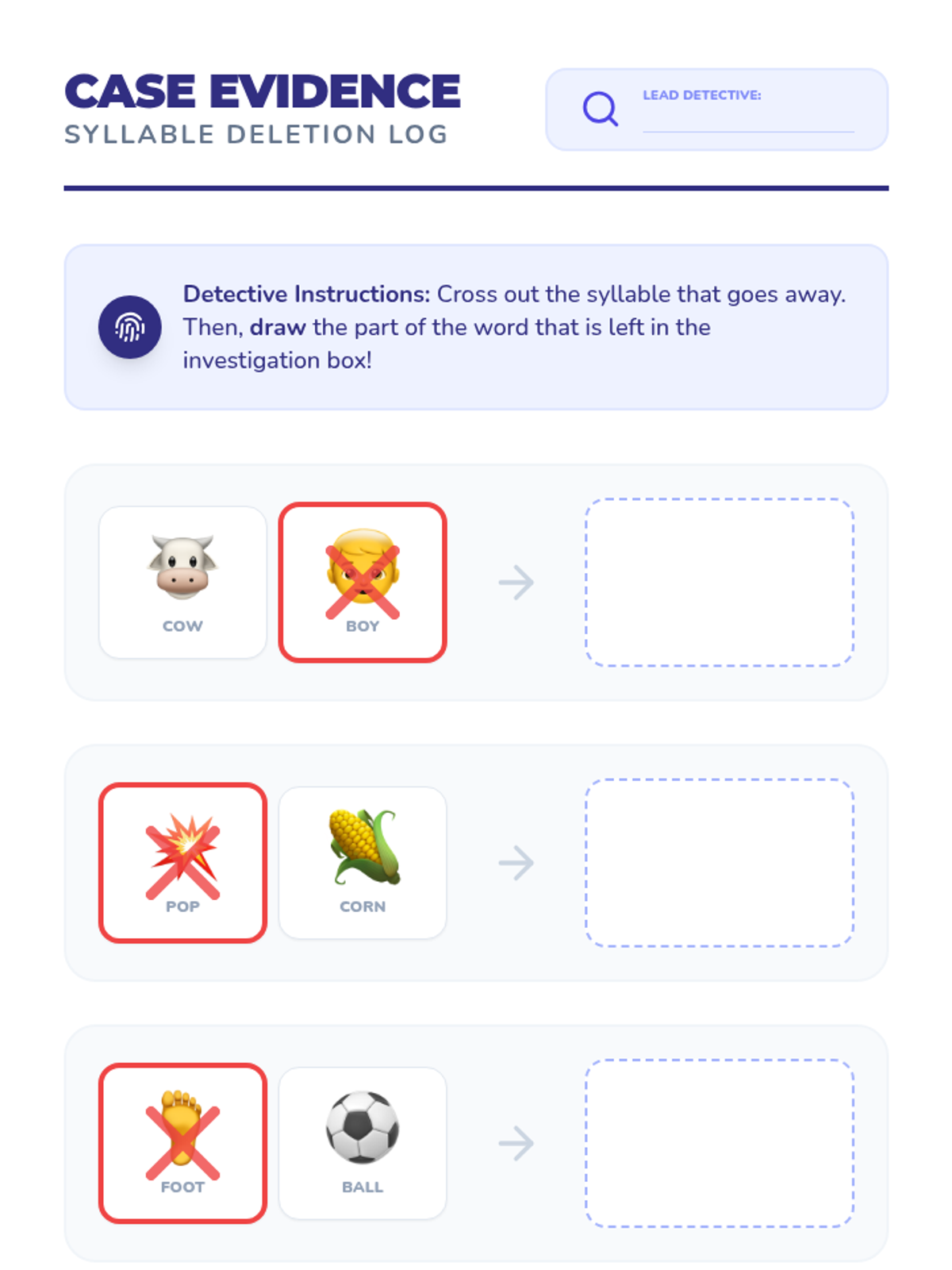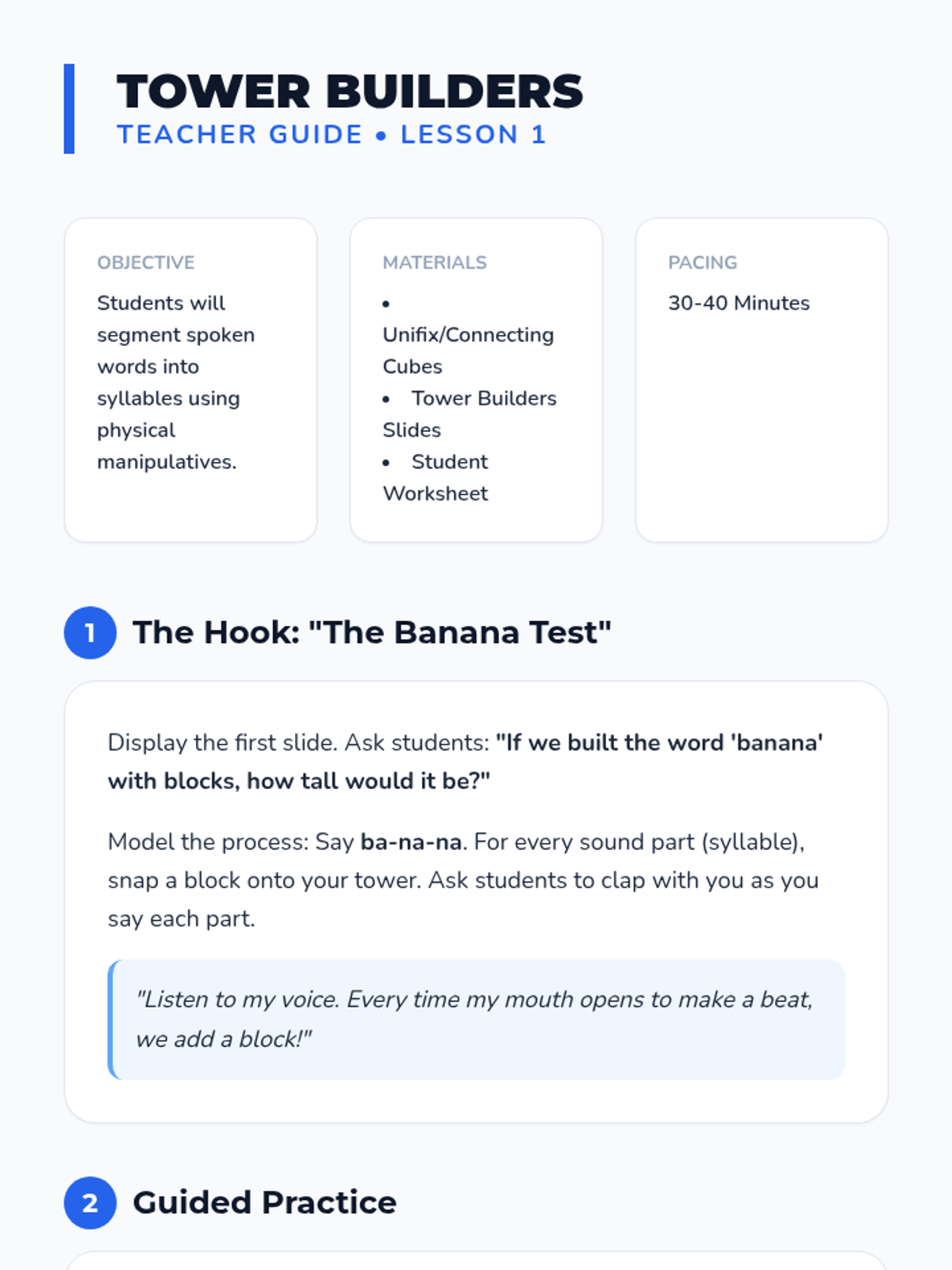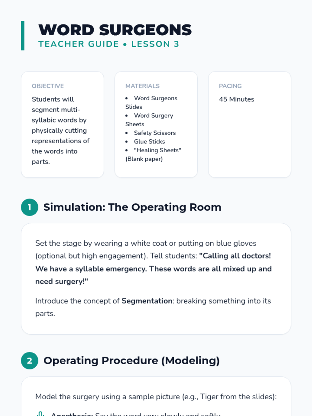 This Kindergarten ELA sequence uses concrete manipulatives and visual aids like blocks, puzzles, and 'surgery' kits to help students visualize and manipulate syllables, progressing from compound words to complex segmentation and deletion.