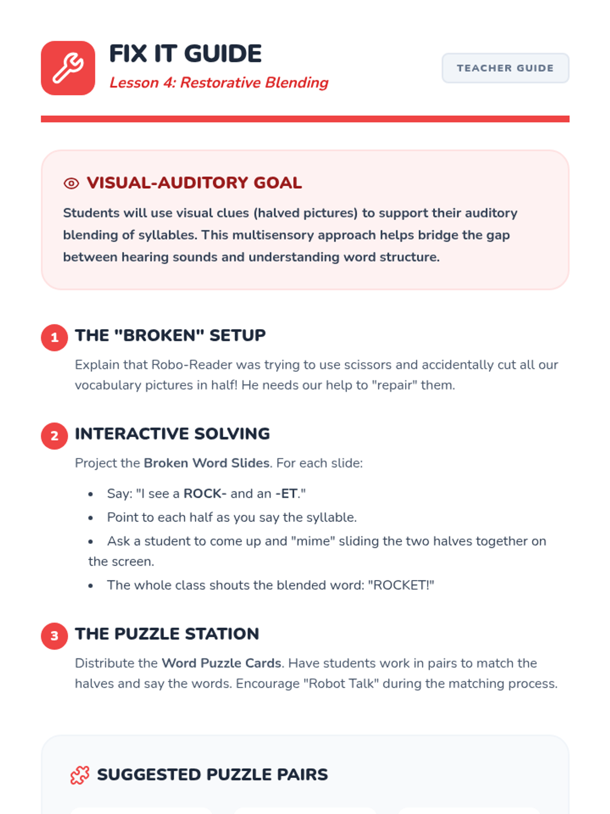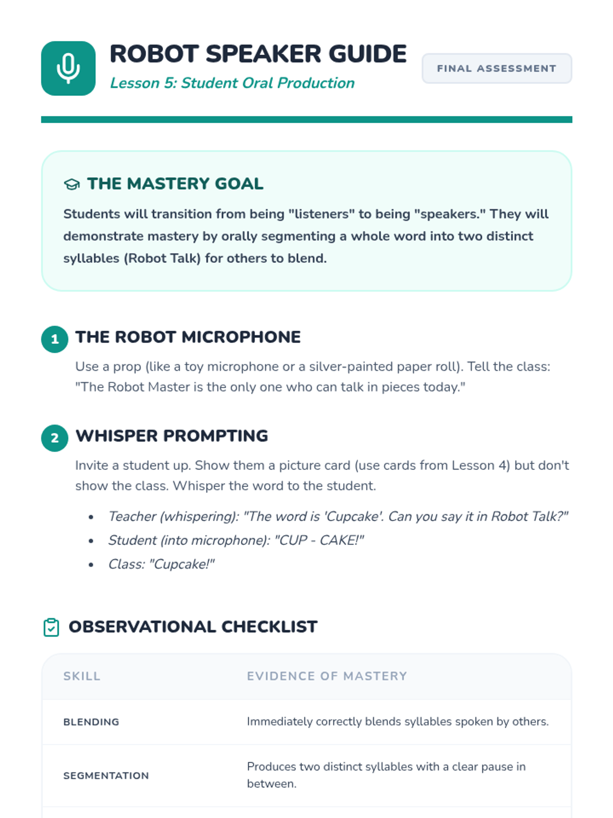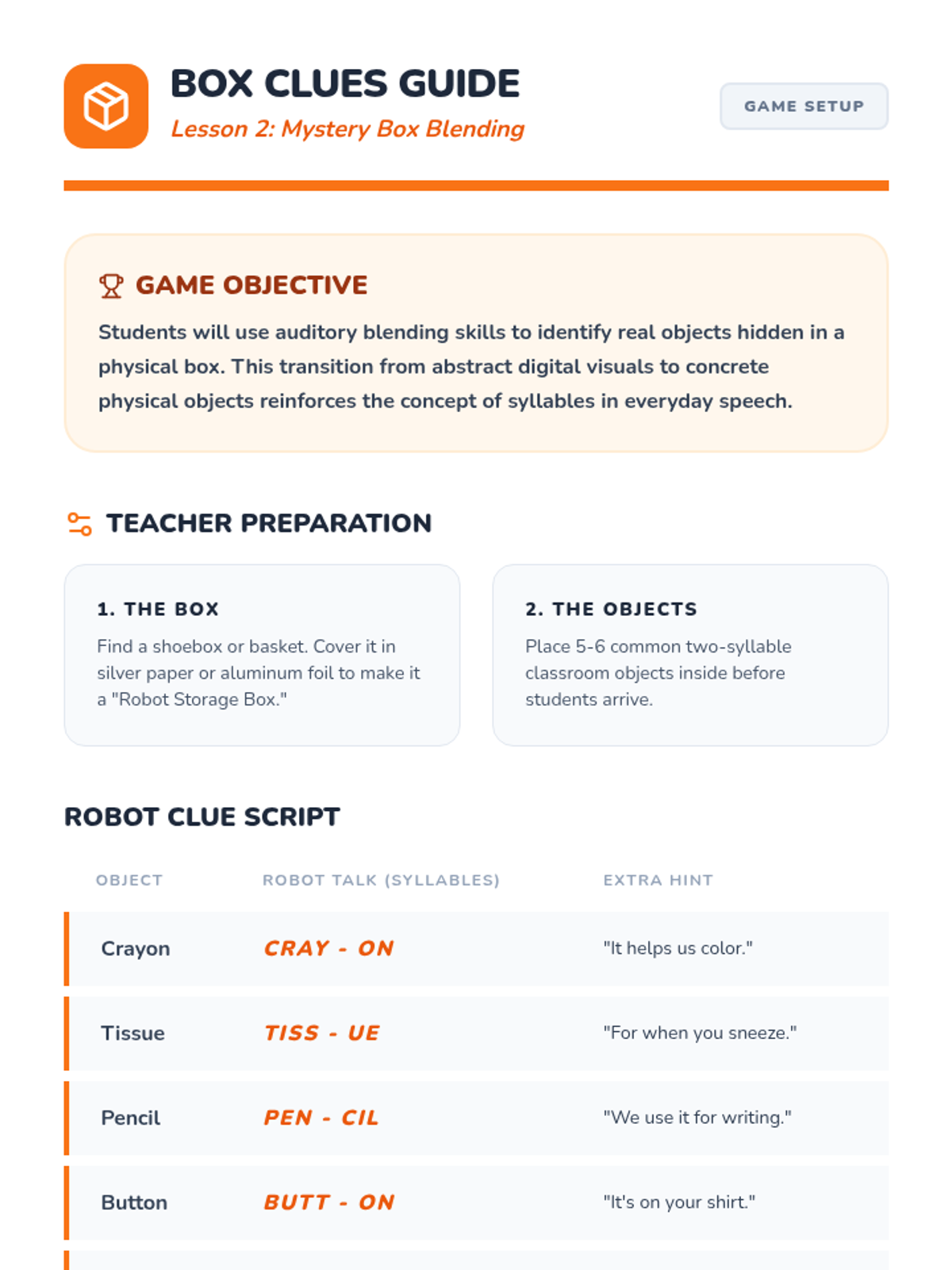 A Pre-K phonics sequence focused on auditory blending and segmenting syllables through an engaging 'Robot' theme. Students progress from listening to segmented speech to producing it themselves using hands-on games and visual aids.