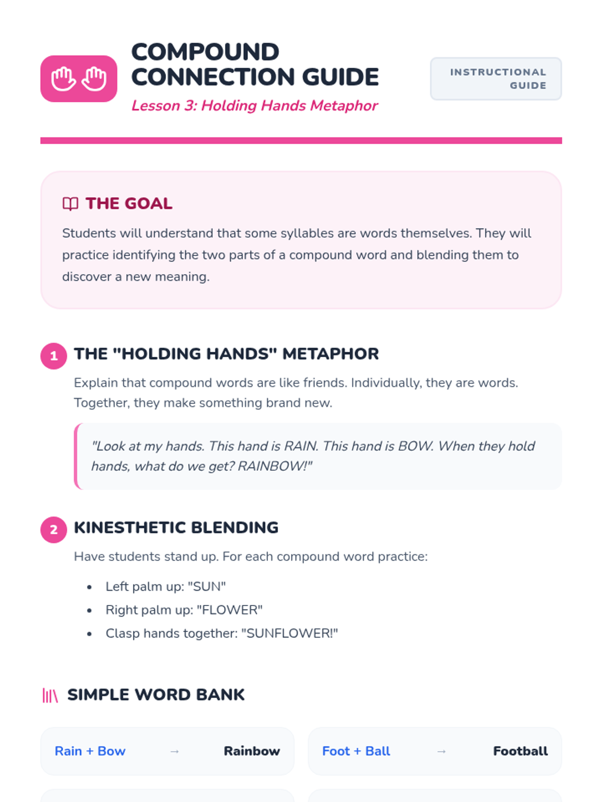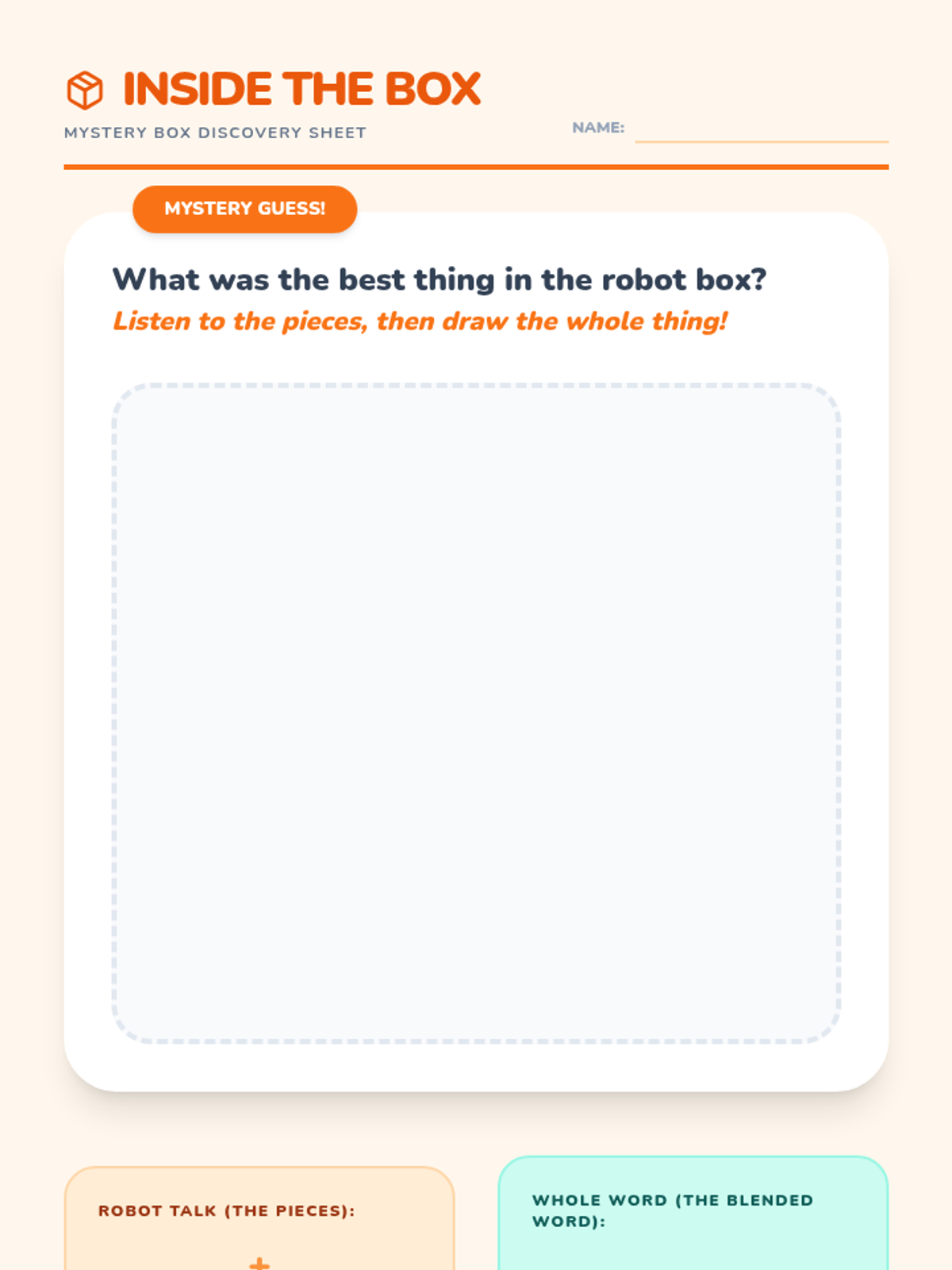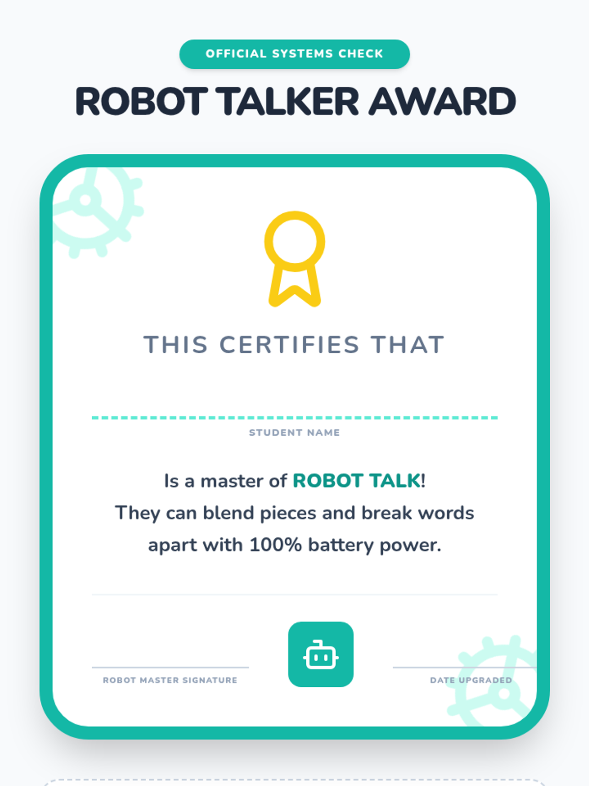 A Pre-K phonics sequence focused on auditory blending and segmenting syllables through an engaging 'Robot' theme. Students progress from listening to segmented speech to producing it themselves using hands-on games and visual aids.