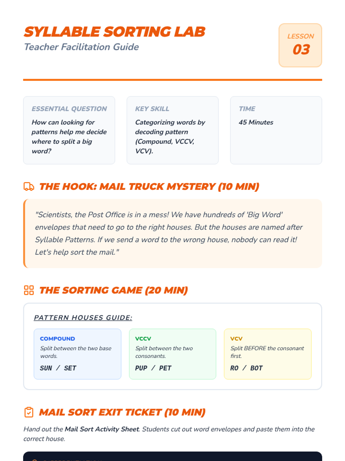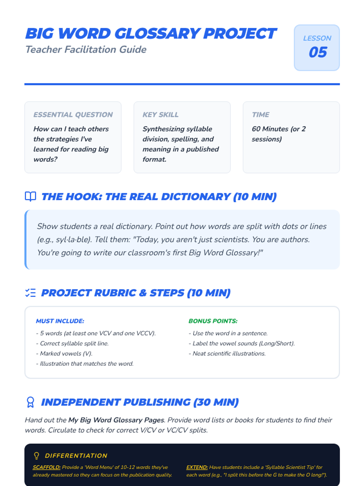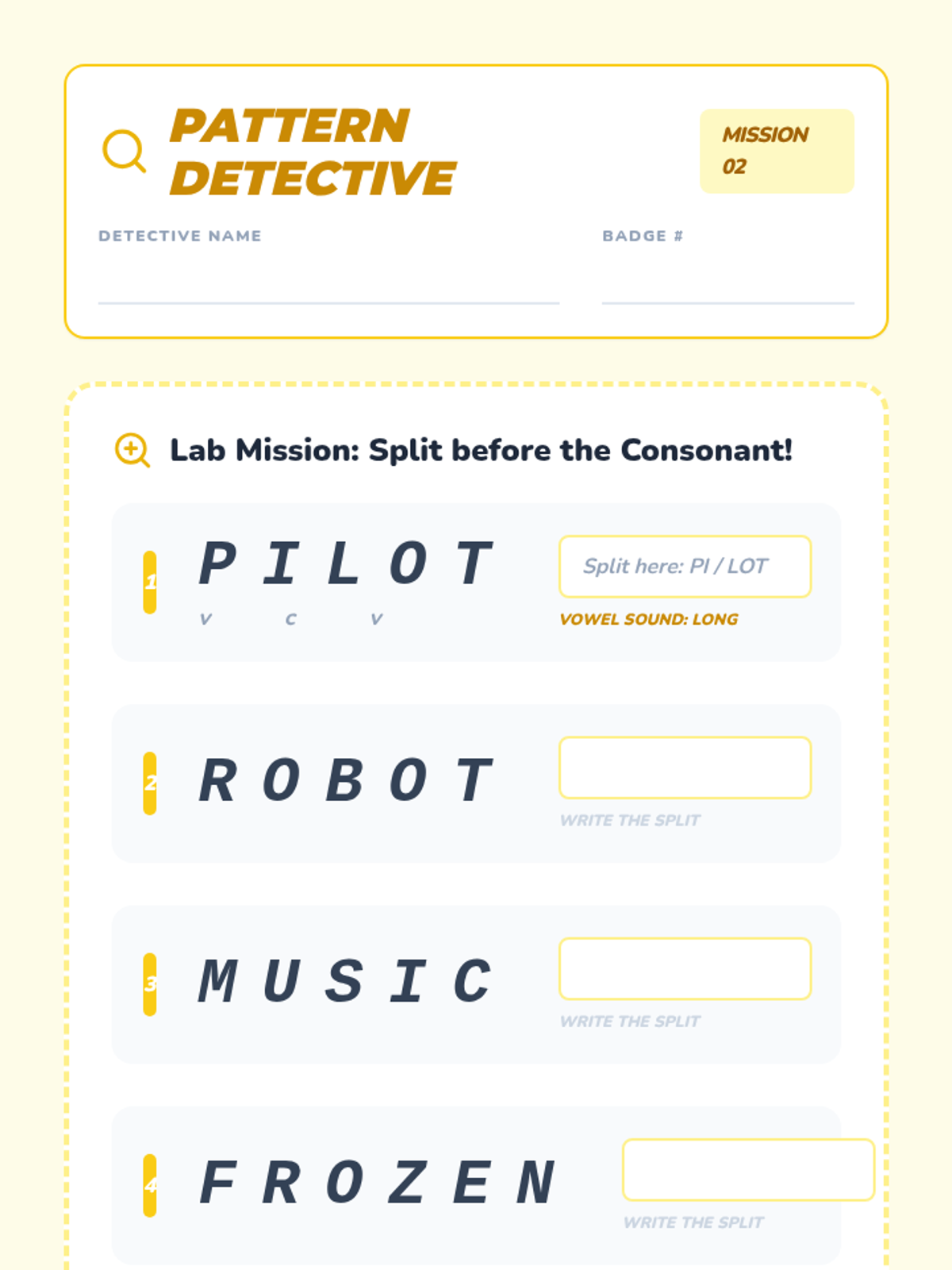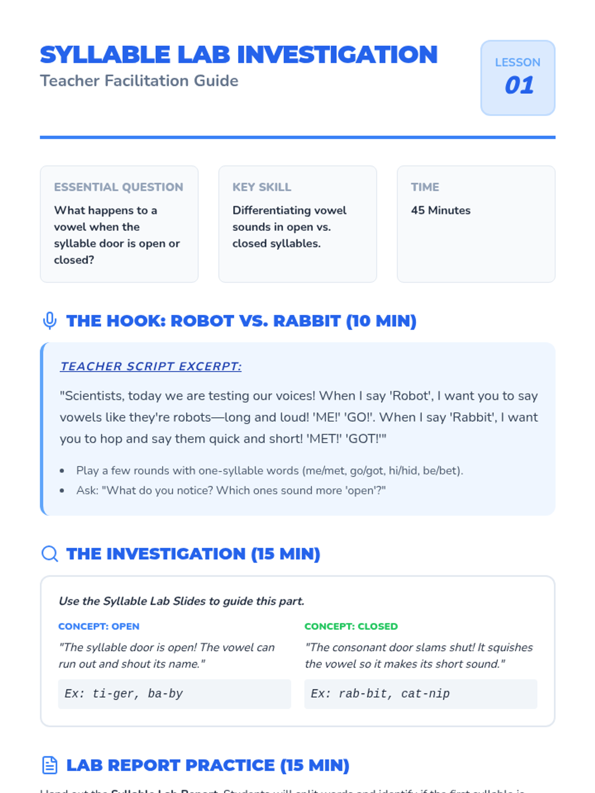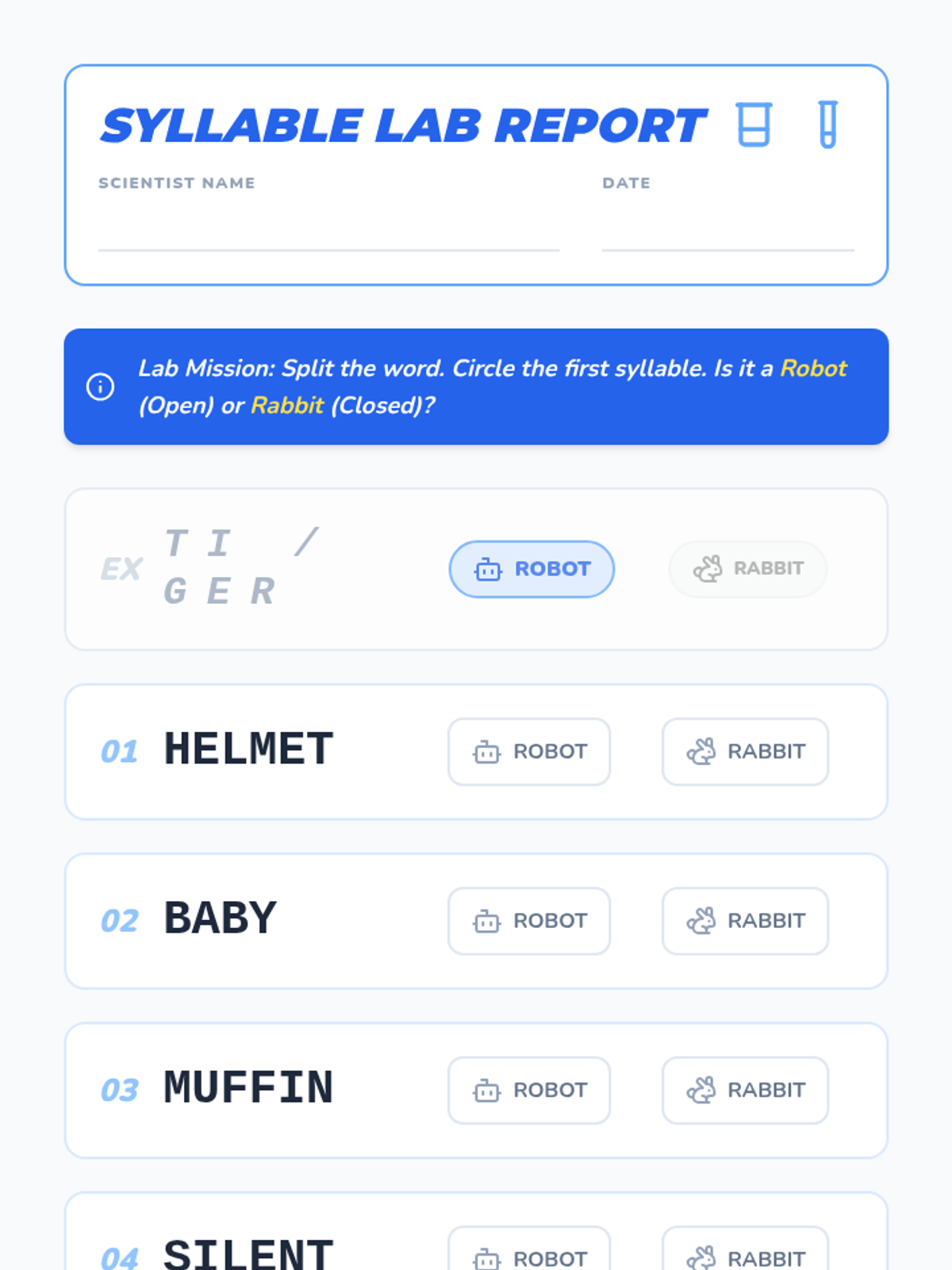 A 1st-grade phonics unit where students become 'Syllable Scientists' to investigate open and closed syllables, VCV patterns, and strategies for decoding two-syllable words through inquiry and hands-on activities.