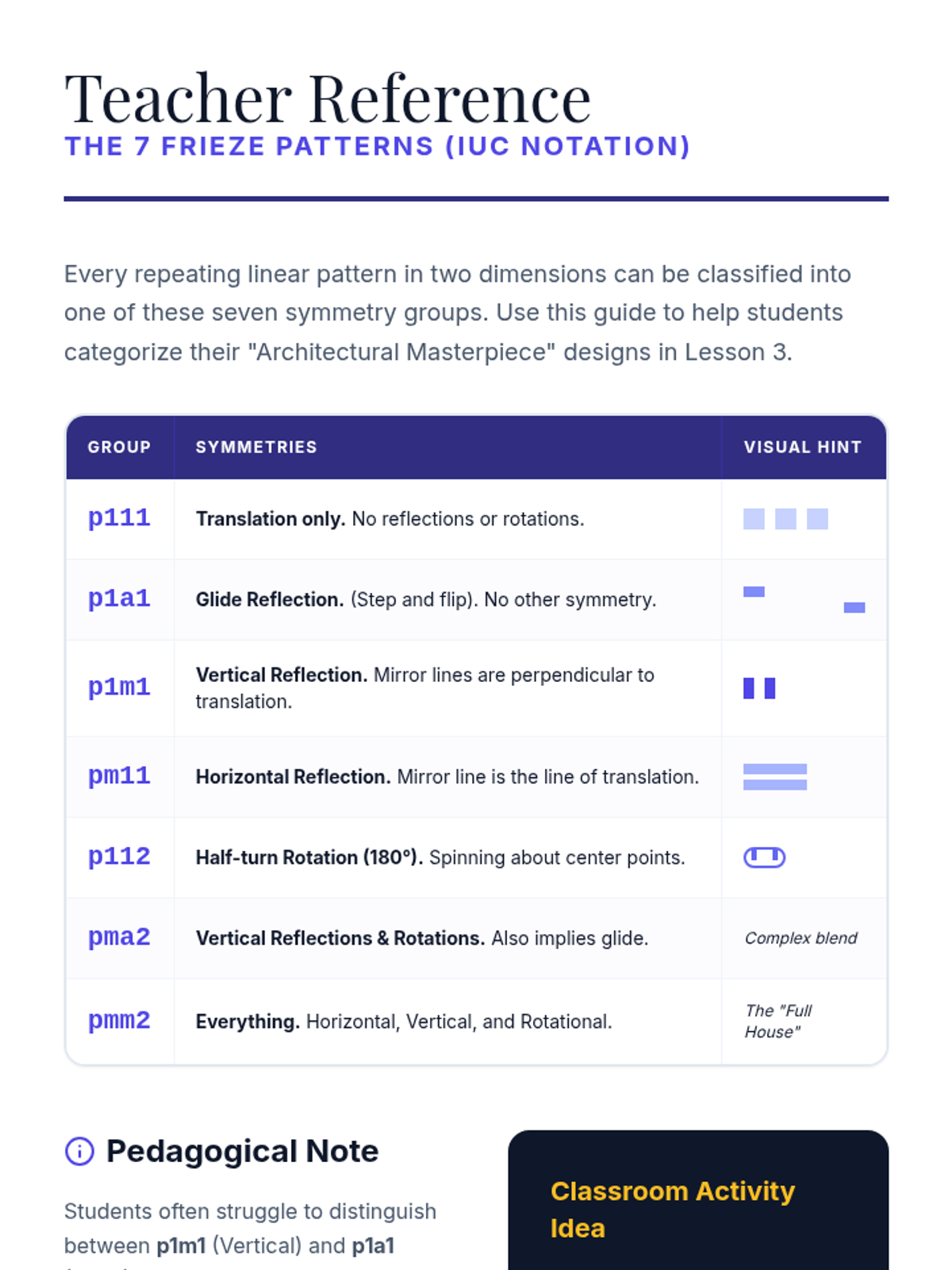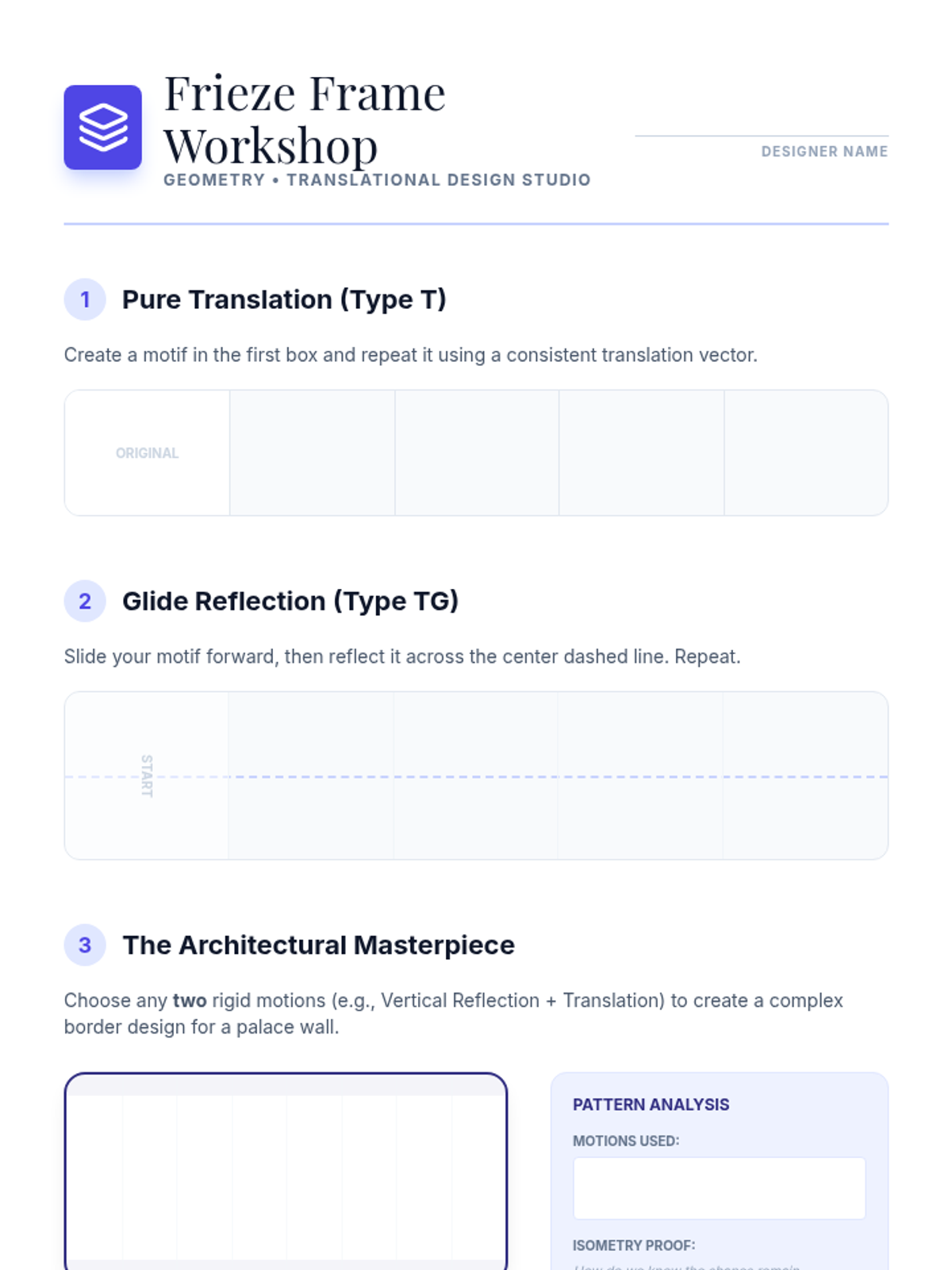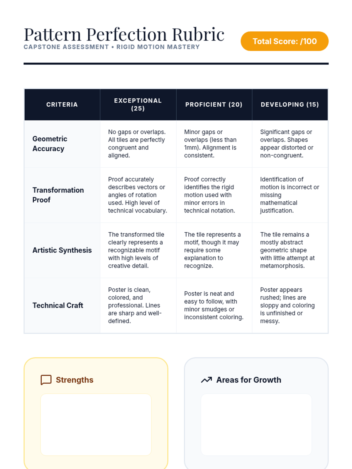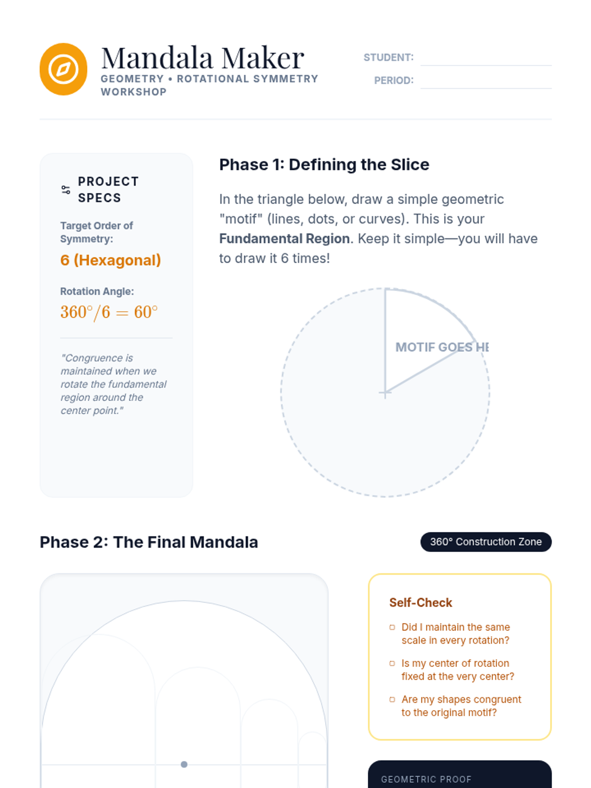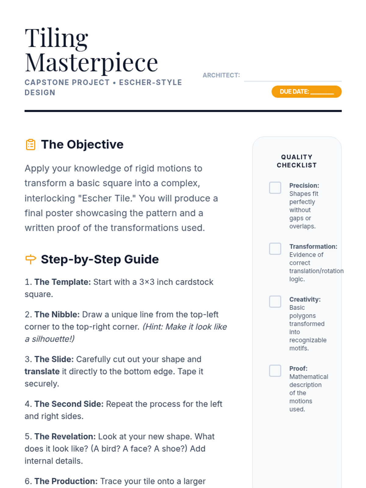 A project-based exploration of rigid motions through art and design. Students analyze symmetry in architecture, create mandalas, design frieze patterns, and synthesize original Escher-style tessellations using precise geometric transformations.