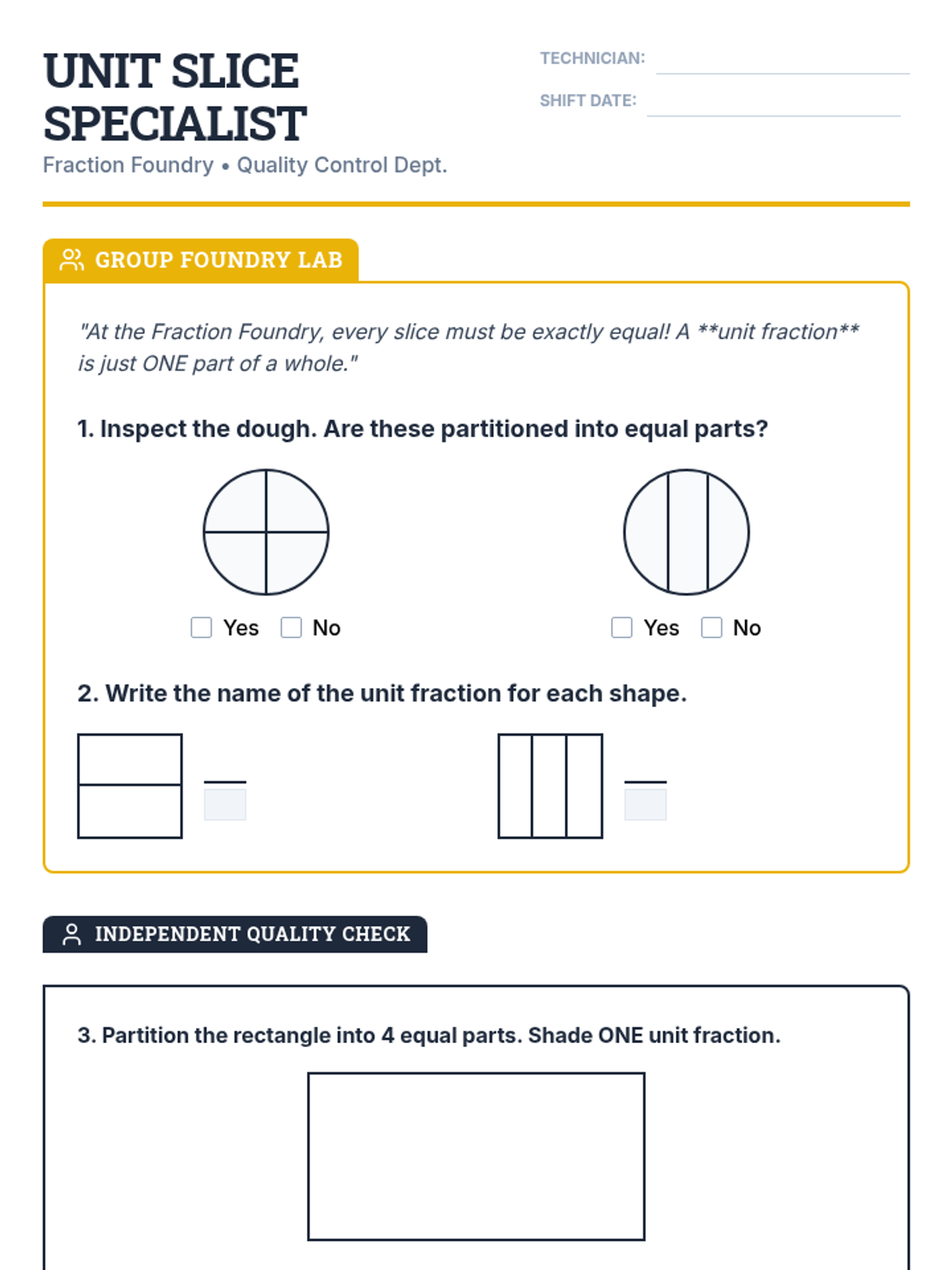 A comprehensive unit on fractions covering identification, decomposition with tape diagrams, equivalent fractions, and representing fractions on a number line. Students act as 'Factory Engineers' to build and analyze numerical parts.