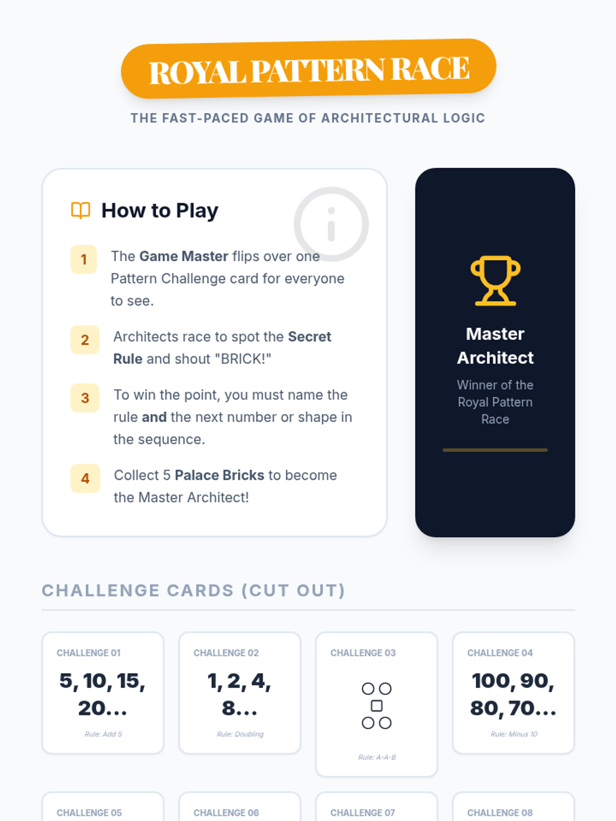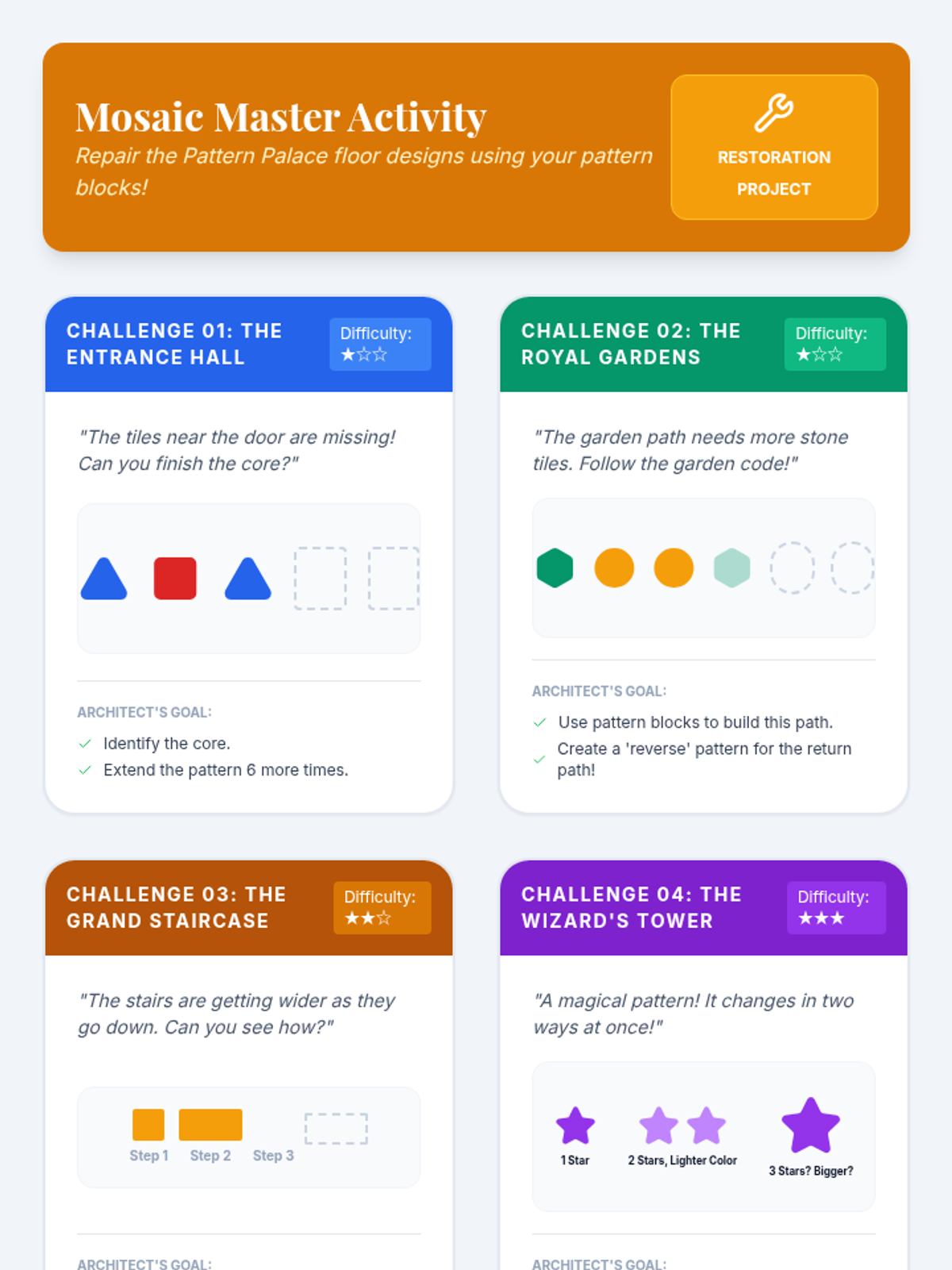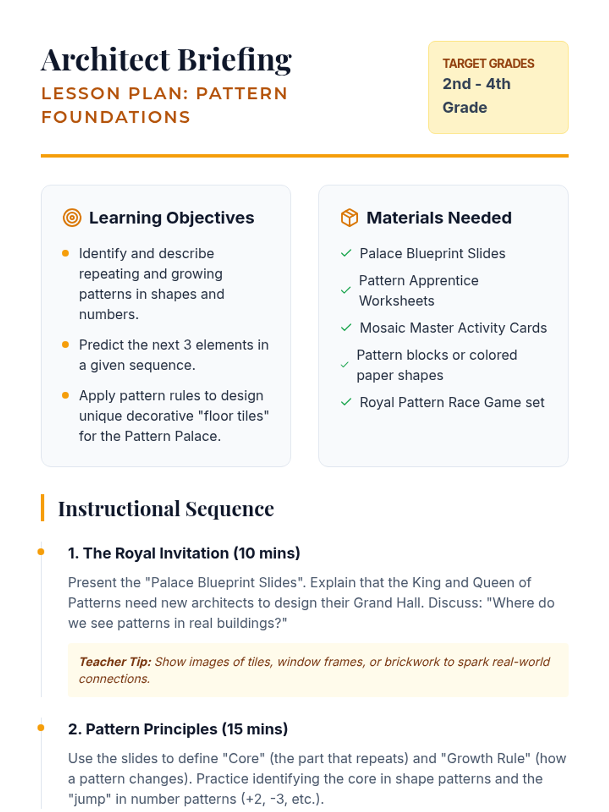 A comprehensive unit where students become architects in the 'Pattern Palace', learning to identify, extend, and create complex shape and number patterns. Students develop algebraic thinking through hands-on tiling activities, visual challenges, and numerical sequences.