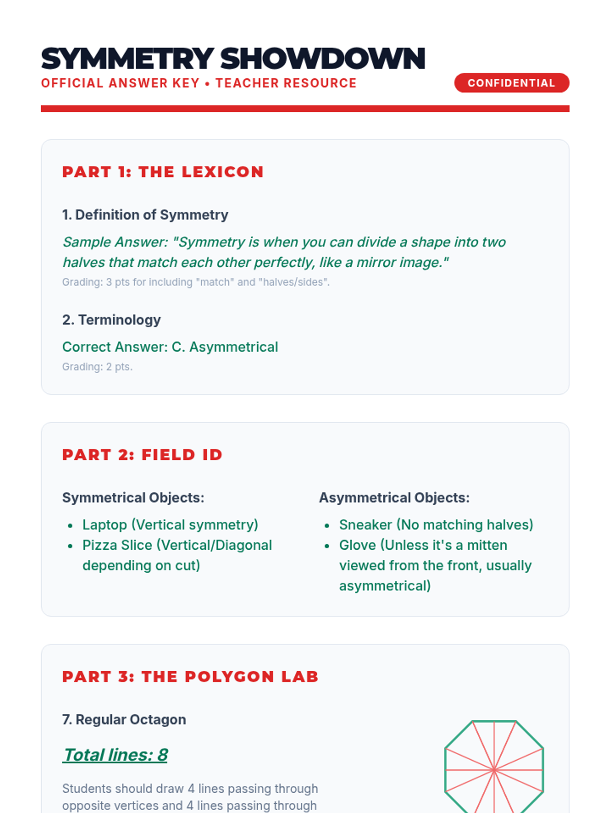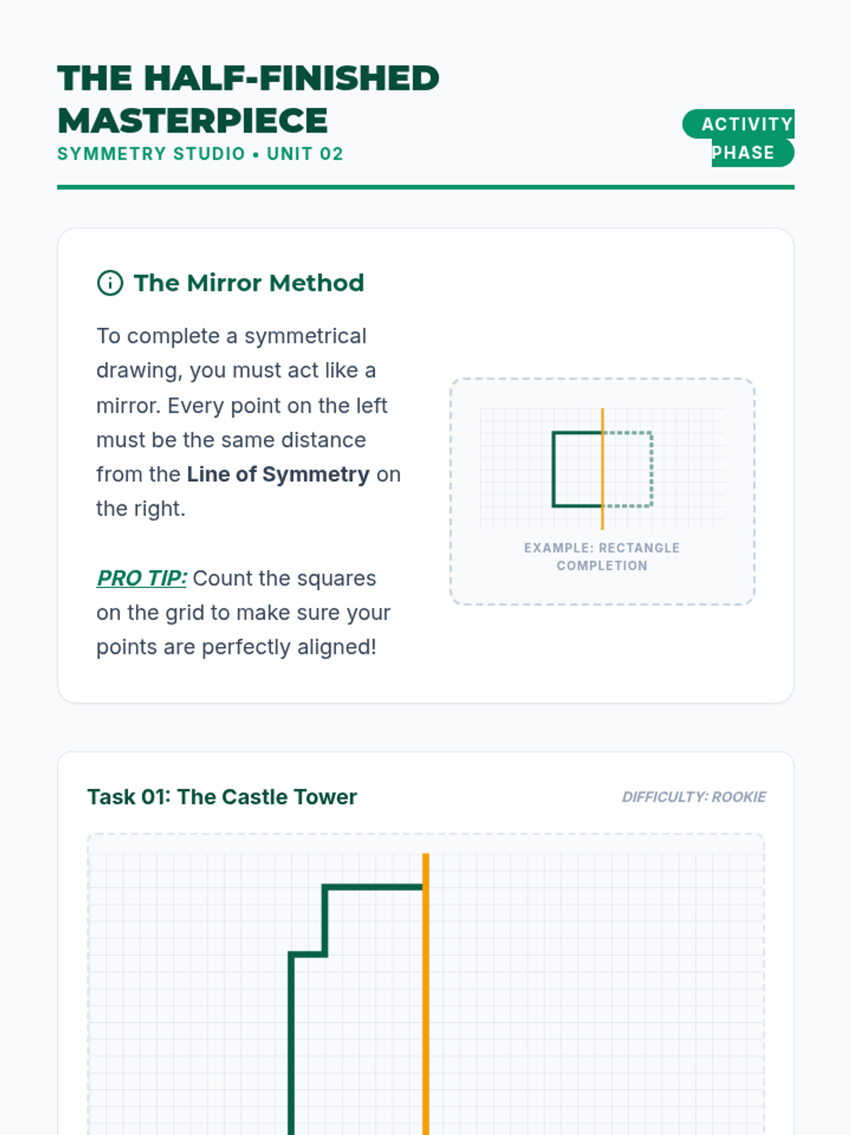 A comprehensive unit on lines of symmetry, exploring identification, drawing, and real-world applications through geometric and organic forms. Students will develop a deep understanding of balance and reflection.