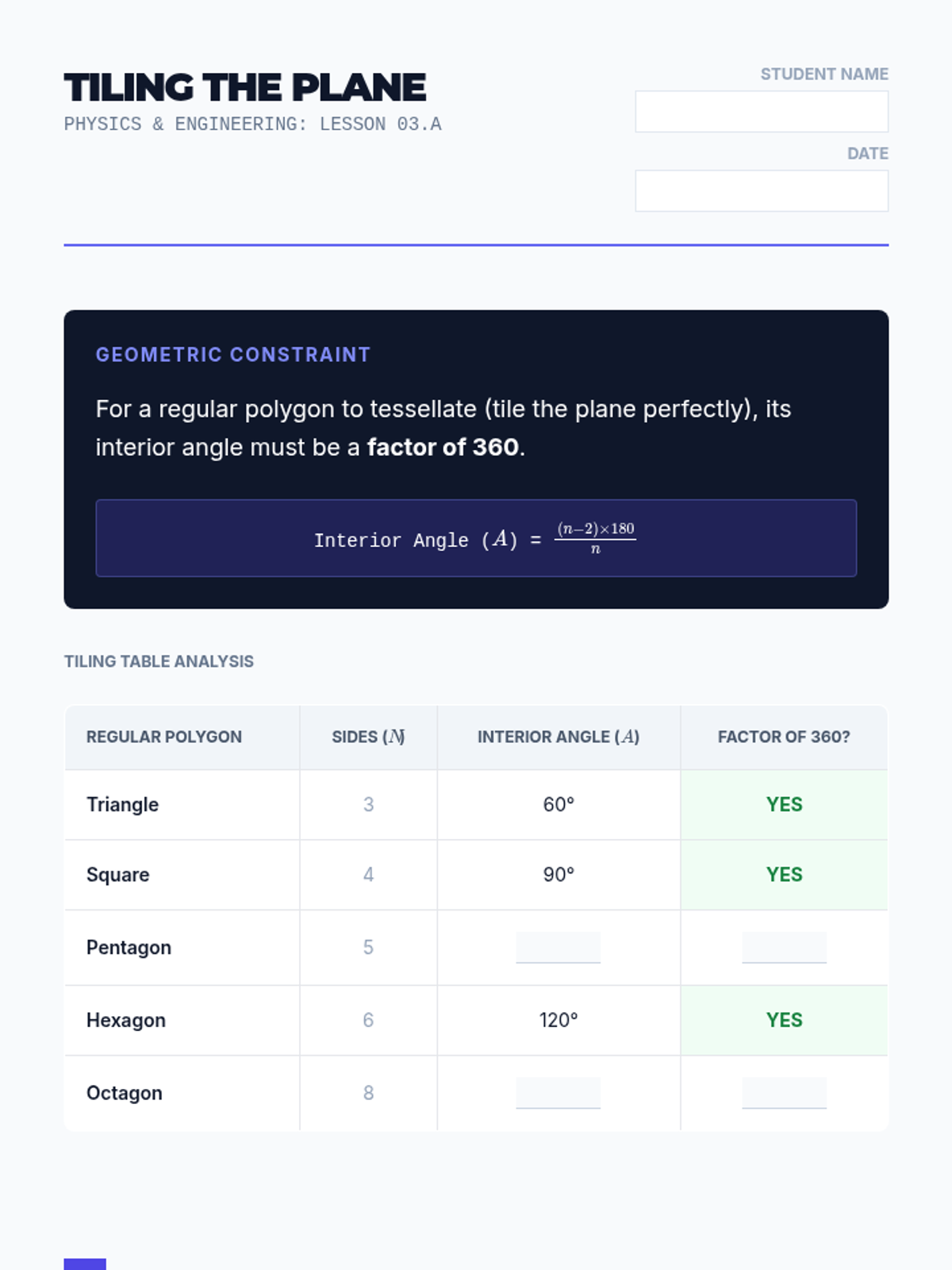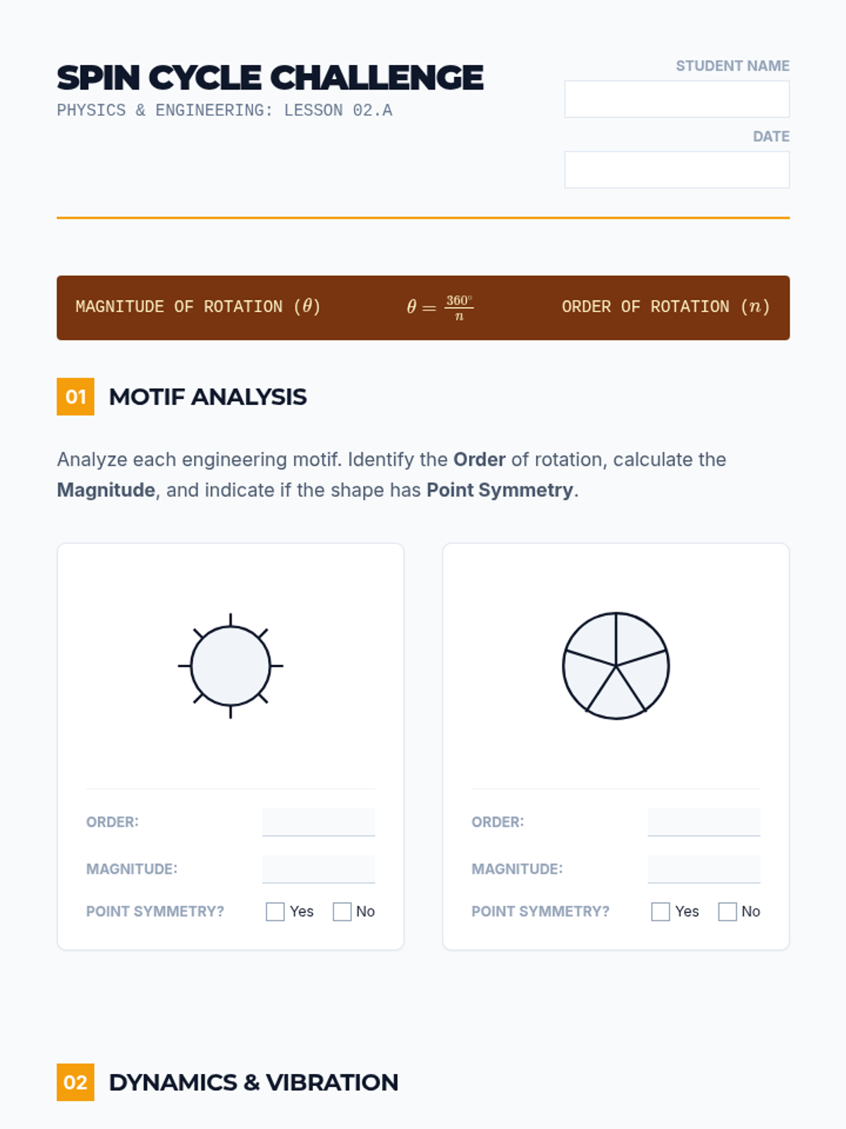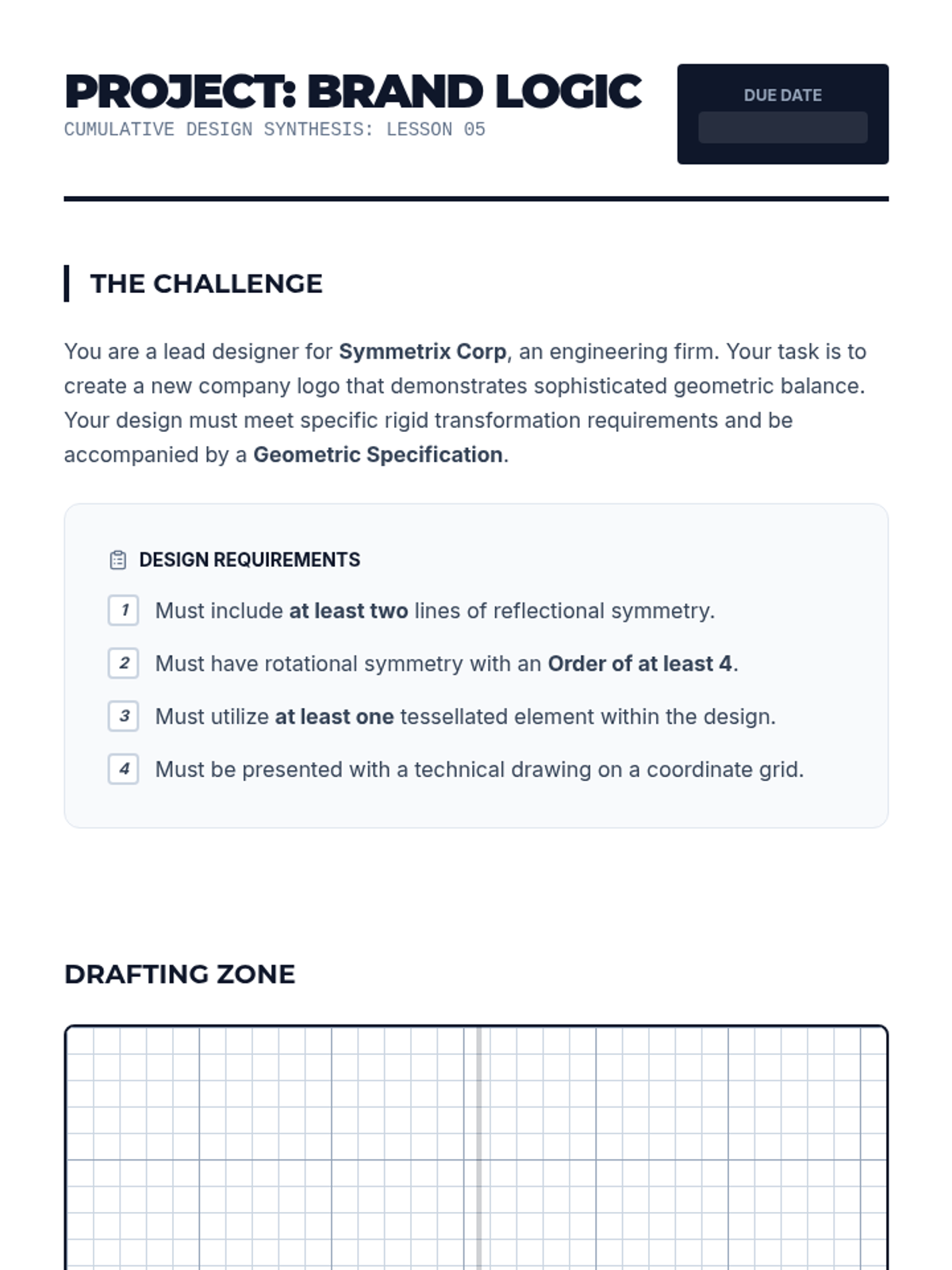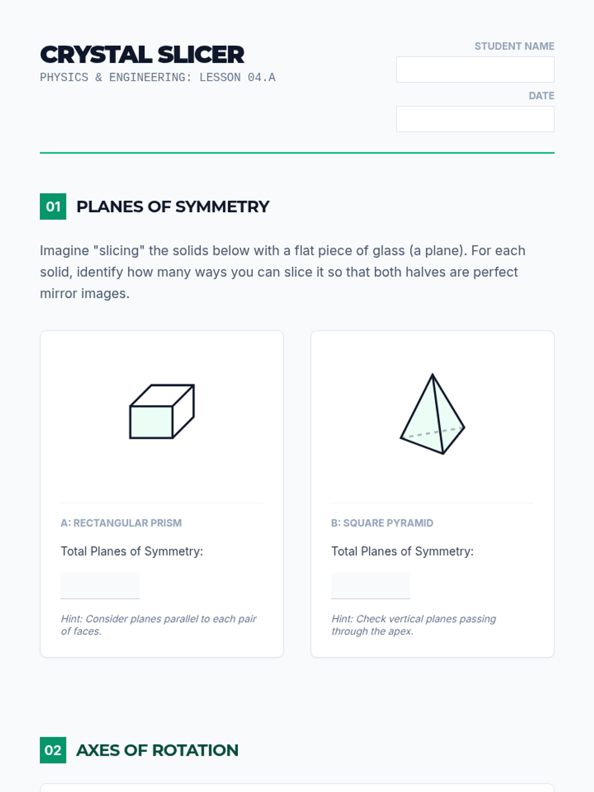 A comprehensive 10th-grade physics and geometry sequence exploring symmetry, transformations, and their applications in engineering, crystallography, and design. Students progress from 2D reflectional symmetry to 3D spatial reasoning and professional design synthesis.