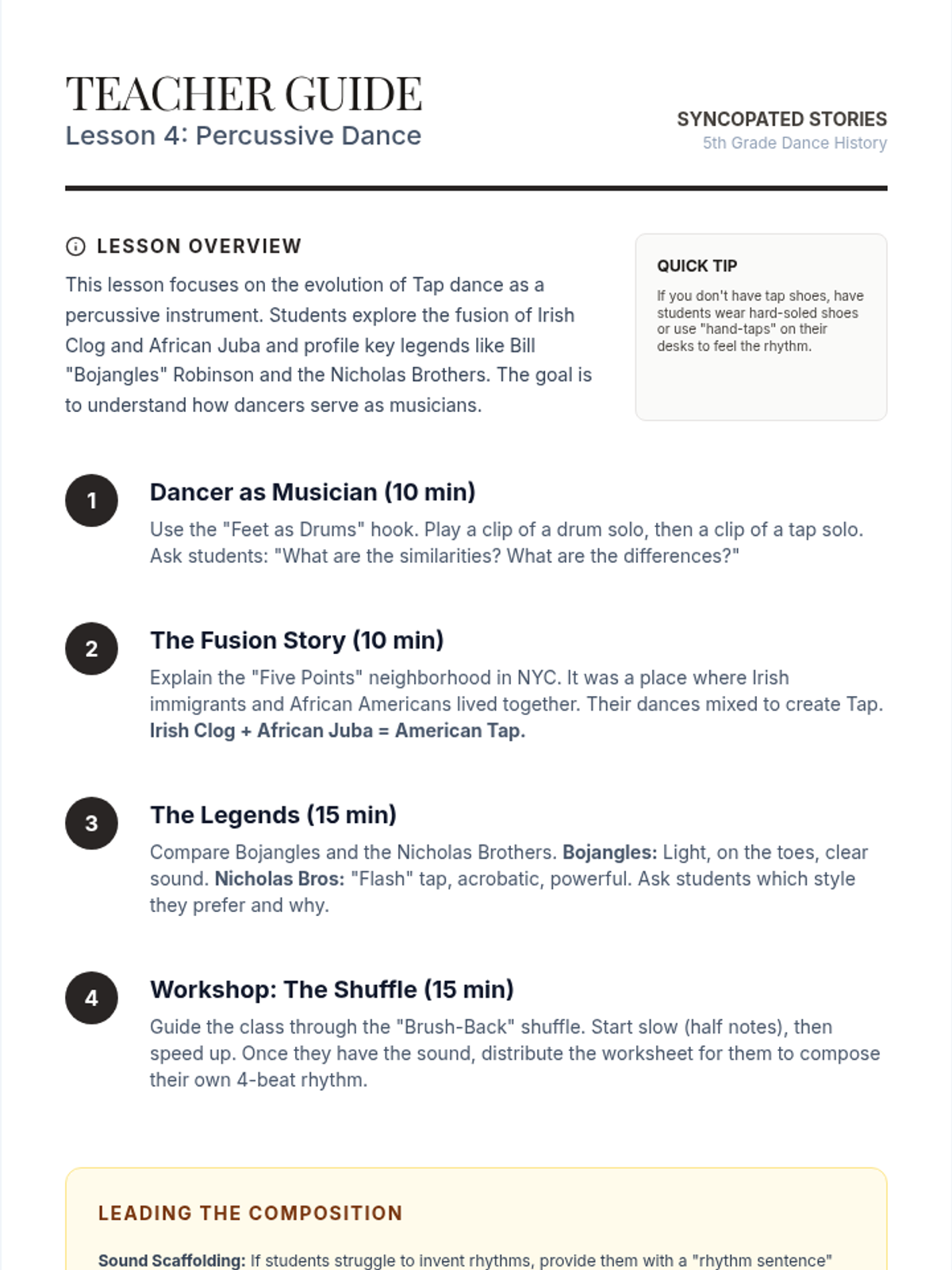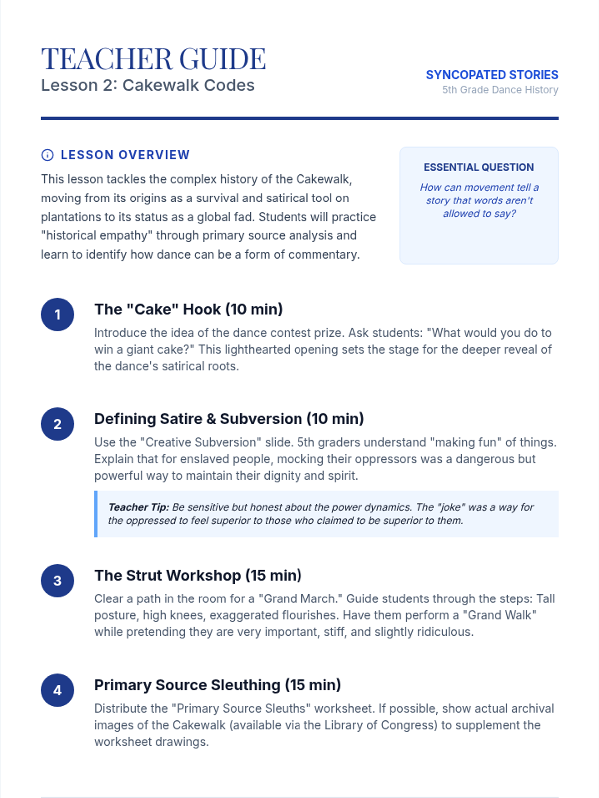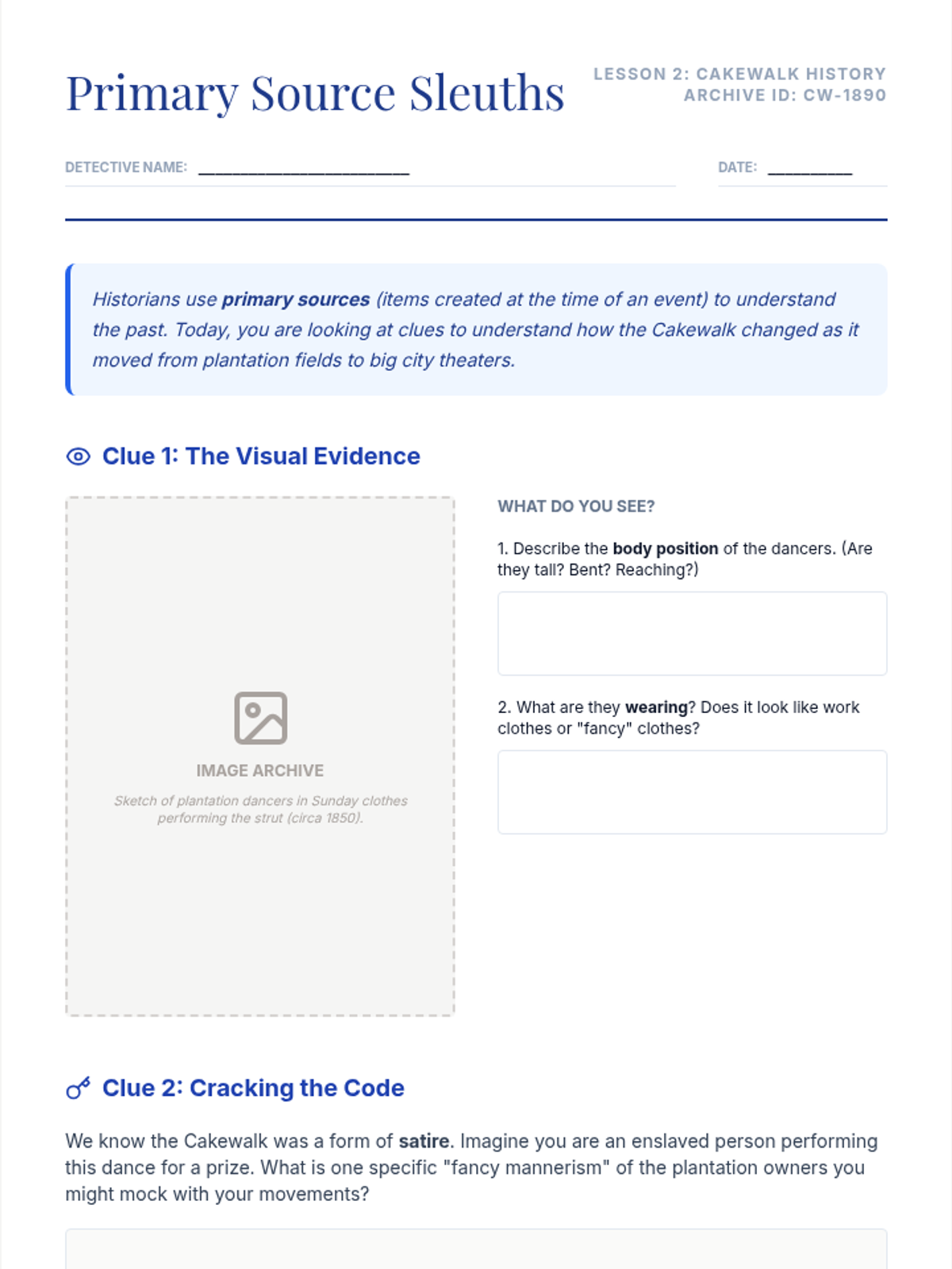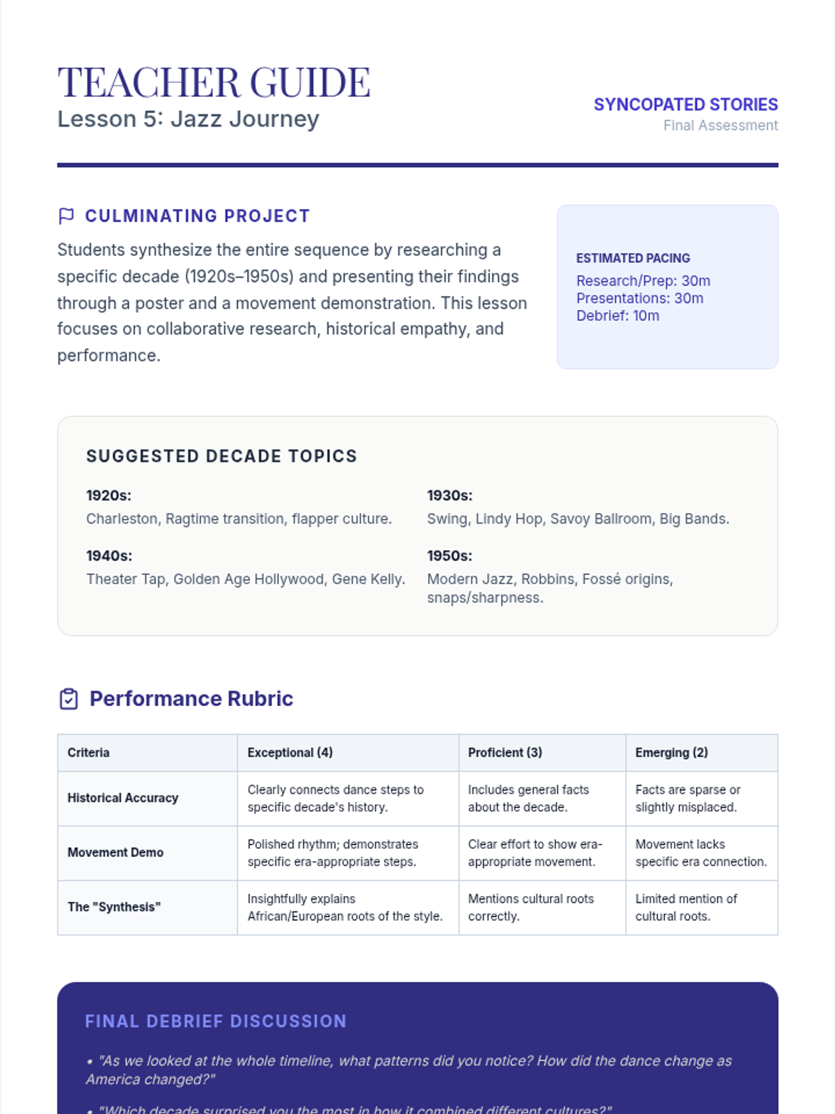 A 5th-grade dance history sequence exploring the African roots and European influences that shaped American Jazz and Tap. Students trace the lineage from plantation dances to the Harlem Renaissance and Broadway, focusing on cultural synthesis and resilience.