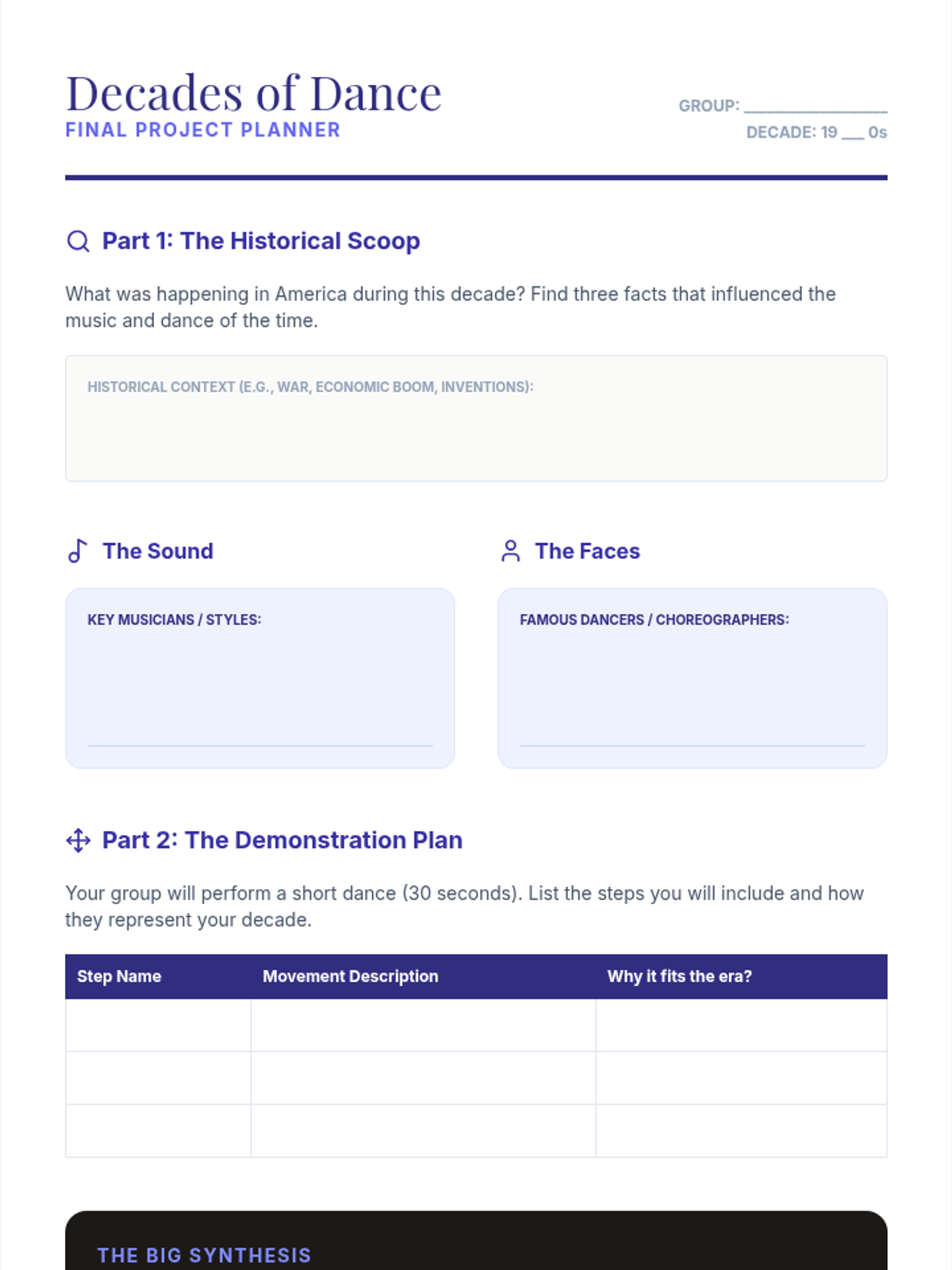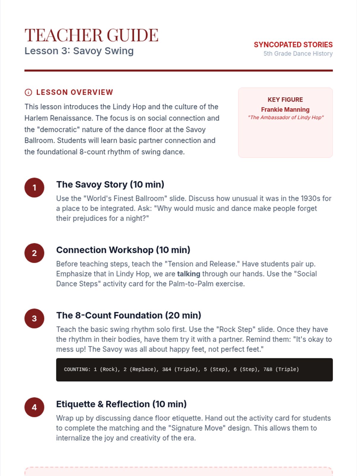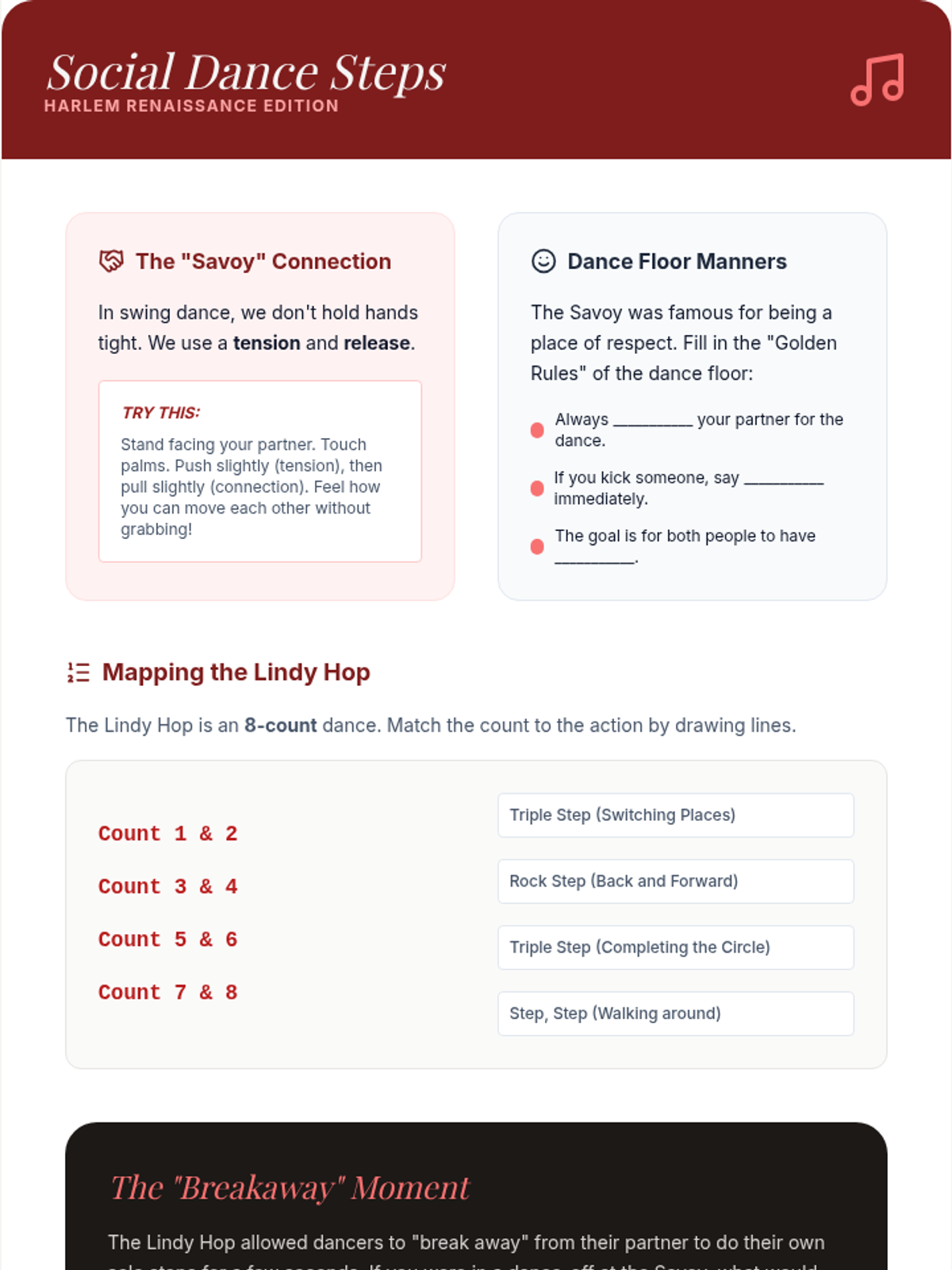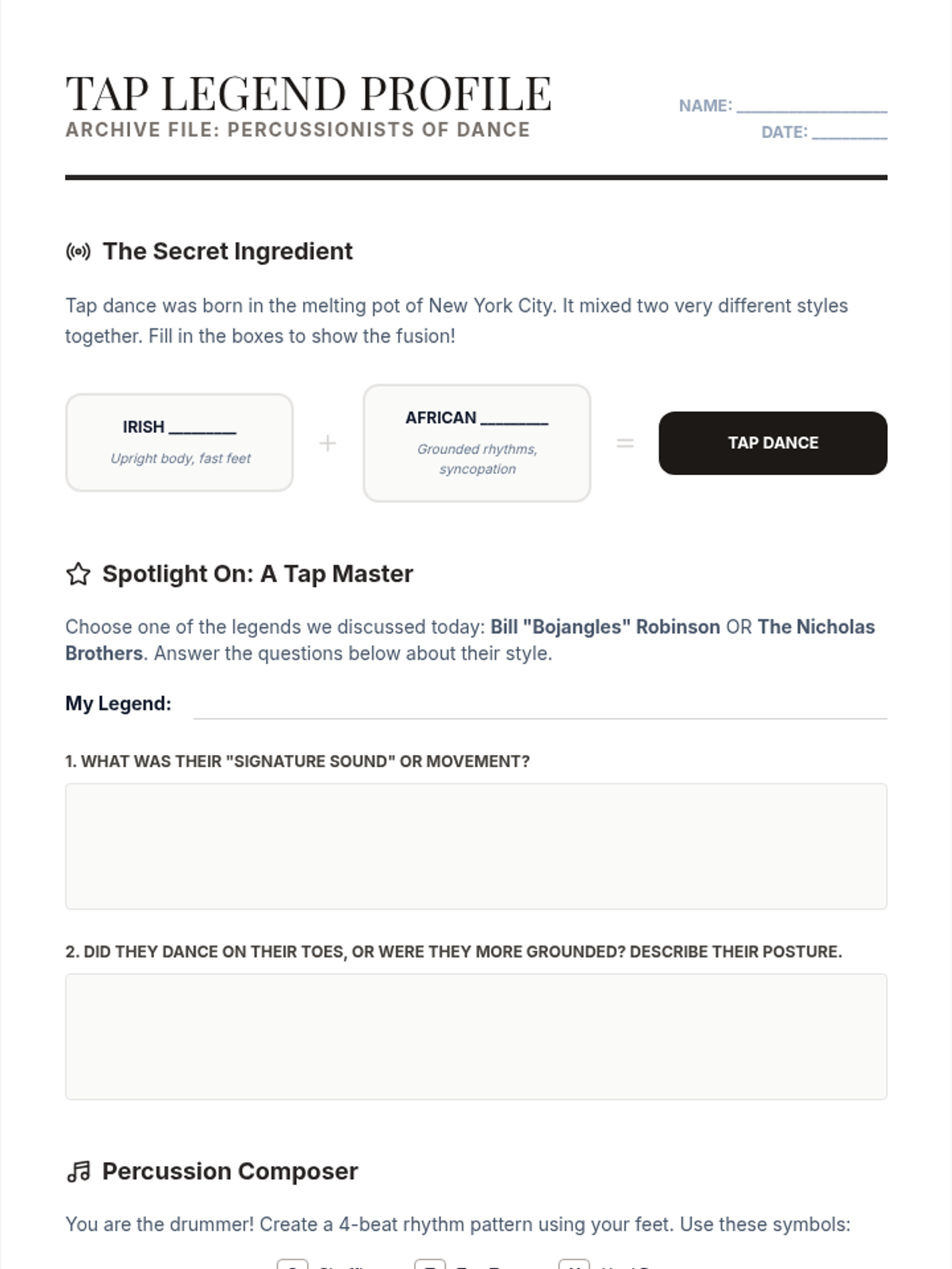 A 5th-grade dance history sequence exploring the African roots and European influences that shaped American Jazz and Tap. Students trace the lineage from plantation dances to the Harlem Renaissance and Broadway, focusing on cultural synthesis and resilience.