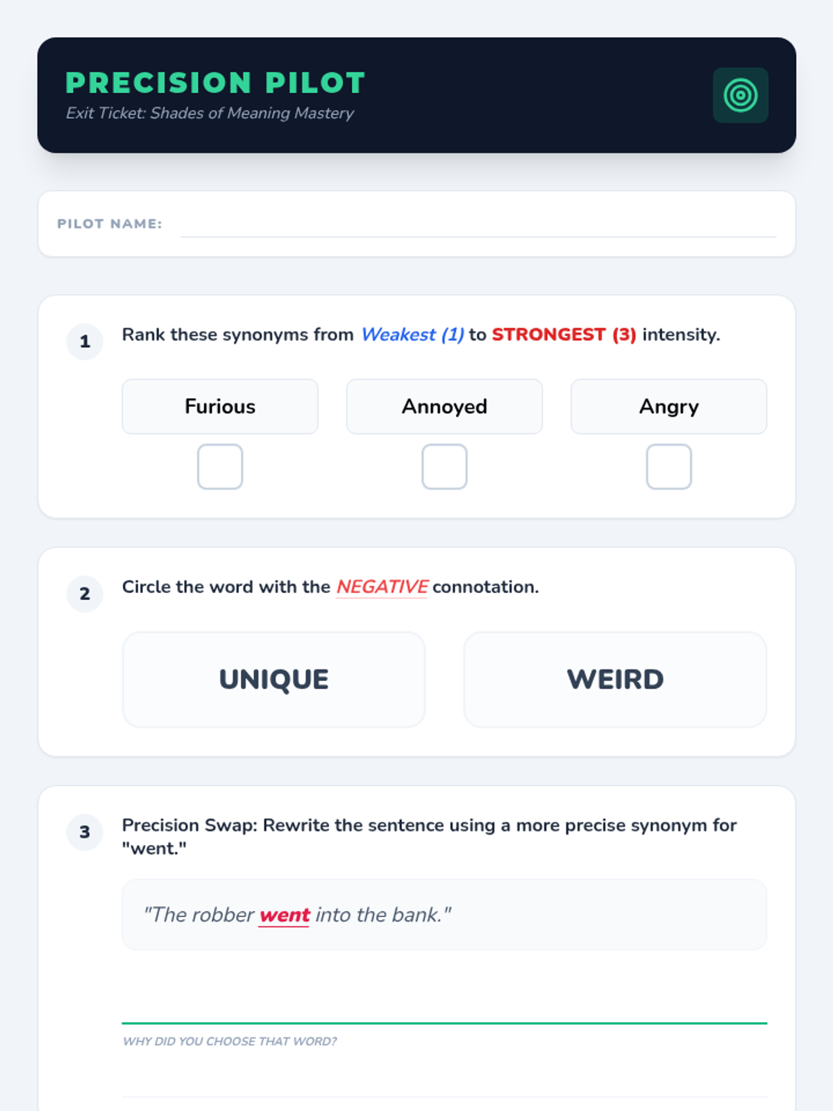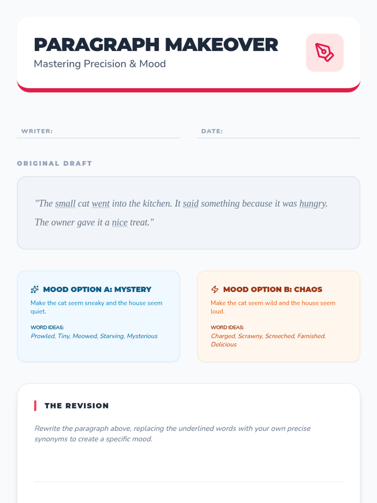 A 5-lesson sequence for 4th-grade students to explore shades of meaning, synonym intensity, and word connotations. Students move from physical gradients to dramatizing verbs and finally to revising writing for precision.