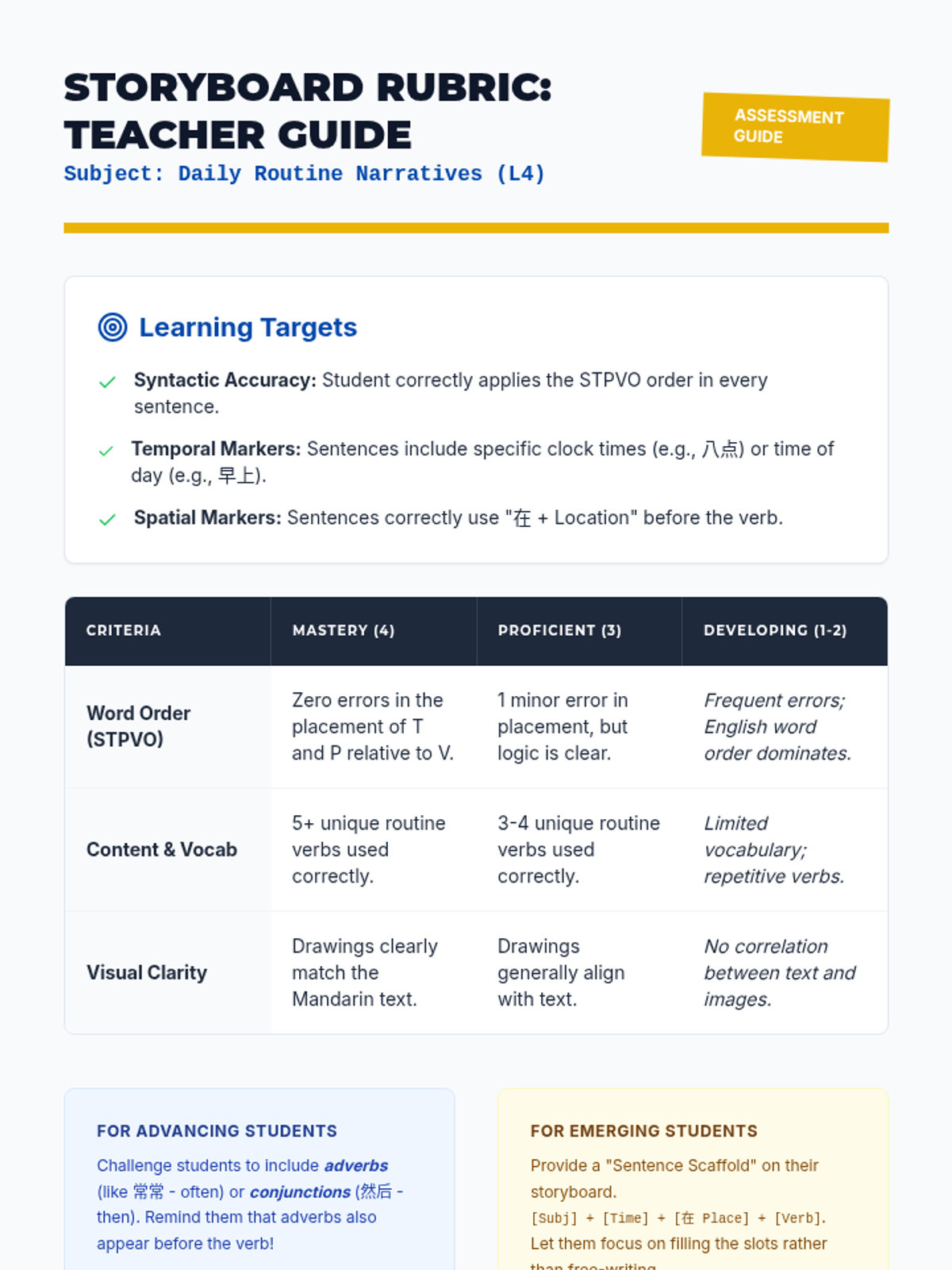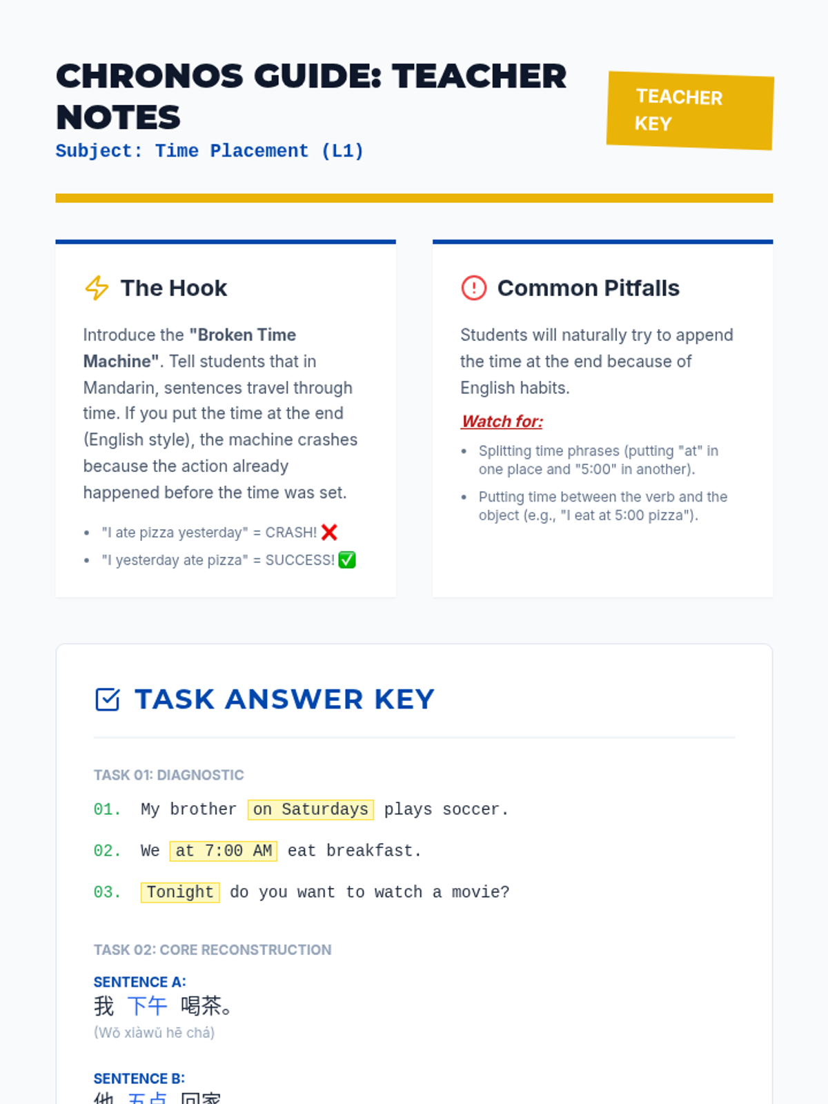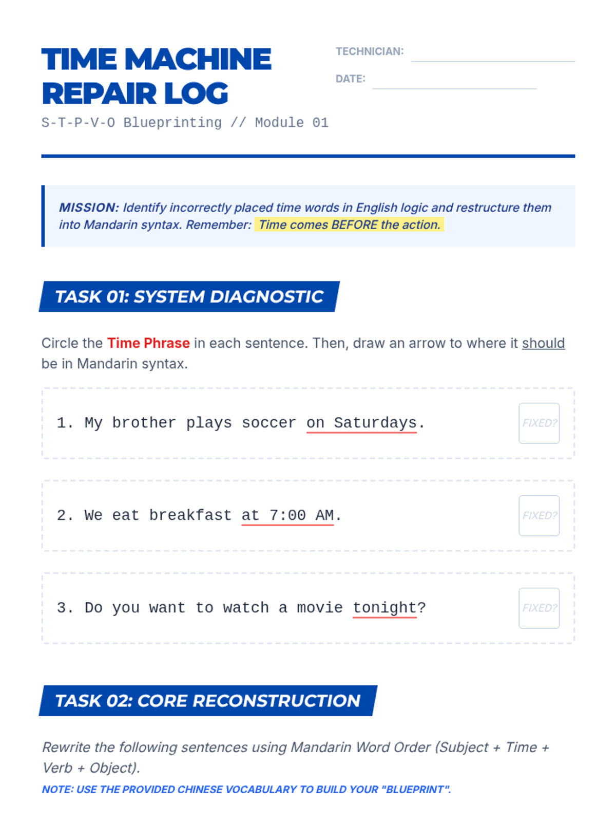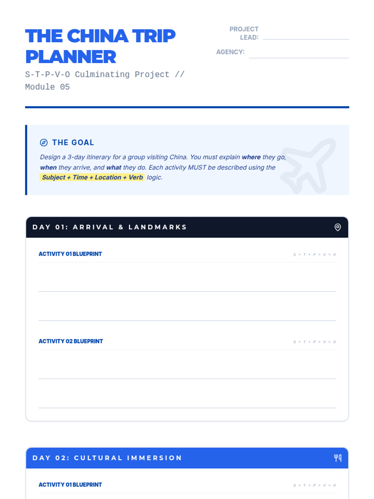 A 9th-grade Mandarin grammar unit focusing on the 'Golden Rule' of word order (Subject + Time + Location + Verb + Object). Students transition from simple sentences to complex descriptions of routines and travel plans.