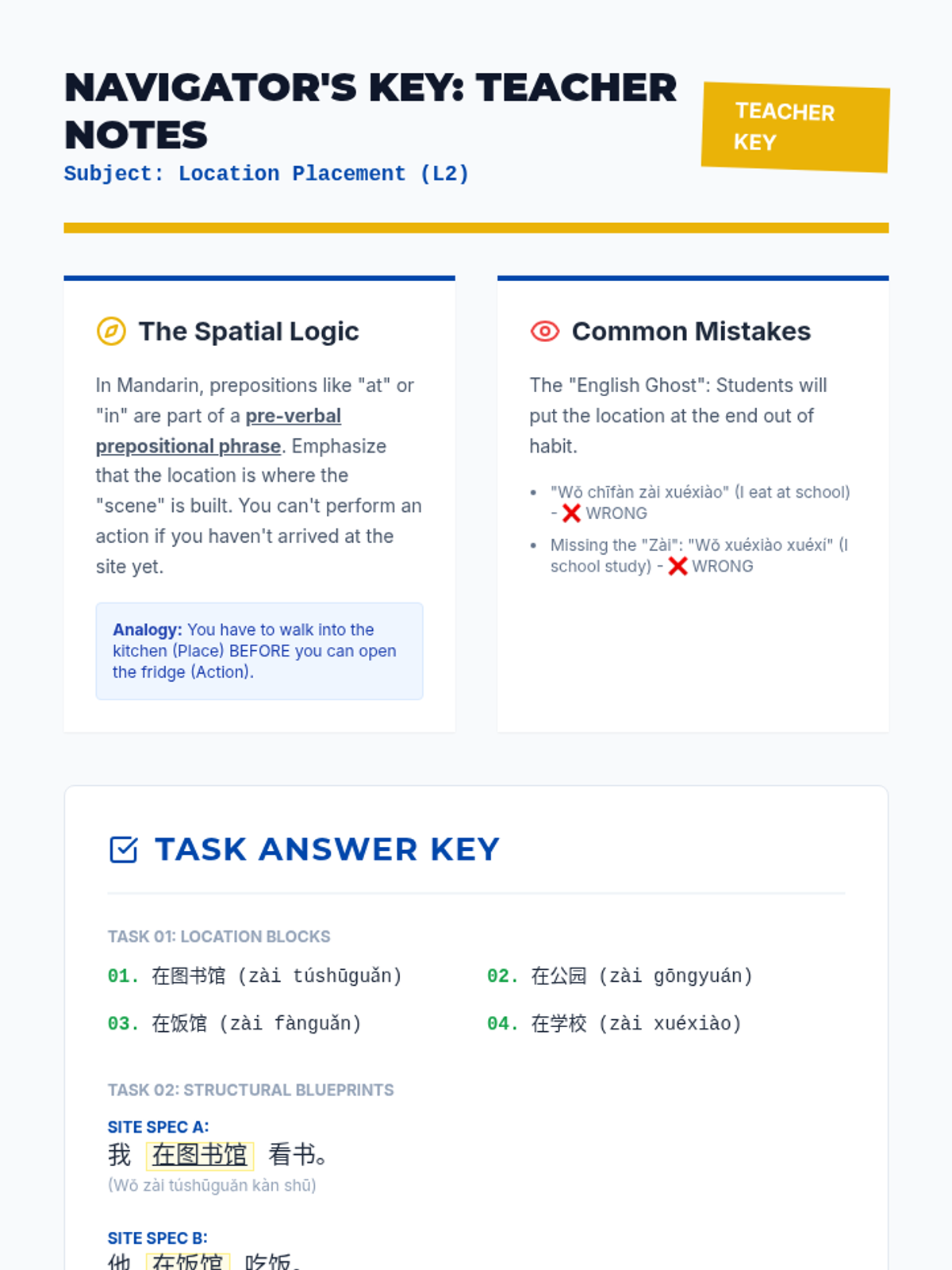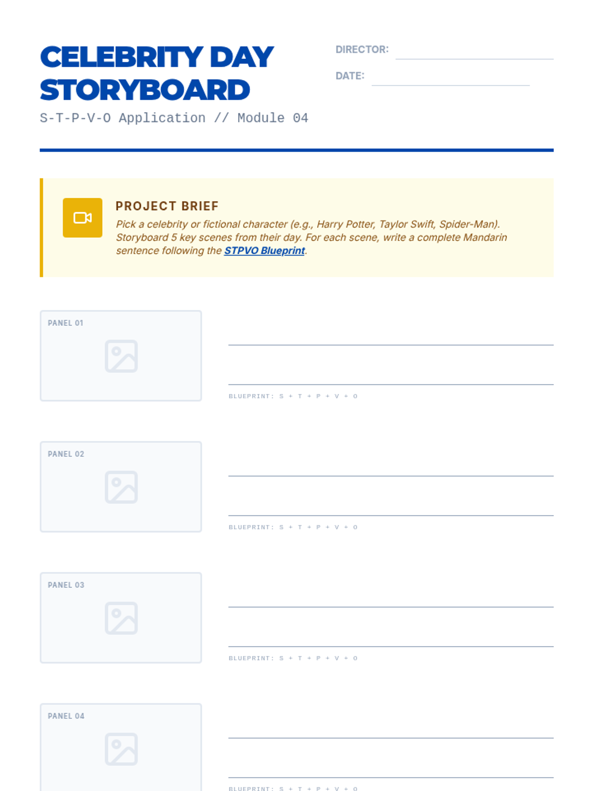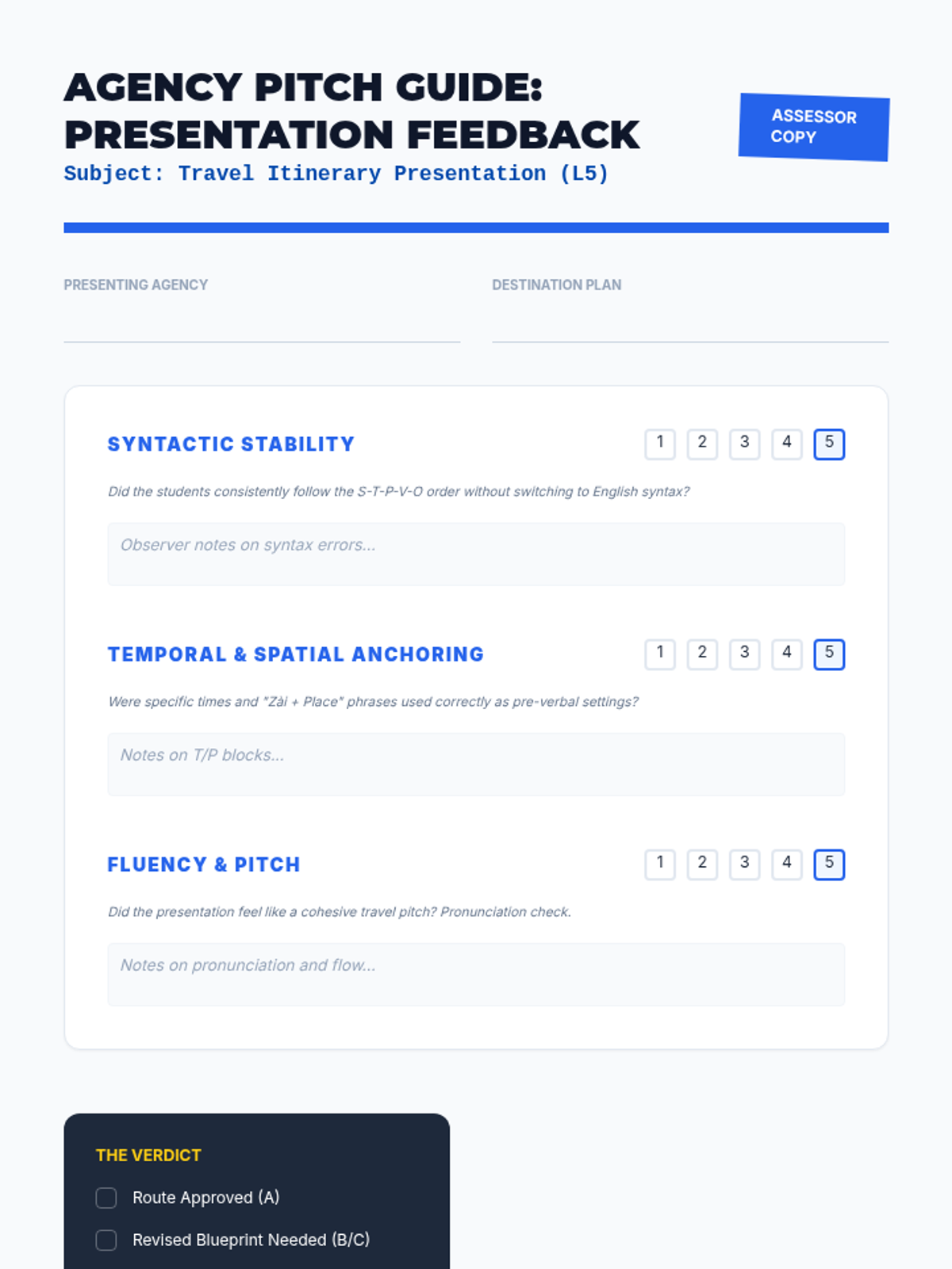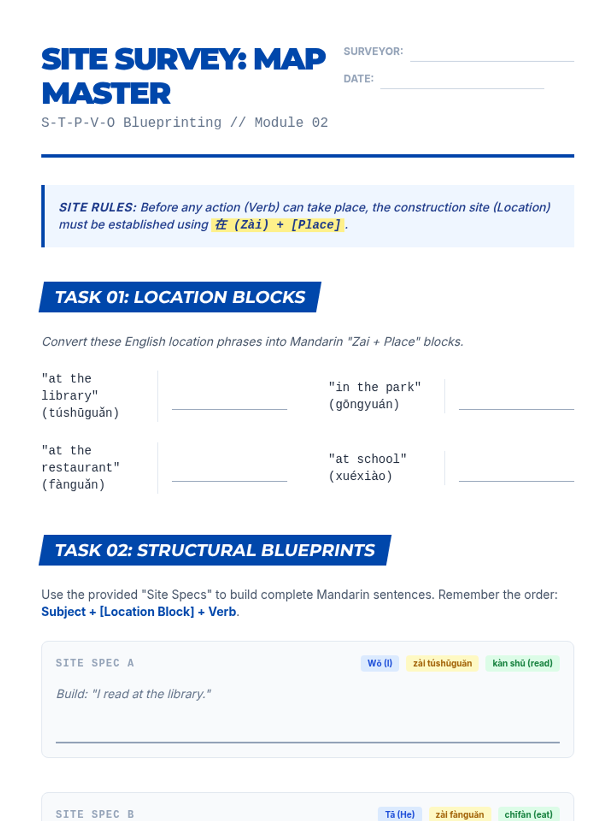 A 9th-grade Mandarin grammar unit focusing on the 'Golden Rule' of word order (Subject + Time + Location + Verb + Object). Students transition from simple sentences to complex descriptions of routines and travel plans.