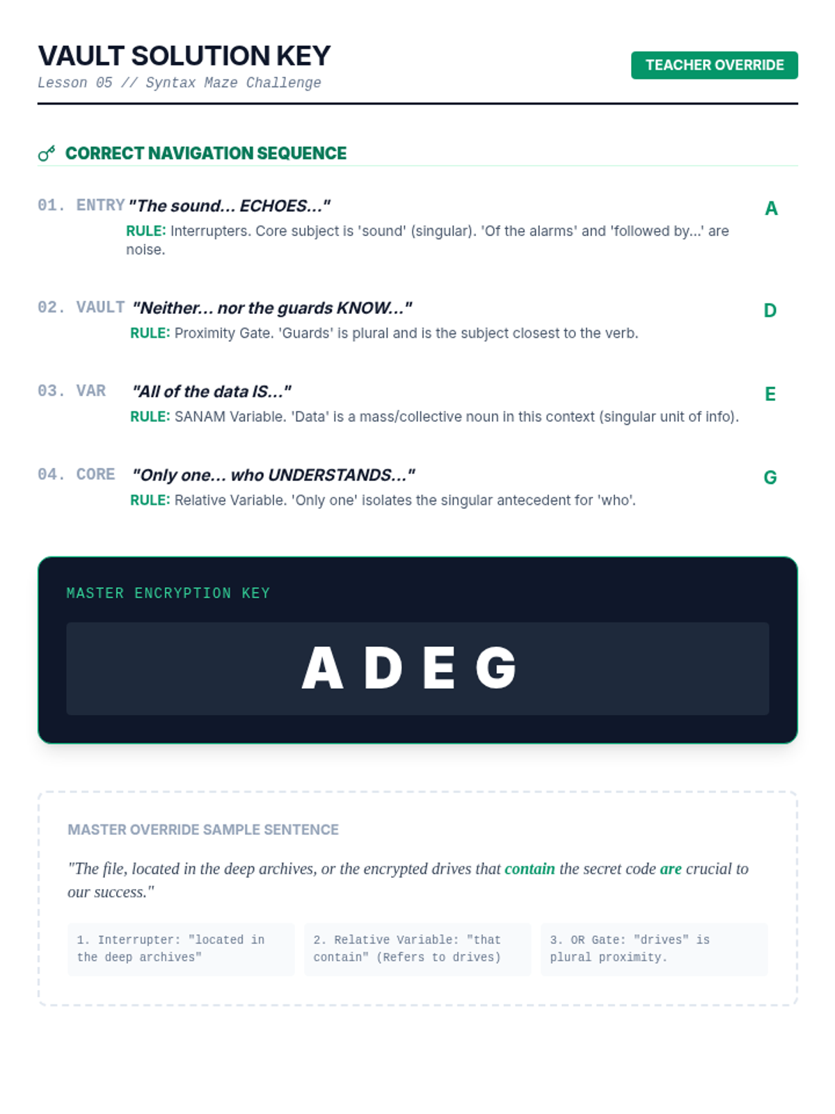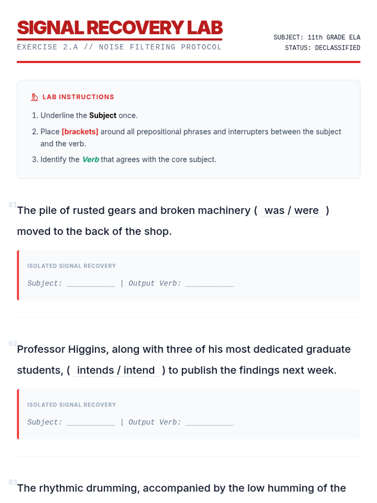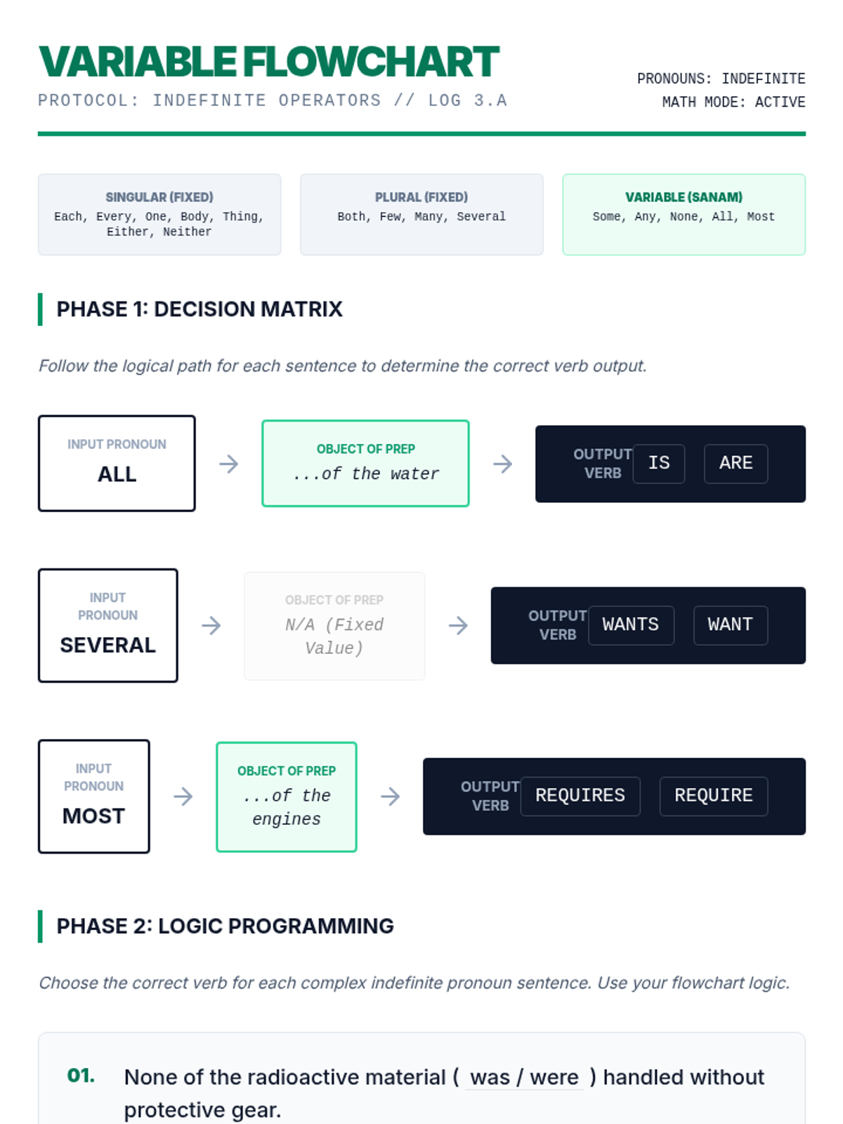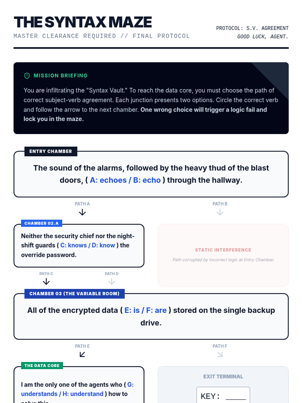 A technical, logic-driven approach to subject-verb agreement for 11th-grade students, treating grammar as a system of equations and logic gates to solve complex sentence structures.