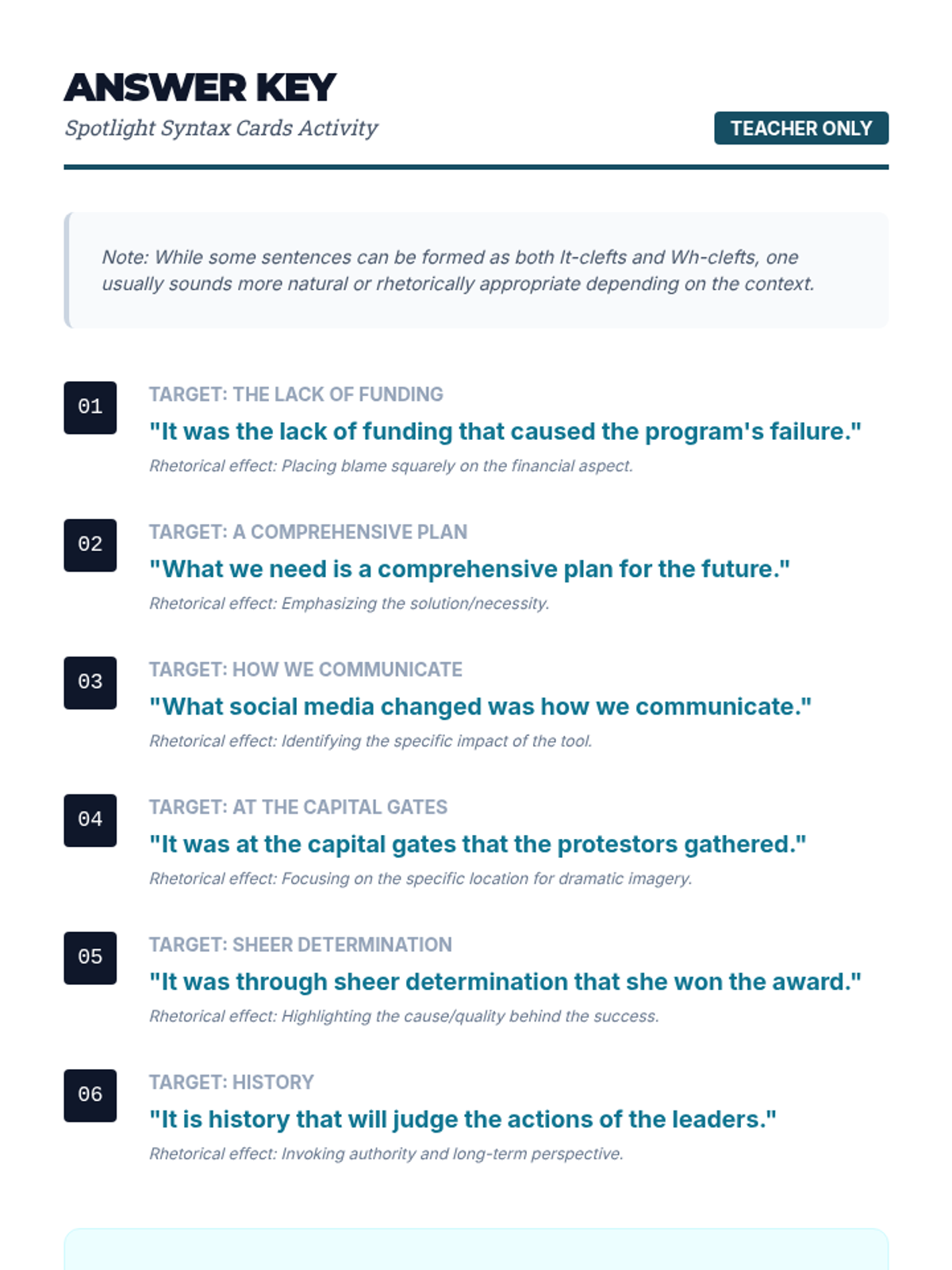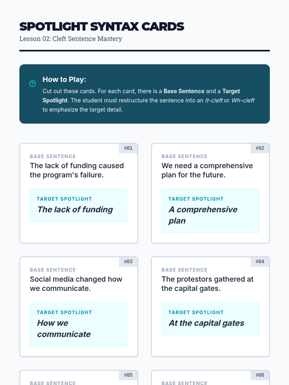 This workshop-style sequence for 10th Grade Advanced English focuses on the rhetorical power of sentence inversion and cleft sentences. Students will transition from standard syntax to sophisticated grammatical structures used in persuasive writing and public speaking.