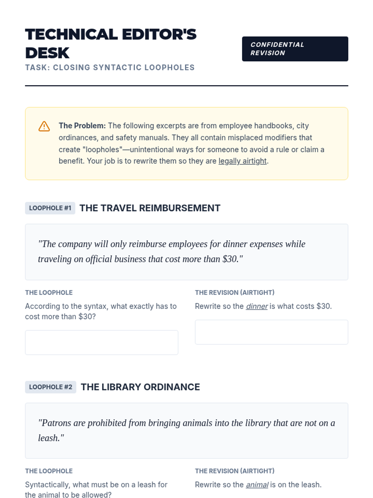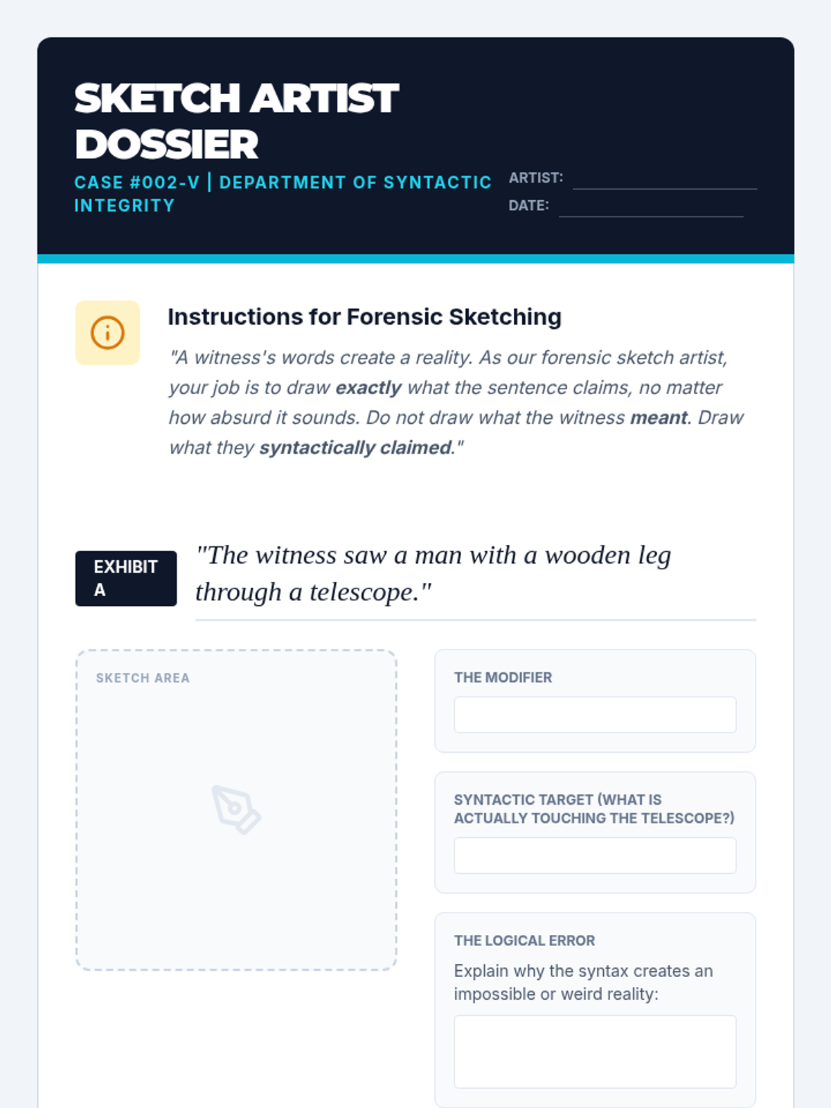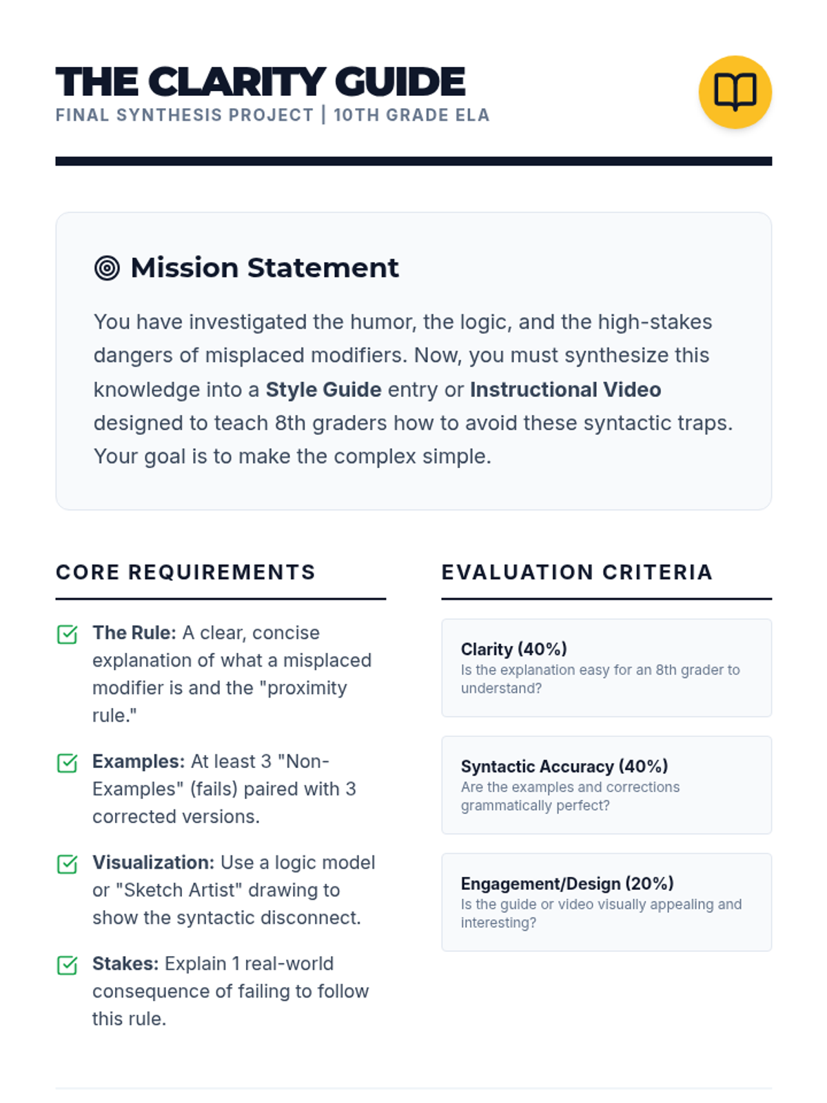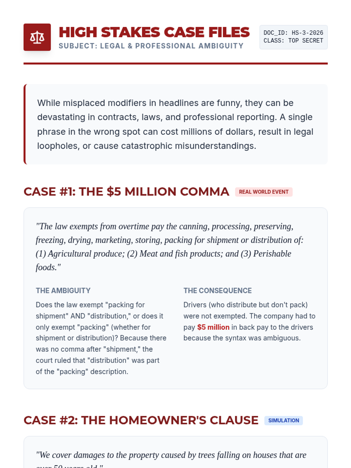 An inquiry-based exploration of misplaced modifiers, moving from humorous viral fails to high-stakes legal ambiguity. Students analyze, visualize, and intentionally manipulate syntax to master the mechanics of clarity.