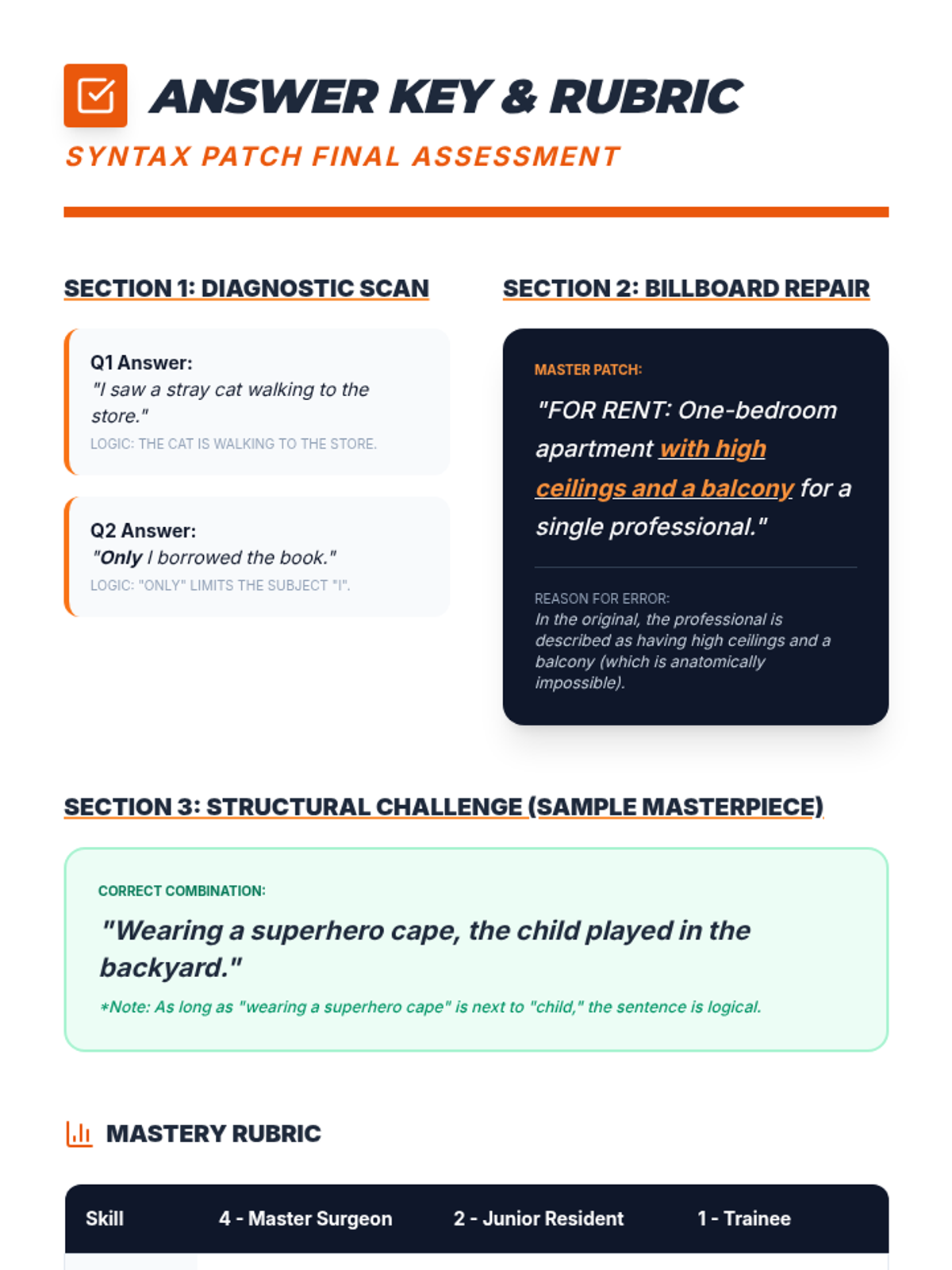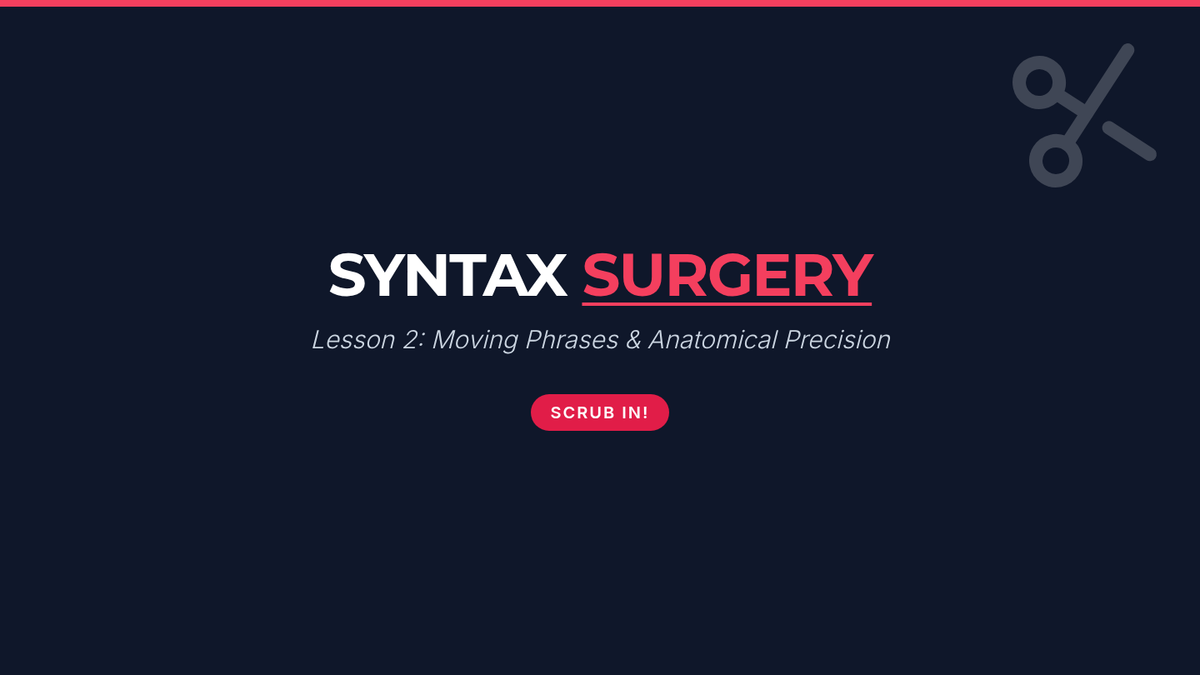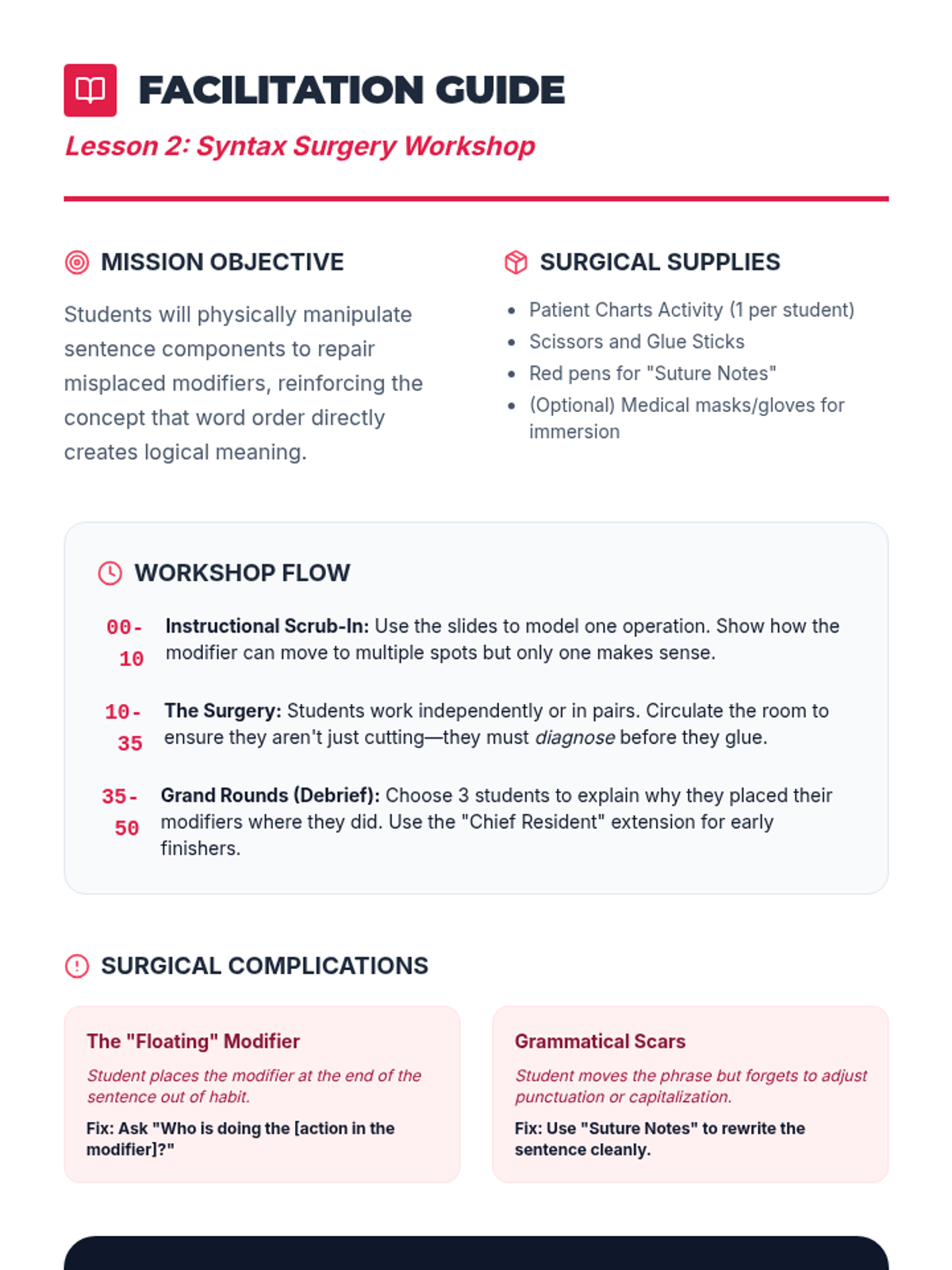 A 7th-grade grammar sequence focusing on misplaced modifiers through a 'Syntax Surgery' theme. Students move from diagnosing structural issues to performing linguistic surgery and constructing complex, clear sentences.