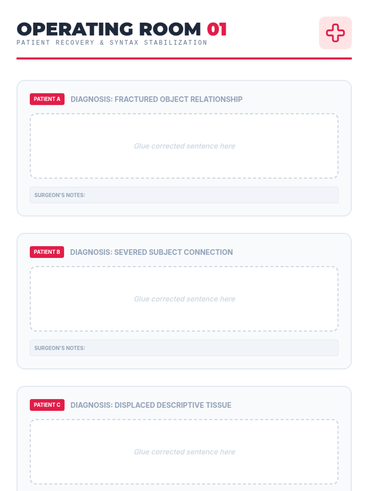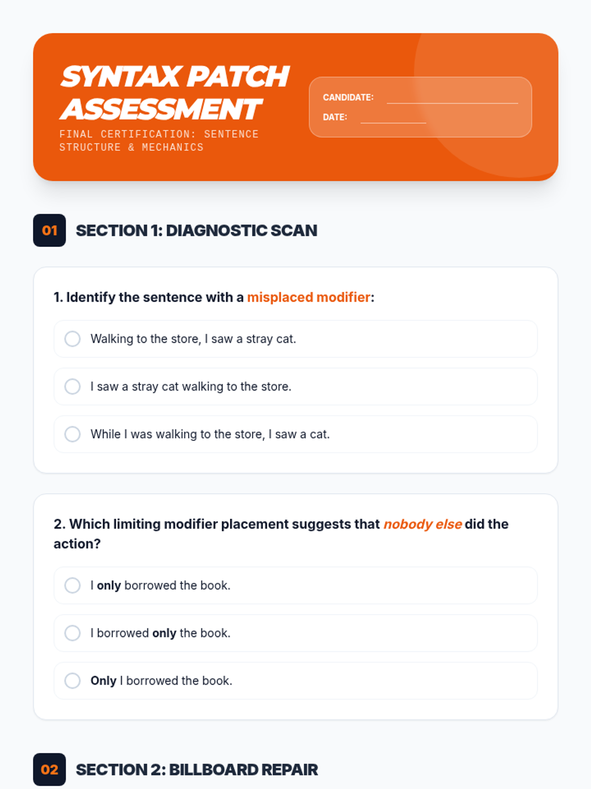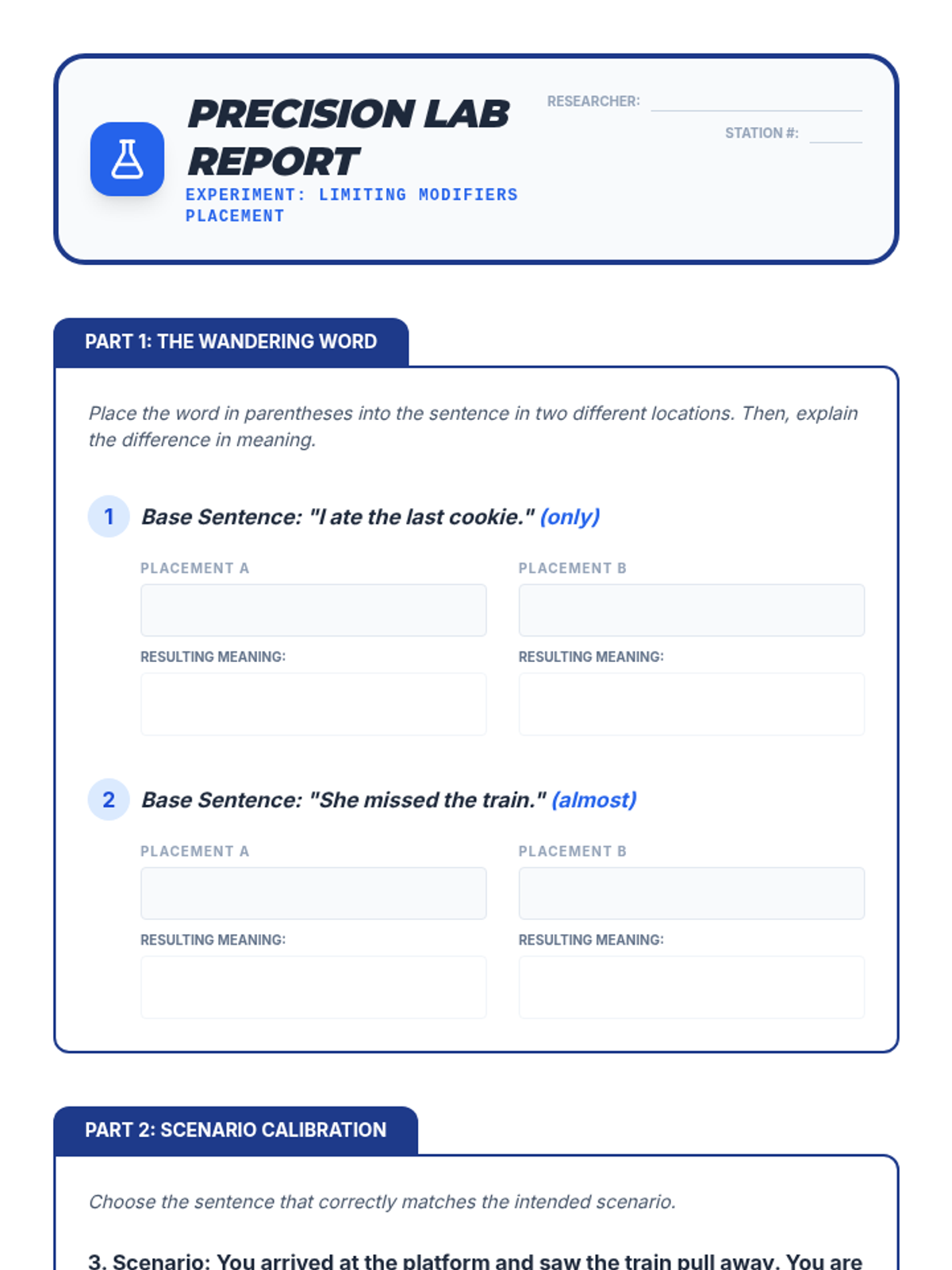 A 7th-grade grammar sequence focusing on misplaced modifiers through a 'Syntax Surgery' theme. Students move from diagnosing structural issues to performing linguistic surgery and constructing complex, clear sentences.