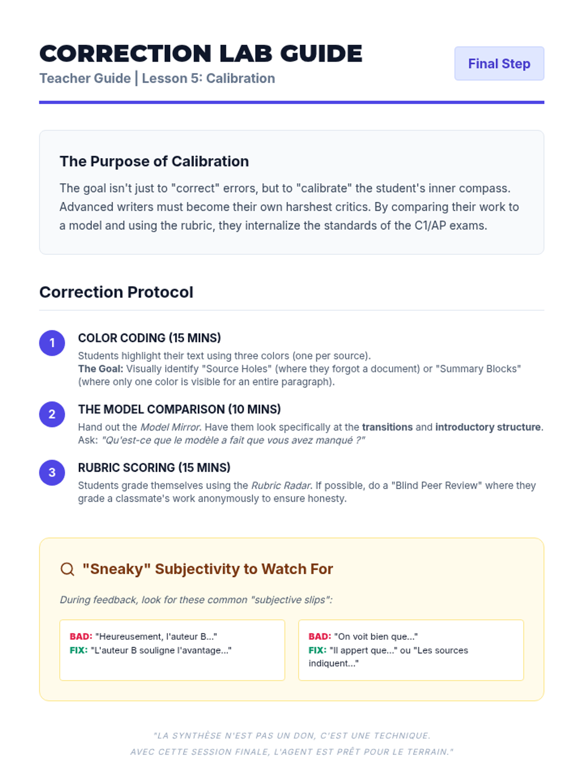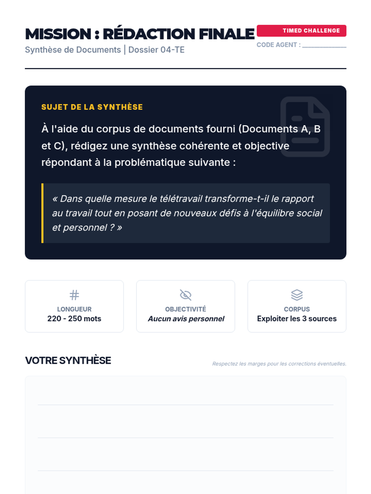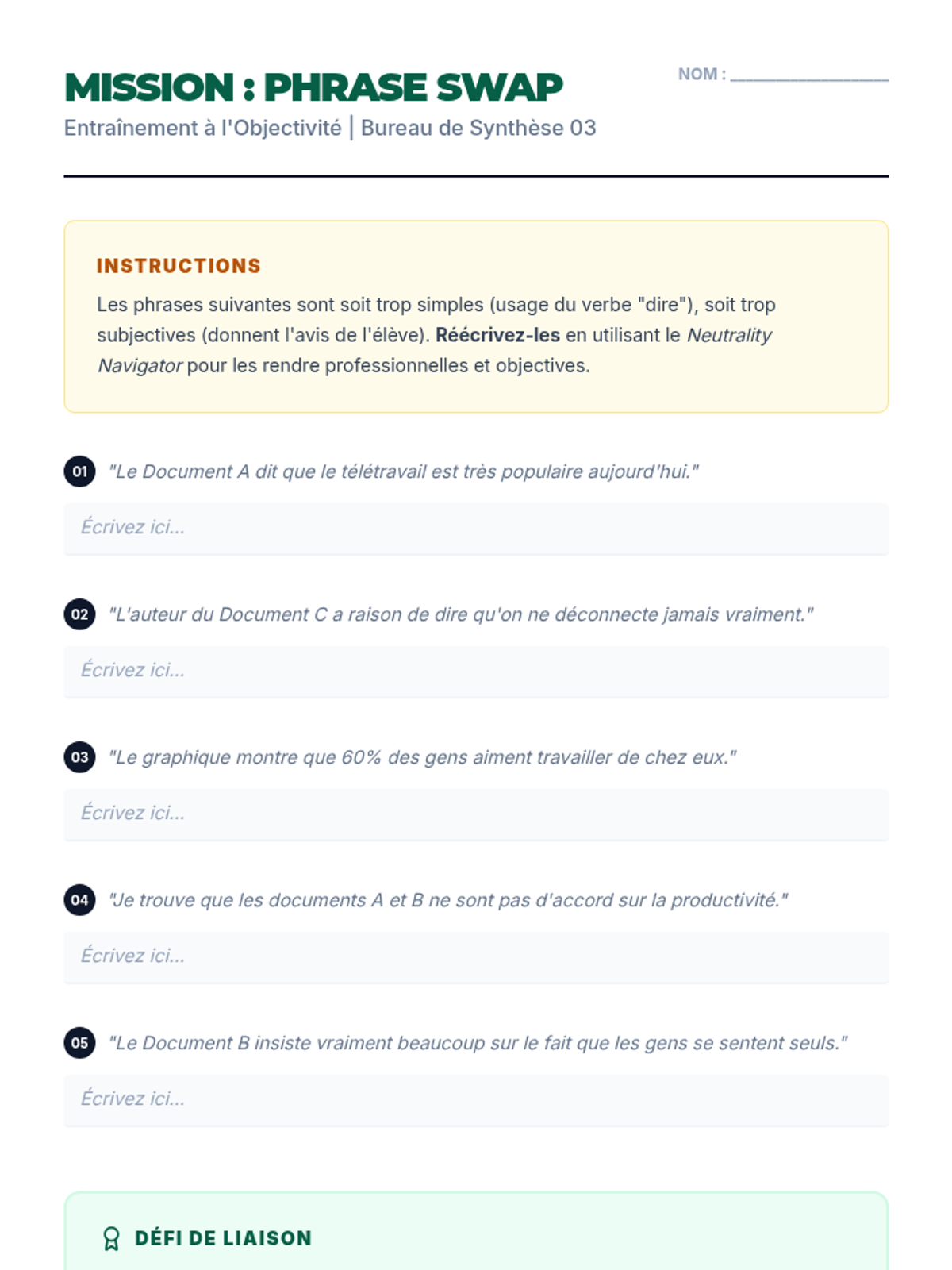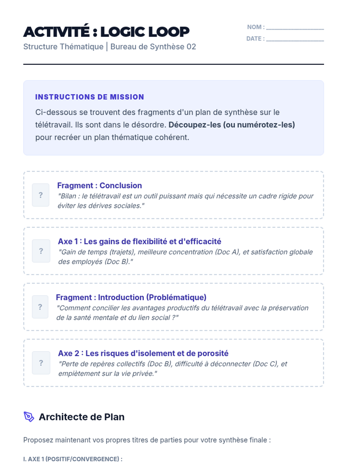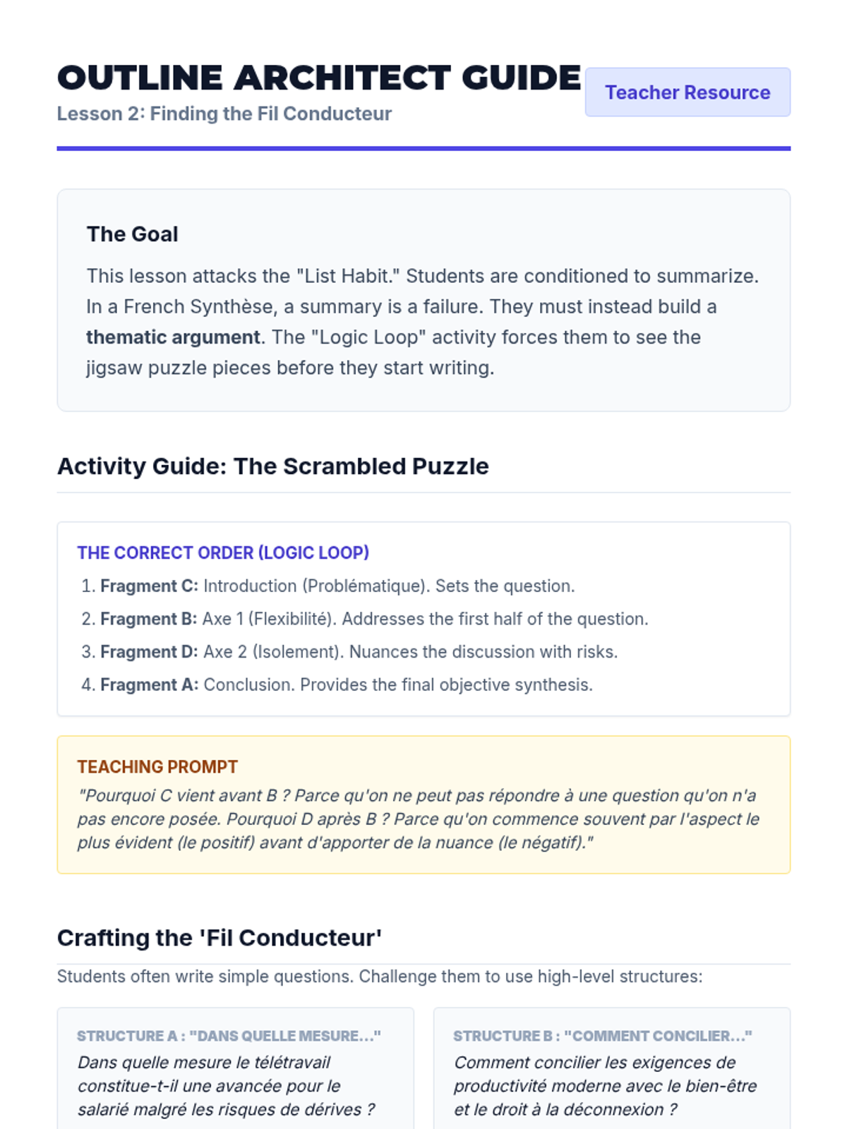A comprehensive unit for advanced French students focused on the art of the 'Synthèse'. Students develop the analytical and writing skills necessary to integrate multiple perspectives into a single, objective narrative, preparing them for high-level examinations like DELF B2/C1 and AP French.
