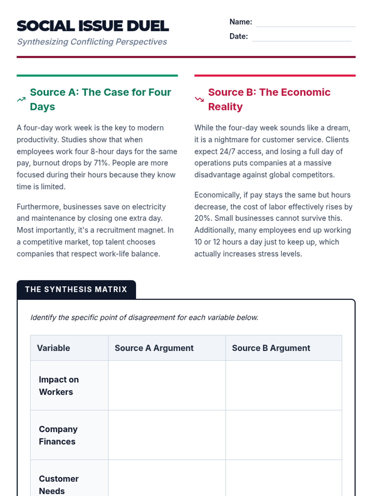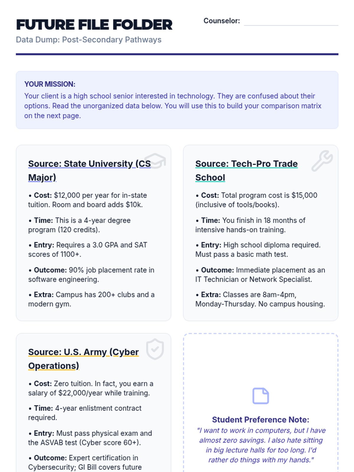 A higher-education and career-readiness sequence for 12th-grade students focused on using matrices to synthesize complex, conflicting, and multi-variable information. Students move from basic data organization to high-level comparative analysis and source evaluation.